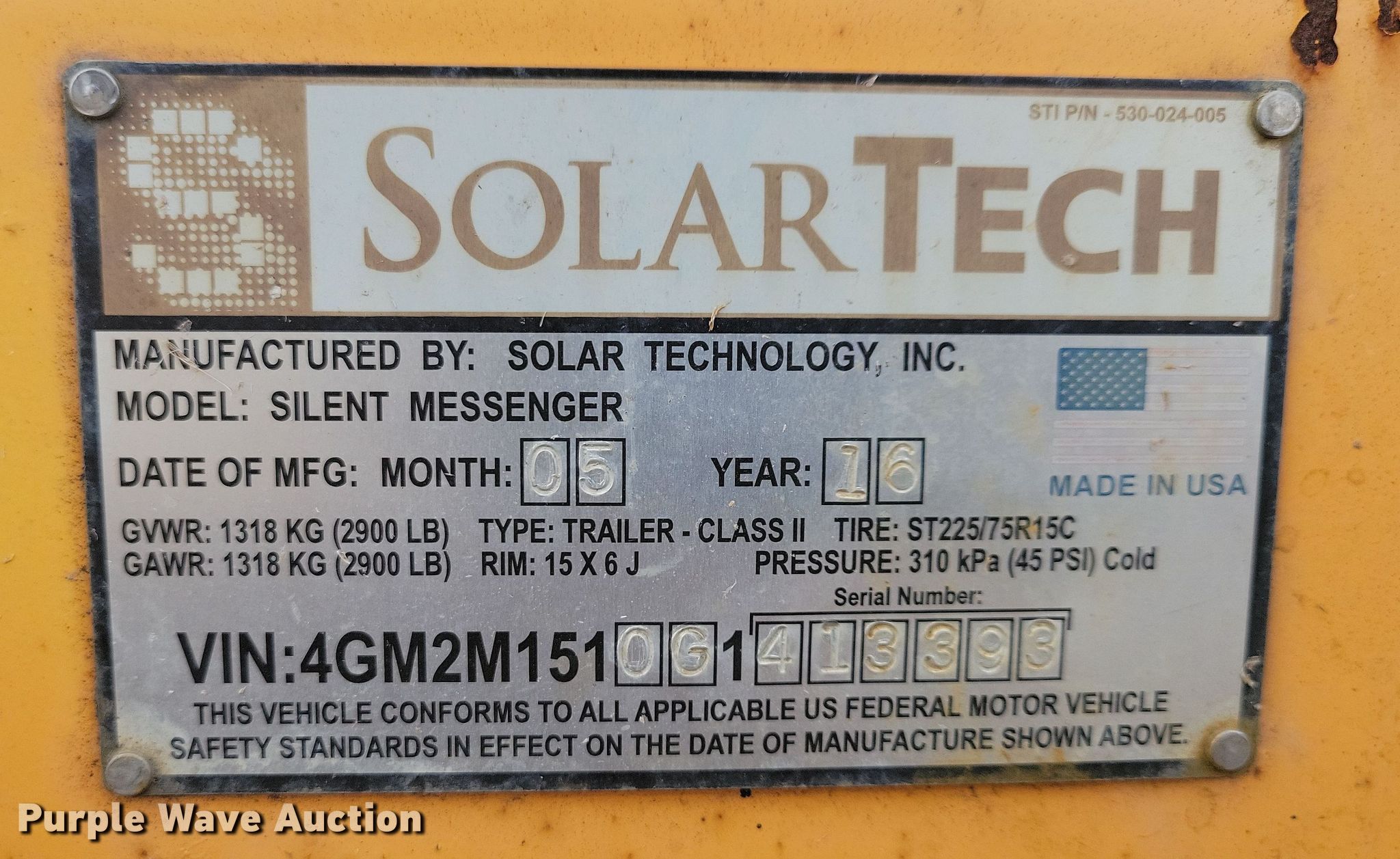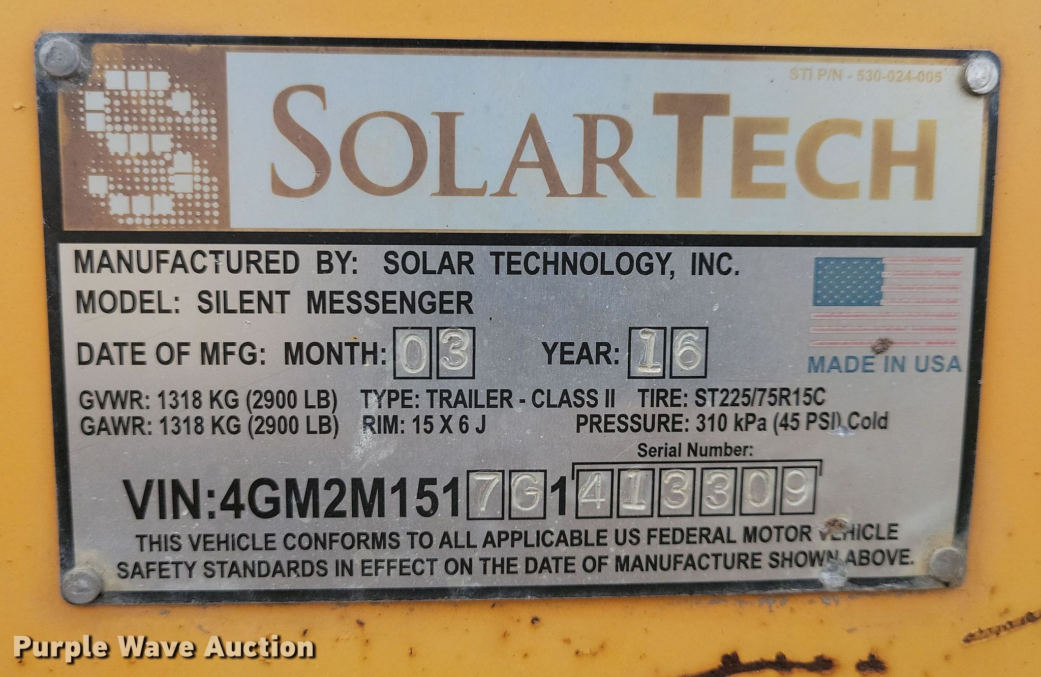 (2) 2016 Solar Tech message board trailers. VIN: 4GM2M1510G1413393, 4GM2M1517G1413309. Dimensions Overall: 15' 6" L x 86" W. Features Solar panel, GPS. Chassis Ball hitch: 2", Landing gear: Dual, GVWR: 2,900 lbs, GAWR: 2,900 lbs. Tires Steel wheels, Size: ST225/75R15. This is worksite support equipment and will not come with a title. Transfer of ownership documentation will be a bill of sale. Sir Lines-A-Lot. Harrisburg, SD 57032