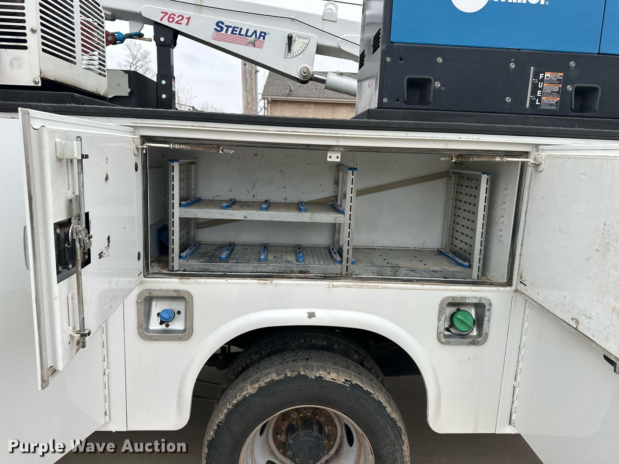 2017 Ford F550 Super Duty utility / service truck. Miles: 245,806 on odometer, VIN: 1FD0X5HT1HEE07763. Engine Displacement: 6.7L, Cylinders: 8, Fuel type: Diesel. Transmission Automatic. Chassis Four wheel drive, Axles: Single, Suspension: Spring, Brakes: Hydraulic, PTO. Interior AC, Heat, Power windows, Power locks, Cruise control, Auxiliary controls. Features Bed Knapheide, 11' L x 96" W, Welder/generator Miller Bobcat 250, Hours: 2,087 on meter, Fuel type: Gas, 240V outlets: 1, 120V outlets: 4, Watts: 11,000, Welder type: Stick (AC/DC), Air compressor, Crane Stellar 7621, Maximum boom length: 21' Maximum lift capacity: 7,500 lbs.. Tires Size: 225/70R19.5. Notes Engine issues, oil leak , Coolant leak. Kansas title. Title distribution may be delayed up to 14 days from verification of funds. Heritage Tractor. Lawrence, KS 66046
