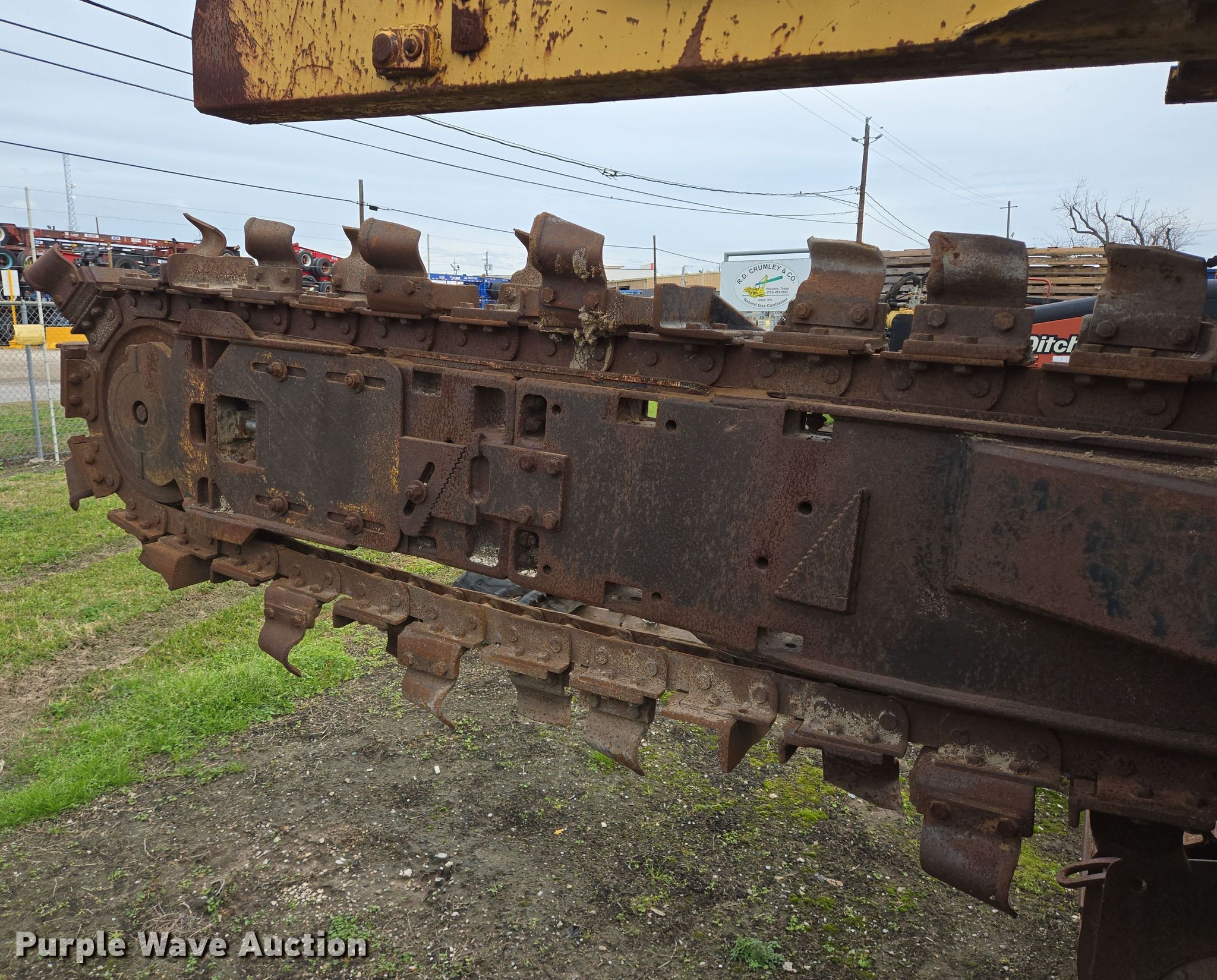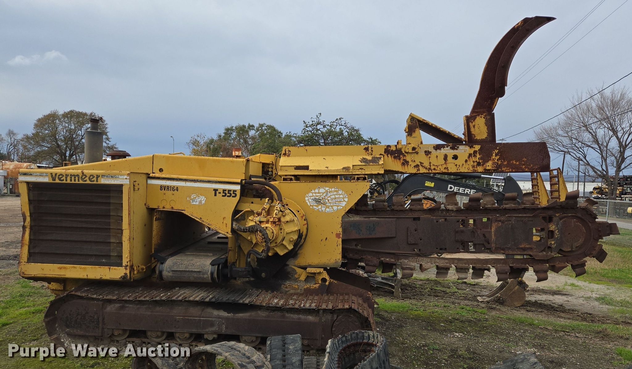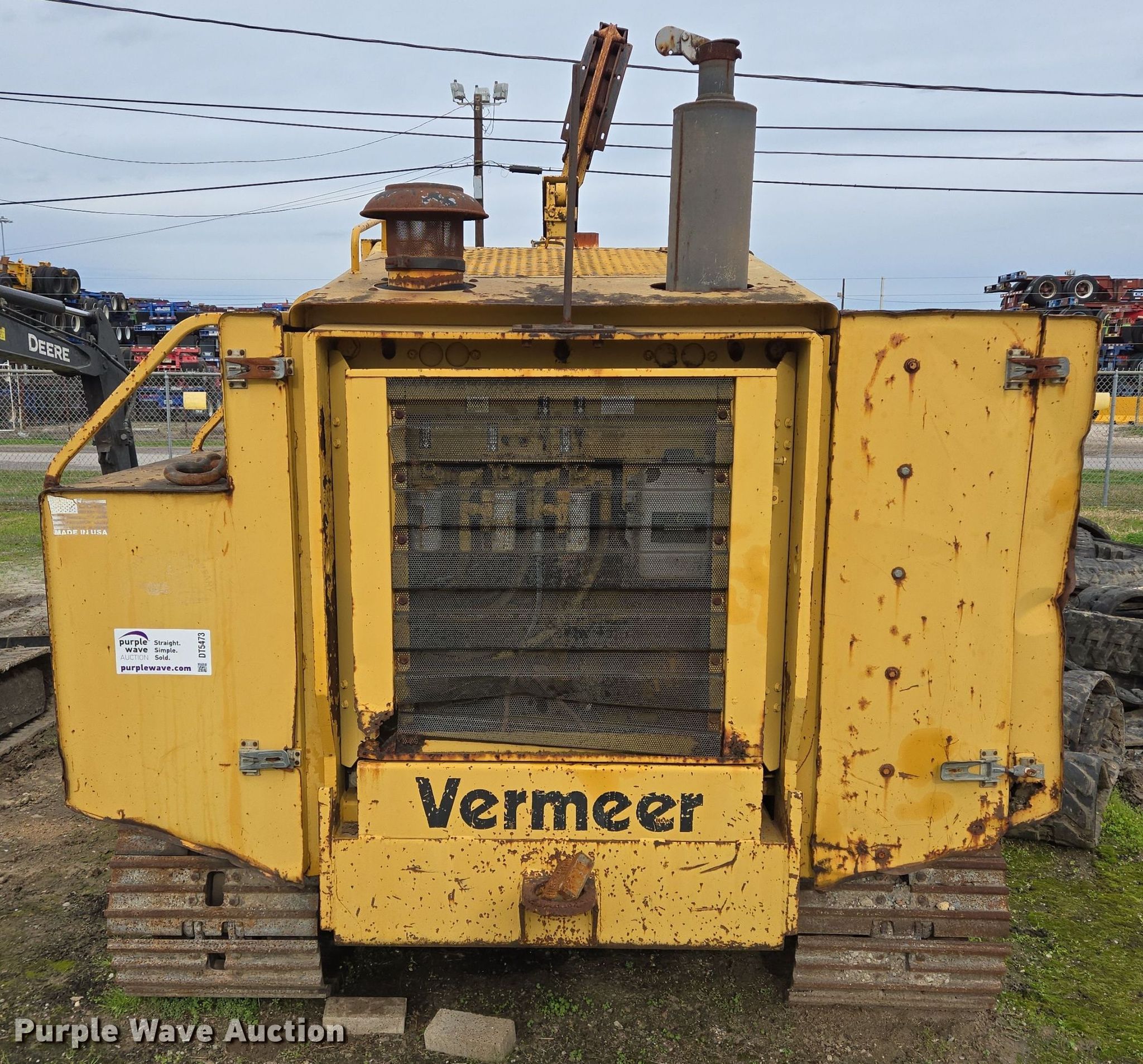 1993 Vermeer T555TR trencher. Hours: Unknown, Serial: 1VRE12083P1000163. Engine Cylinders: 6, Fuel type: Diesel. Transmission Hydrostatic. Features Trencher Estimated dig depth: 72", Teeth: Dirt, Crumber, Conveyor Width: 18", Length: 84". Tracks Width: 19", Steel. Notes Non-operational tracks. R.D. Crumley & Company. Houston, TX 77015