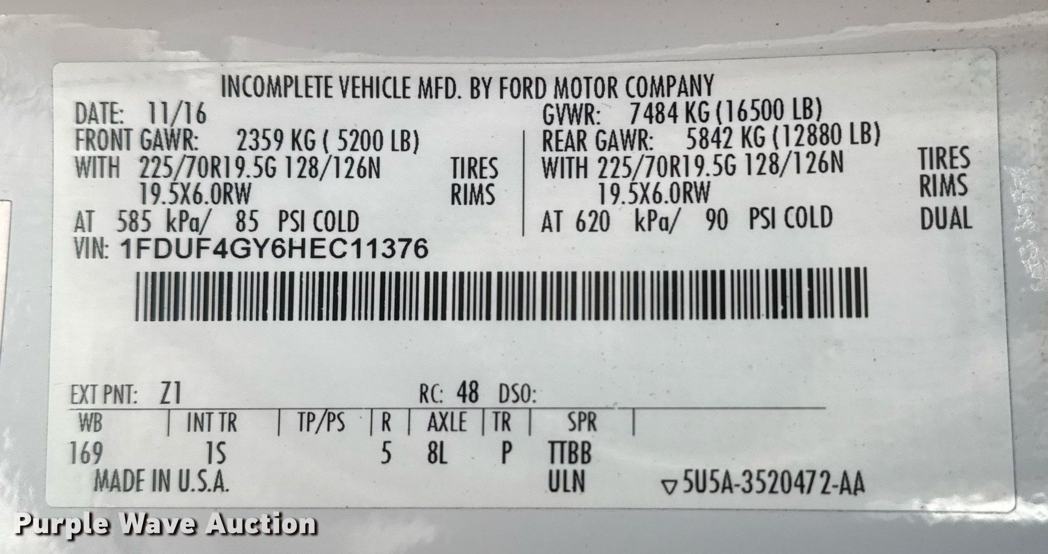 2017 Ford F450 Super Duty utility / service truck. Miles: 177,010 on odometer, VIN: 1FDUF4GY6HEC11376. Engine Displacement: 6.8L, Cylinders: 10, Fuel type: Gas. Transmission Automatic. Chassis Axles: Single, Suspension: Spring, Brakes: Hydraulic. Interior AC, Heat, Heated mirrors, Power locks, Cruise control, Auxiliary controls, Brake controller. Tires Size: 225/70R19.5. Oklahoma title. Seller is an Oklahoma licensed motor vehicle dealer. Title will be assigned and distributed by the dealer. Please contact the seller for distribution questions. Title distribution may be delayed up to 30 days from verification of funds. Collinsville, OK 74021