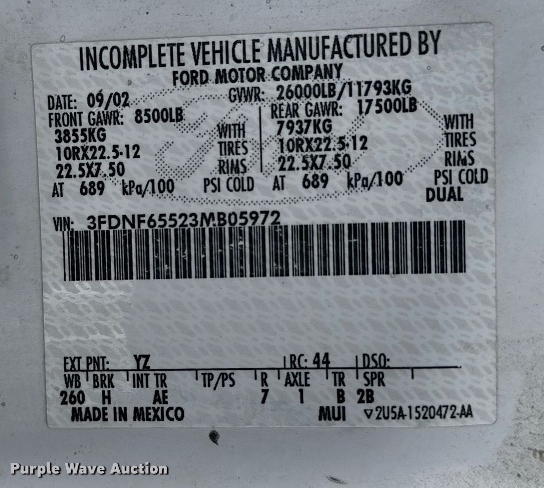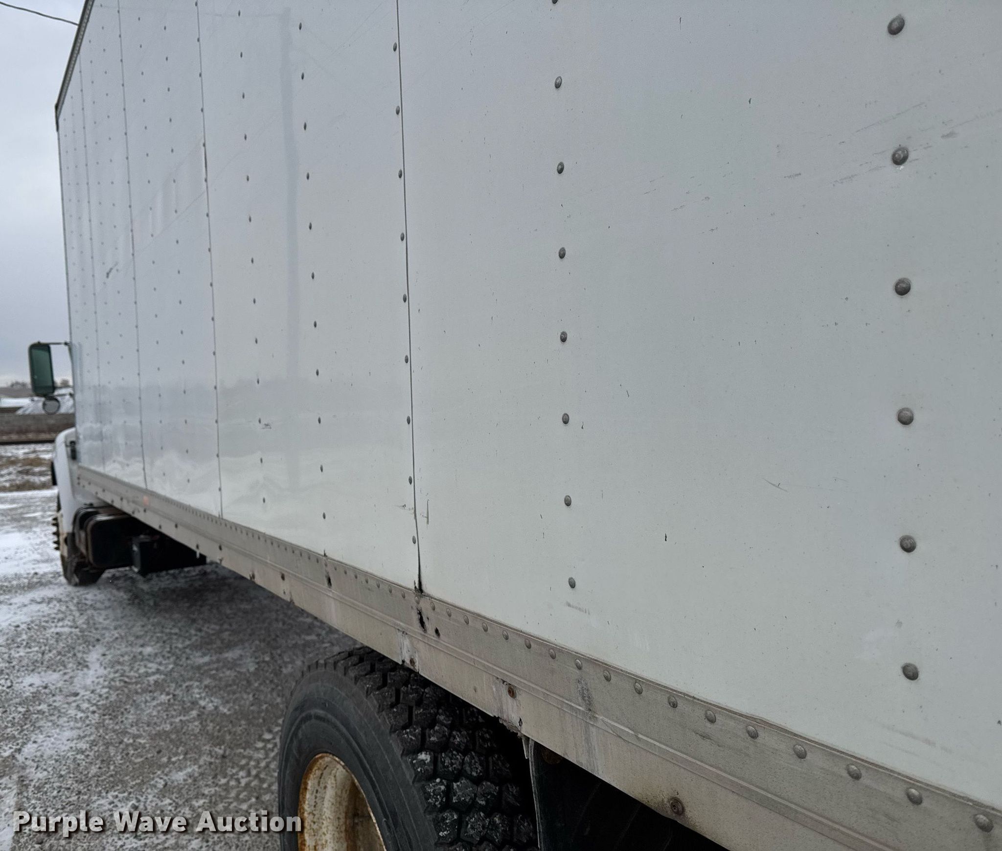 2003 Ford F650 Super Duty box truck. Miles: 104,498 on odometer, VIN: 3FDNF65523MB05972. Engine International 444P, Displacement: 7.3L, Cylinders: 8, Fuel type: Diesel. Transmission Automatic. Chassis Axles: Single, Suspension: Spring, Brakes: Hydraulic, GVWR: 26,000 lbs. Interior AC, Heat, Cruise control. Features Box bed Freight star FS-24M, Serial: 535539, 26' L x 96" W x 108" H, Floor: Wood, End gate lift, Capacity: 3,500 lbs. Tires Size: 10R22.5. Iowa title. Title distribution may be delayed up to 14 days from verification of funds. Minturn, Inc.. Brooklyn, IA 52211