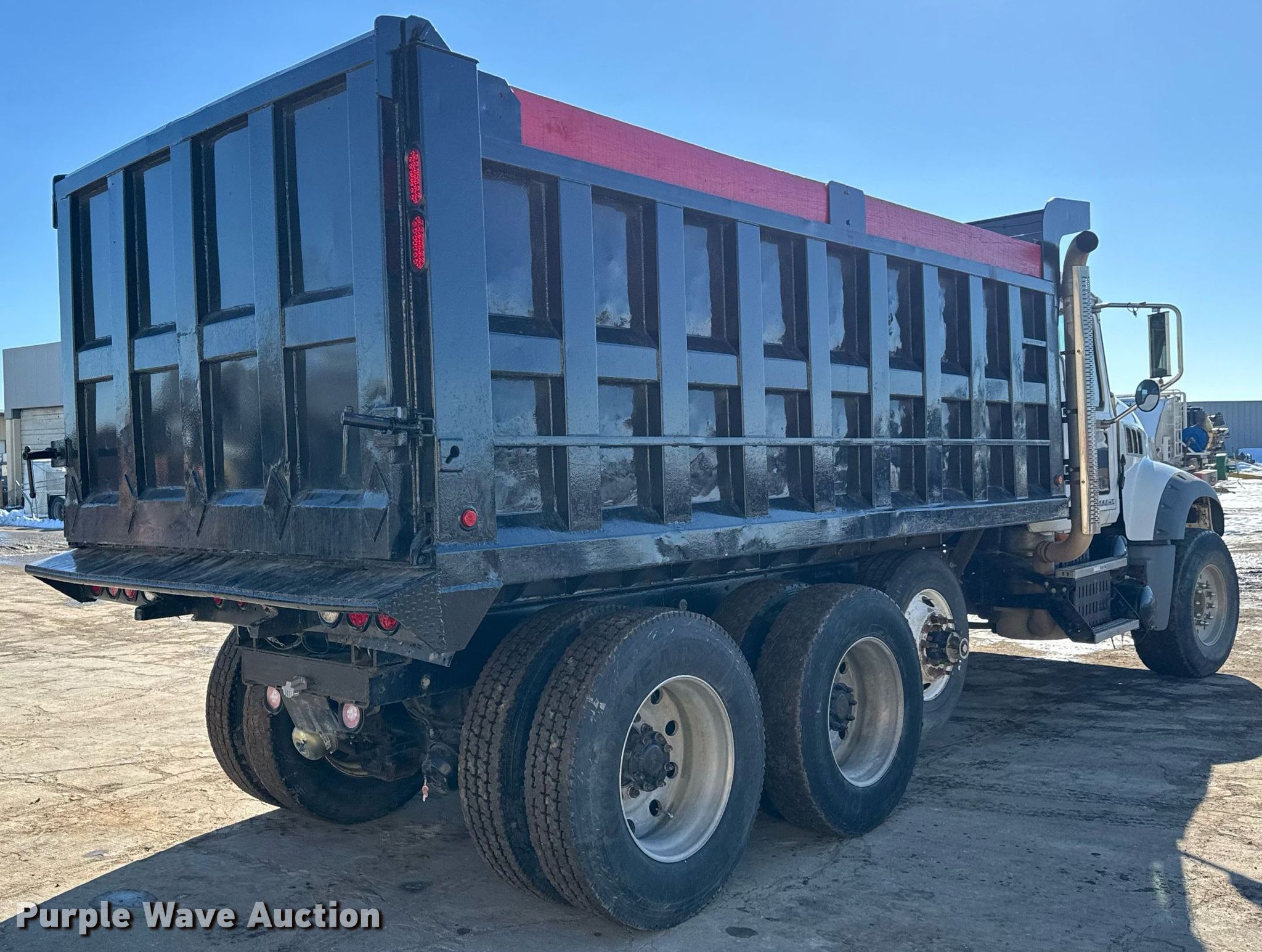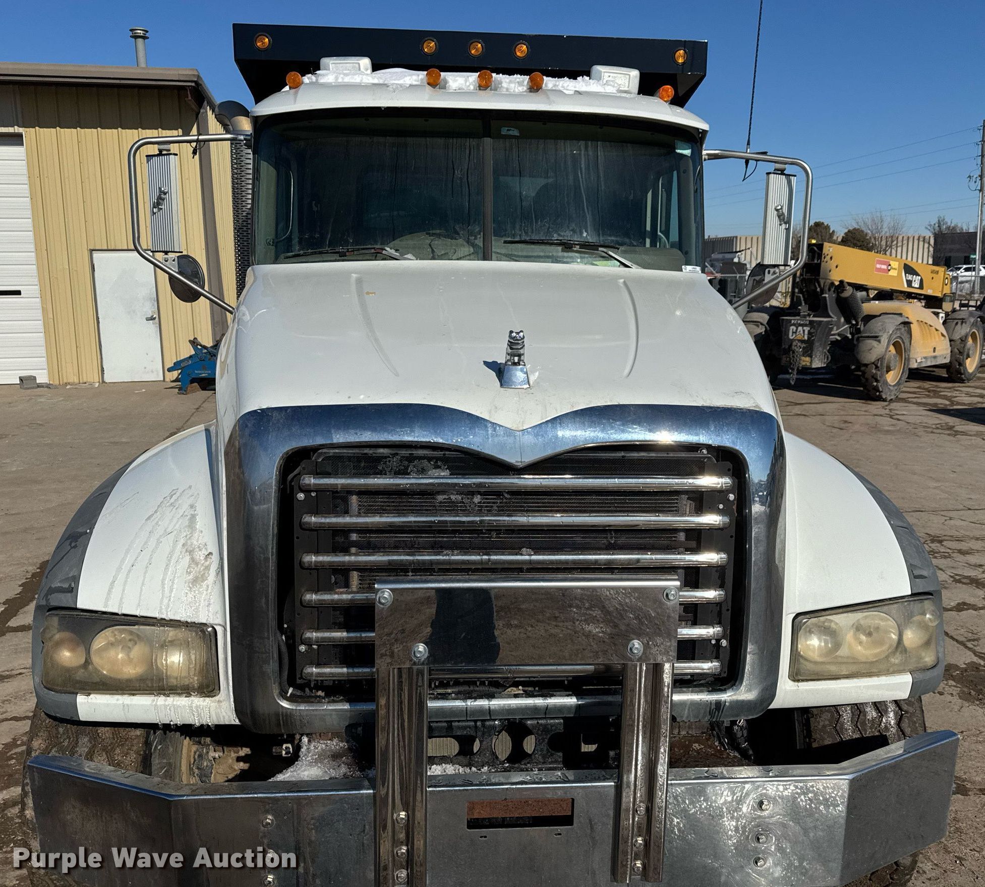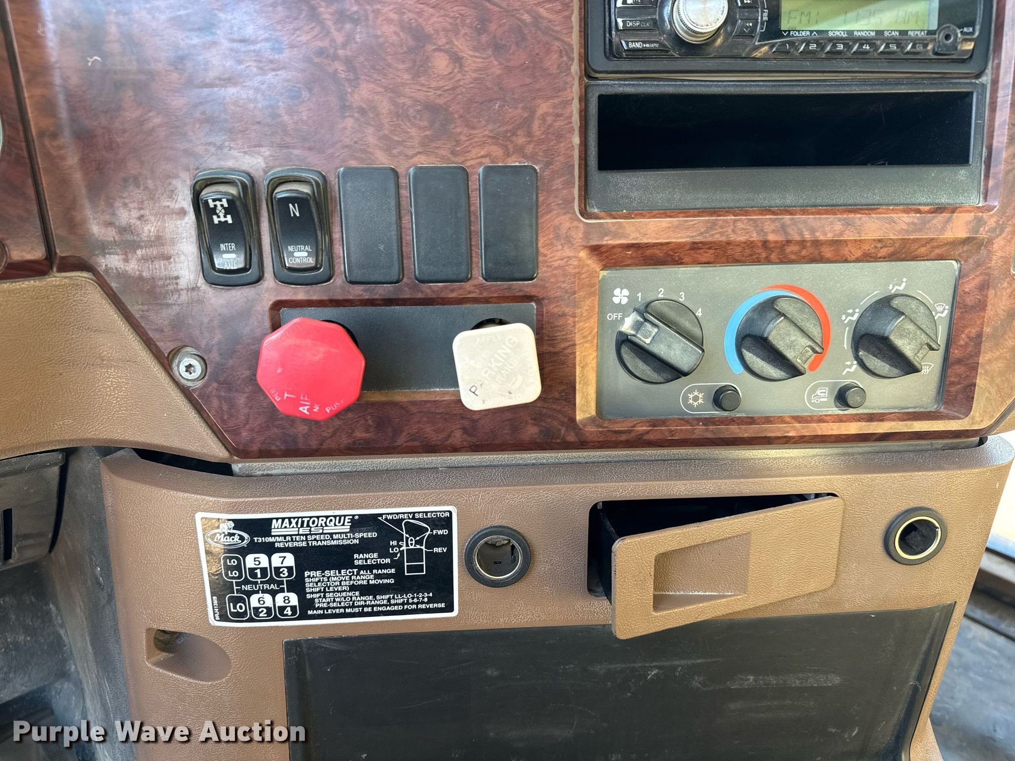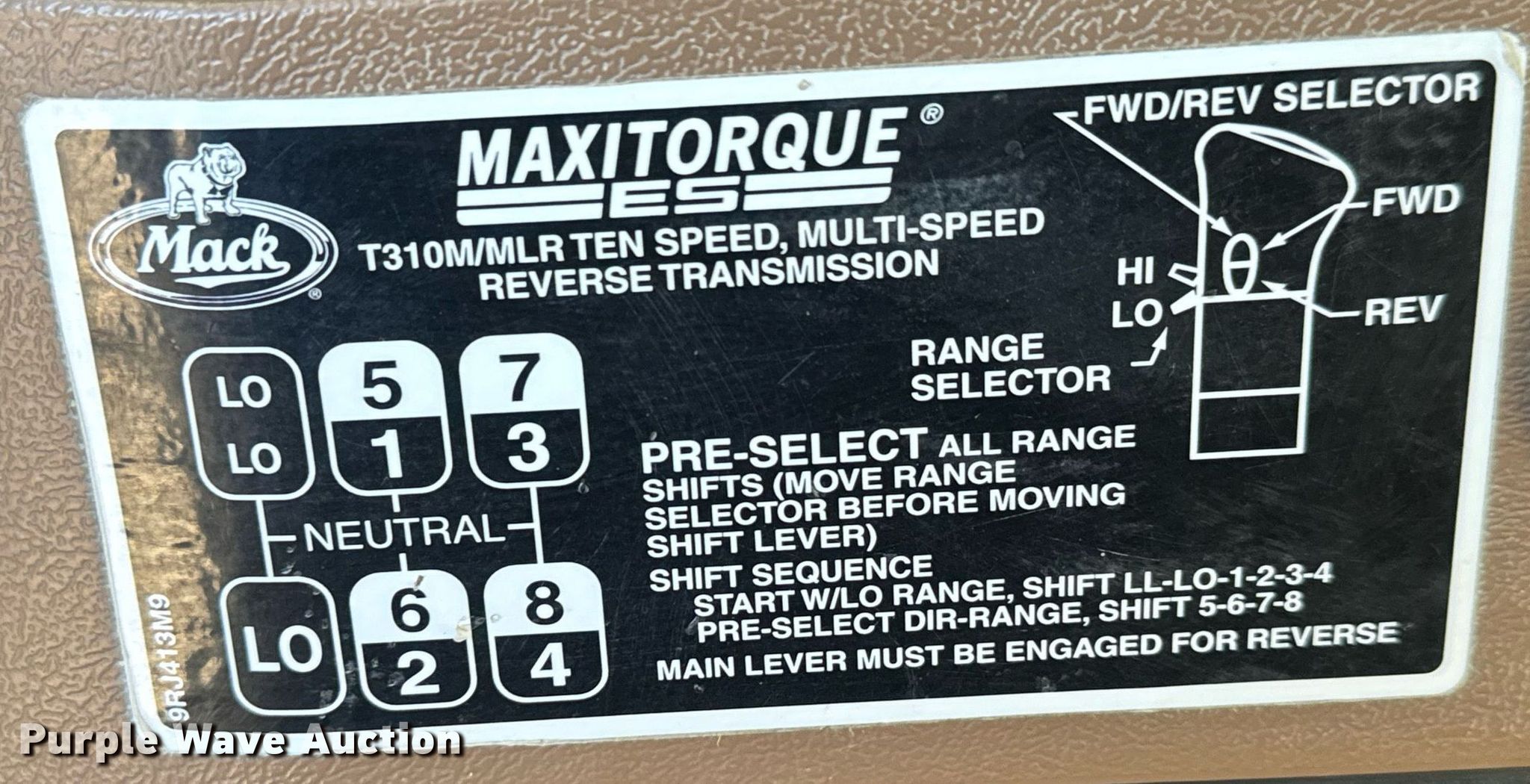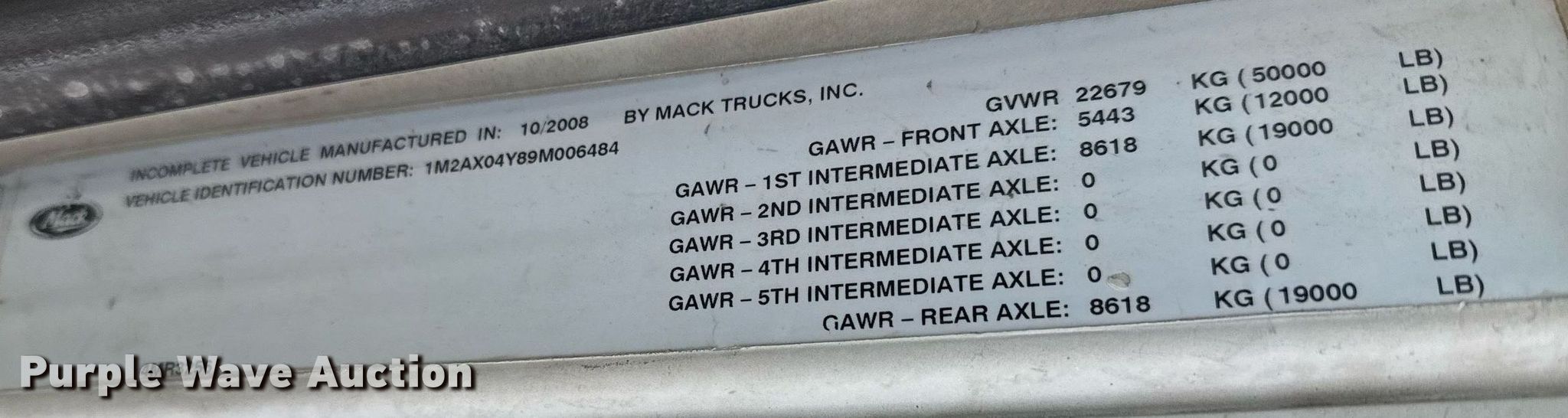 2009 Mack GU713 dump truck. Miles: 393,999 on odometer, Hours: 2,221 on meter, VIN: 1M2AX04Y89M006484. Engine Mack, Displacement: 10.8L, Cylinders: 6, Fuel type: Diesel. Transmission Mack Maxitorque, Manual, Speed: 10. Chassis Axles: Triple, Pusher axle, Differential lock: Inter-axle, Suspension: Camelback, Brakes: Air, PTO, GVWR: 50,000 lbs, FAWR: 12,000 lbs, IAWR: 19,000 lbs, RAWR: 19,000 lbs. Interior AC, Heat, Cruise control. Features Dump bed 15' 6" L x 96" W, Side height: 50", Side board height: 8", Bed type: Steel, Ram: Single, End gate: Air operated. Tires Front: 425/65R22.5, Rear: 11R24.5, Lift axle: 295/75R22.5. Kansas title. Title distribution may be delayed up to 30 days from verification of funds. Dondlinger & Sons Construction. Wichita, KS 67217