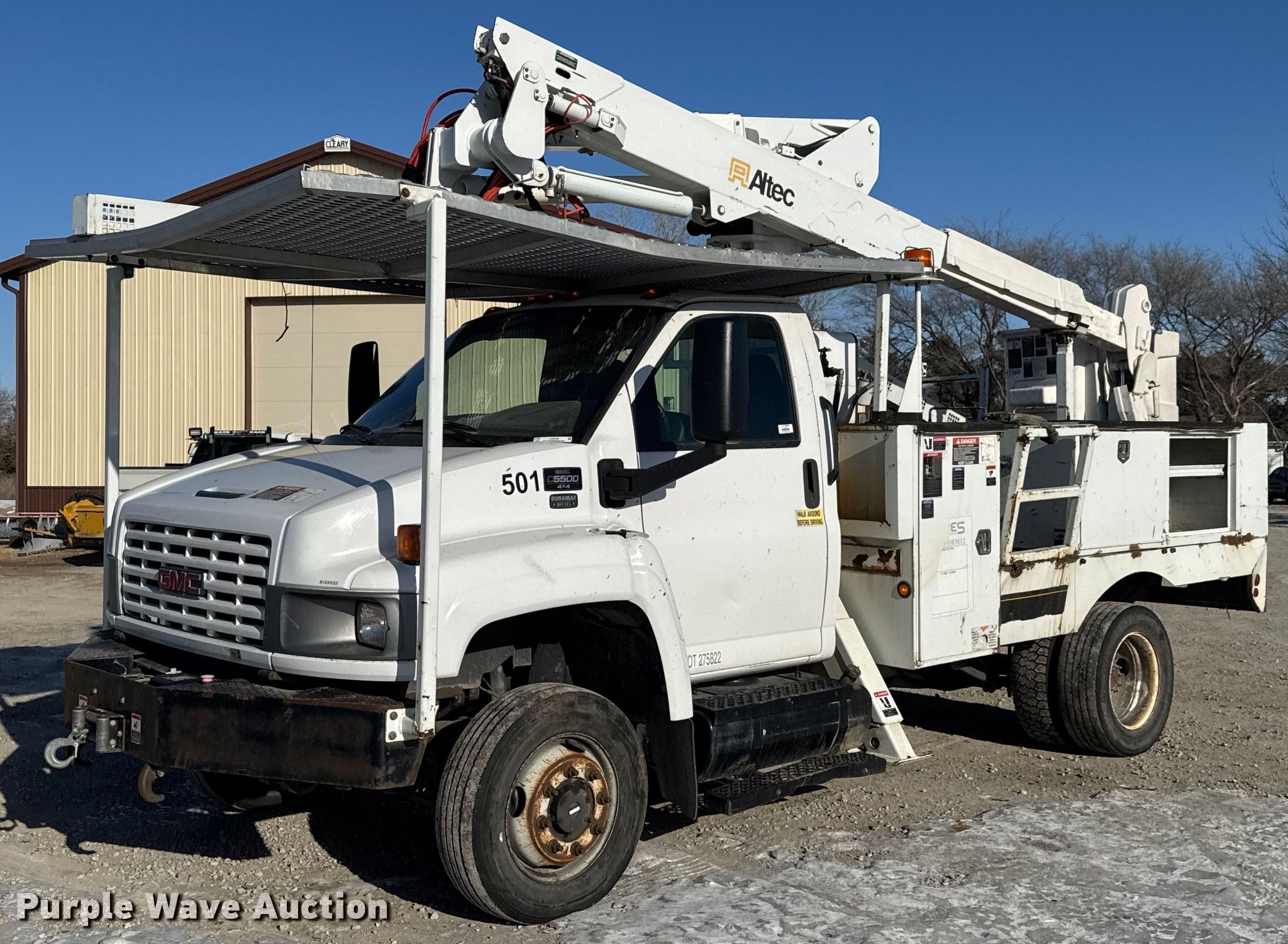 2007 GMC C5500 bucket truck. Miles: 196,288 on odometer, VIN: 1GDE5C32X7F417036. Engine Displacement: 6.6L, Cylinders: 8, Fuel type: Diesel. Transmission Automatic. Chassis Four wheel drive, Axles: Single, Suspension: Spring, Brakes: Hydraulic, PTO. Interior AC, Heat, Cruise control. Features Bed Altec, Serial: 6188535, 11' 5" L x 93" W, Boom Altec AT37G, Serial: 1006DE7621, Boom type: Articulating, Insulated, Telescopic, Man basket, Boom controls Ground, Platform/ basket.. Tires Size: 245/70R19.5. Notes Dash warning indicator: Check engine, ABS, Utility bed door issues. Kansas title. Title distribution may be delayed up to 14 days from verification of funds. Witchita Tree Service. Wichita, KS 67226