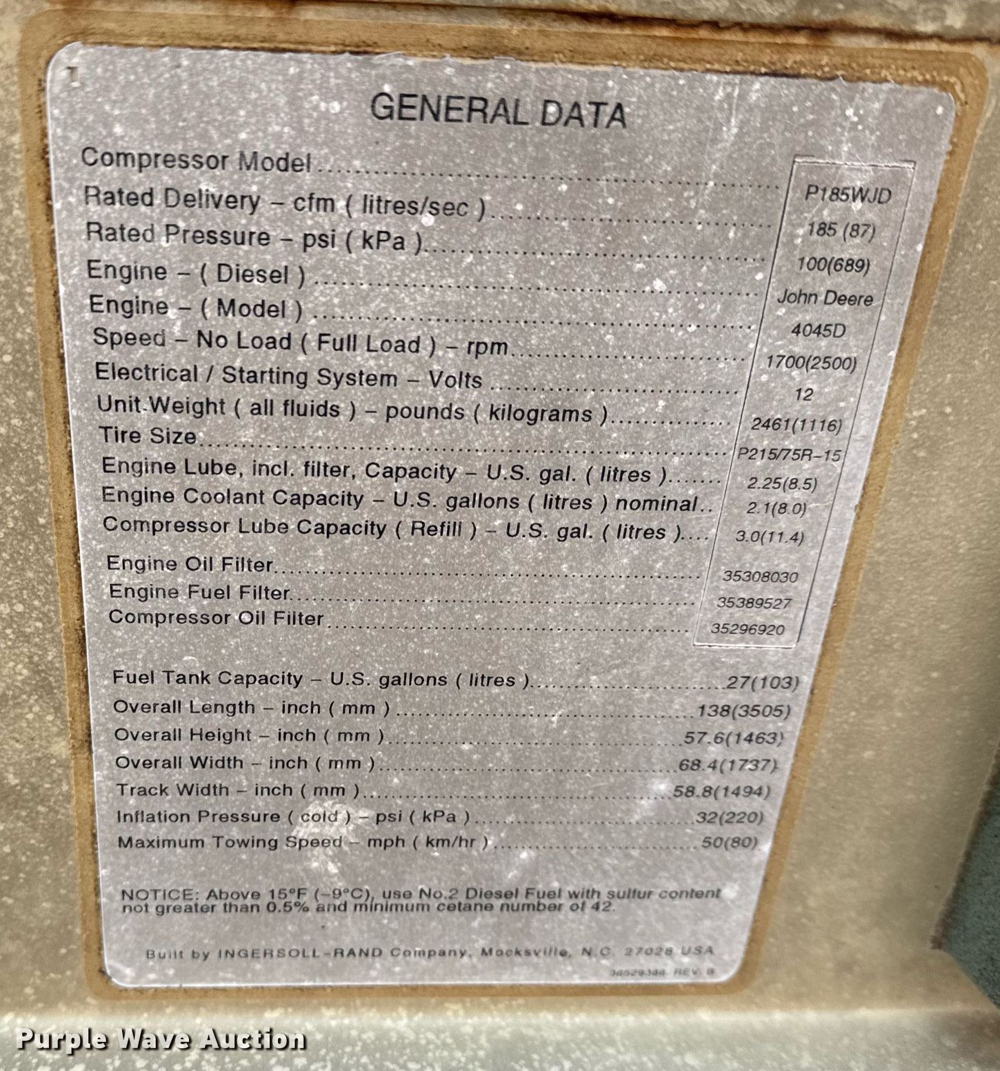 1997 Ingersoll-Rand XP185WJD air compressor. Hours: 303 on meter, Serial: 278192UFH222. Engine John Deere 4045DF150, Serial: CD4045D505055, Cylinders: 4, Fuel type: Diesel. Features Air compressor CFM: 185. Trailer 12' L x 69" W, Suspension: Torsion, Axles: Single, Tire size: 225/75D15, Hitch: Pintle. This is worksite support equipment and will not come with a title. Transfer of ownership documentation will be a bill of sale. Okie Construction & Welding. Clinton, OK 73601