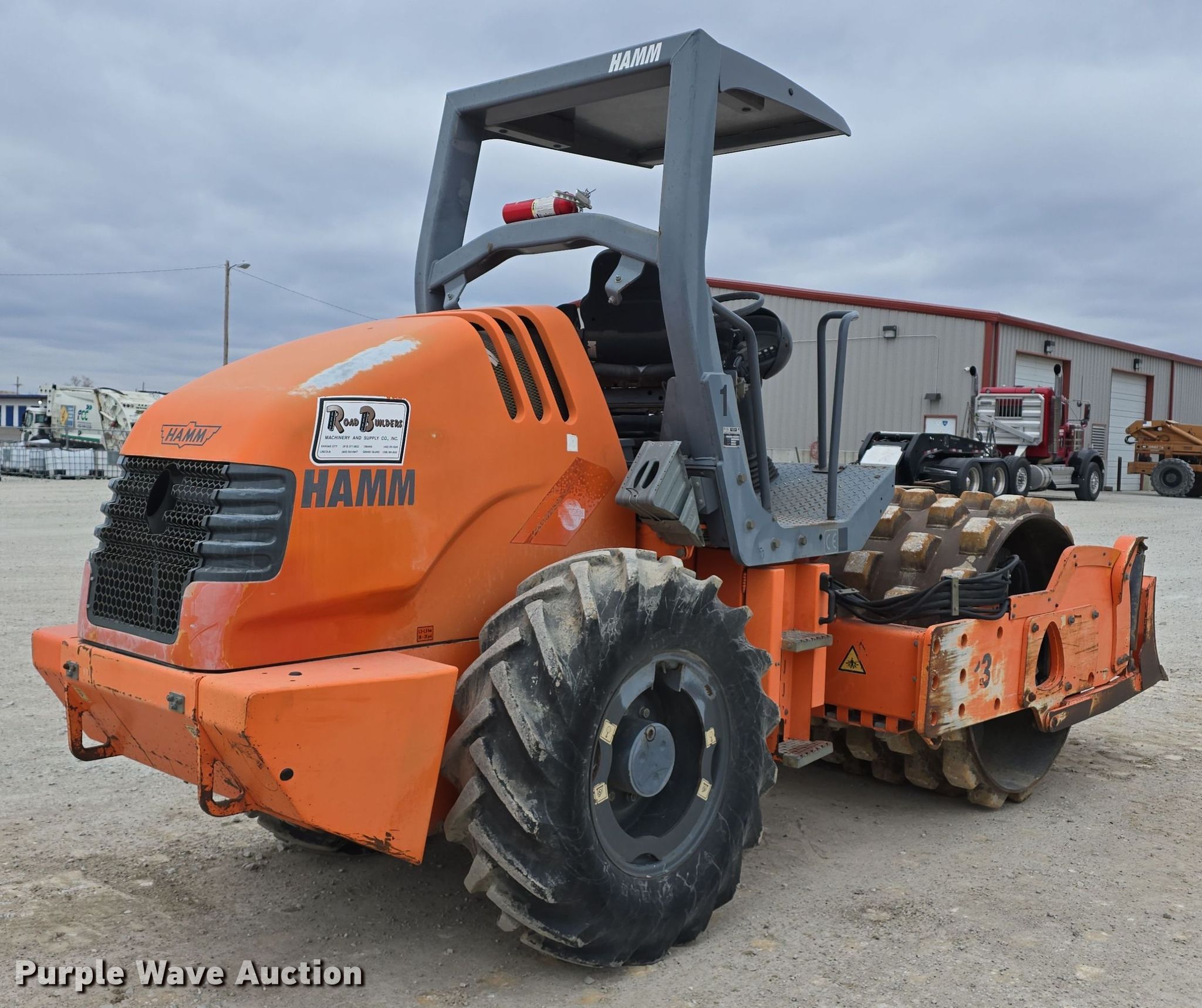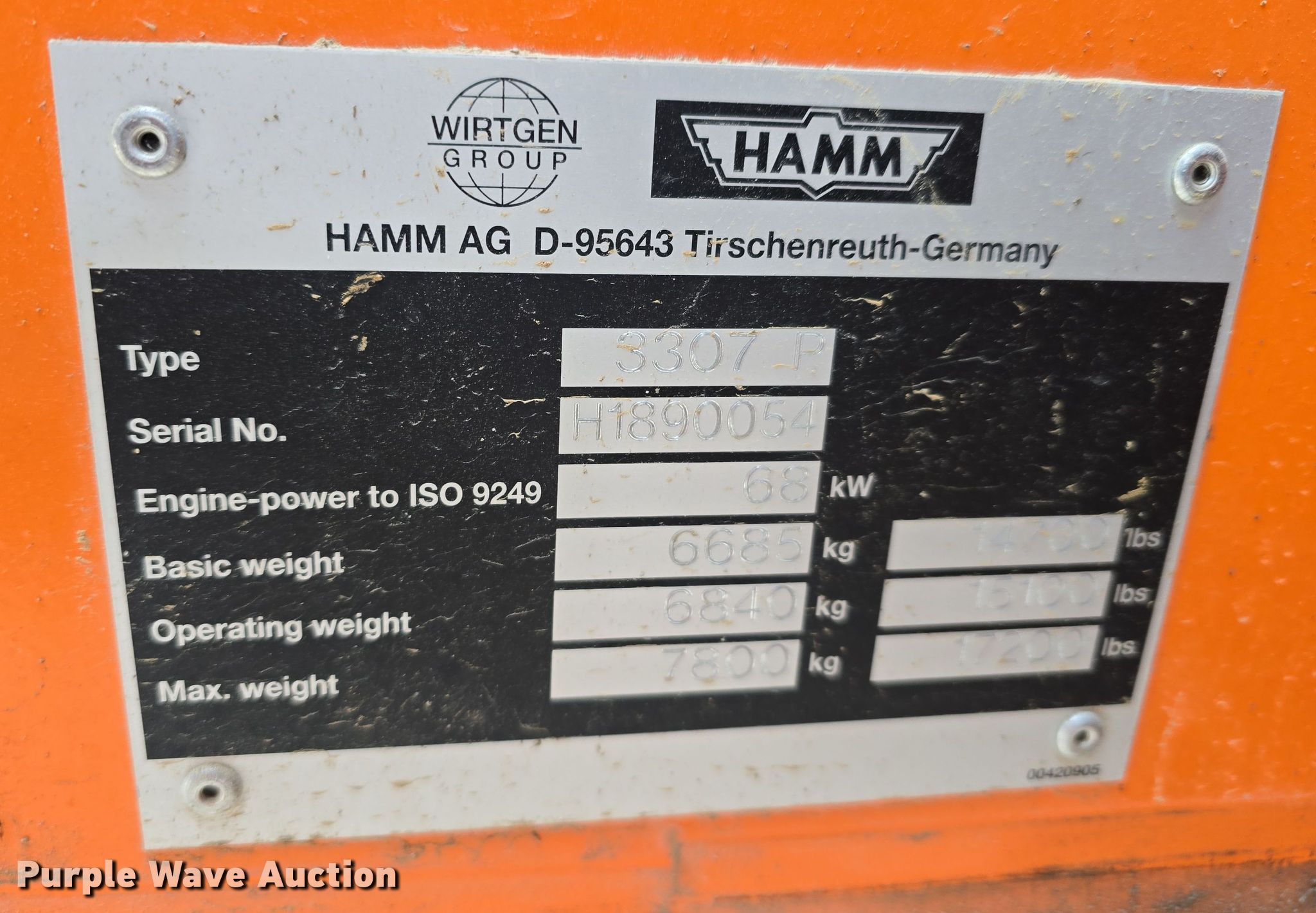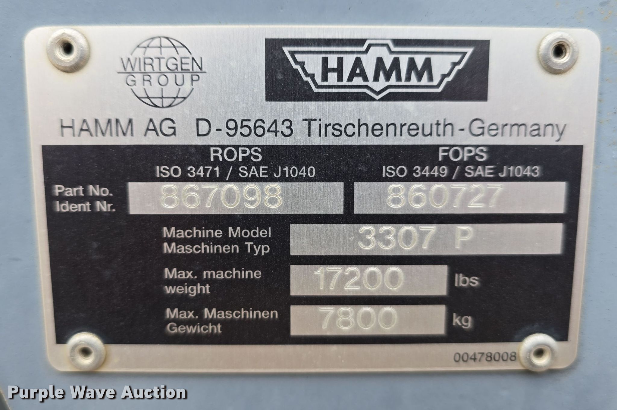 Hamm 3307P single drum roller. Hours: 28 on meter Actual hours unknown, Serial: H1890054. Engine Deutz TD 2011 L 04 W, Serial: 10613773, Displacement: 3.6L, Cylinders: 4, Fuel type: Diesel, HP: 91. Transmission Hydrostatic. Operators station OROPS. Features Drum: Padfoot, Vibratory system: Single, Front drum Width: 66", Diameter: 47", Drum scrapers: Front, Front blade width: 74". Tires Size: 14.9-24. Notes Hour meter replaced at 304 hours. Vincentini Plumbing. Omaha, NE 68110