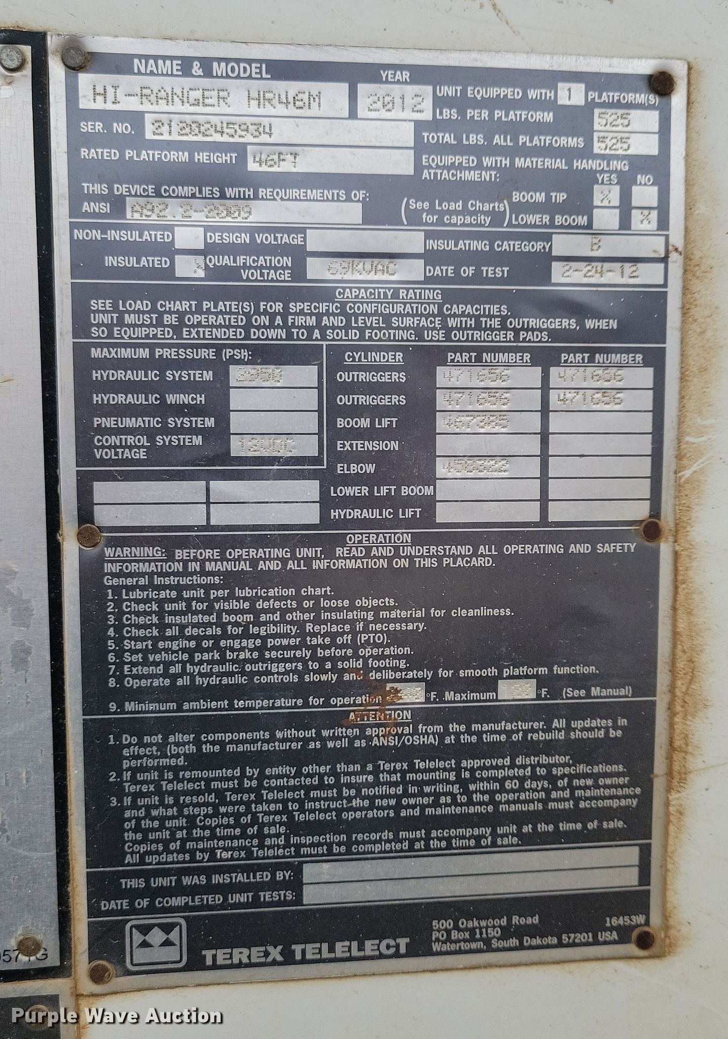 2012 International 7400 bucket truck. Miles: 191,740 on odometer, Hours: 13,395 on meter, VIN: 1HTWEAZN4CJ659510. Engine MaxxForce, Displacement: 9.3L, Cylinders: 6, Fuel type: Diesel. Transmission Allison, Automatic. Chassis Four wheel drive, Axles: Single, Suspension: Spring, Brakes: Air, PTO, GVWR: 33,000 lbs. Interior AC, Heat, Heated mirrors, Cruise control, Auxiliary controls, Brake controller. Features Bed Brand FX, 12' 6" L x 98" W, Boom 2012 Terex Hi-Ranger HR46M, Serial: 2120245934, Boom length: 36', Mast height: 8', Maximum lift capacity: 525 lbs, Maximum lift height: 46', Boom type: Articulating, Insulated, Man basket, Boom controls Platform/ basket, Material handler, Certification valid through: 02/2025. Tires Size: 11R22.5. View repairs. Minnesota title. Title distribution may be delayed up to 14 days from verification of funds. Nobles Cooperative Electric. Worthington, MN 56187