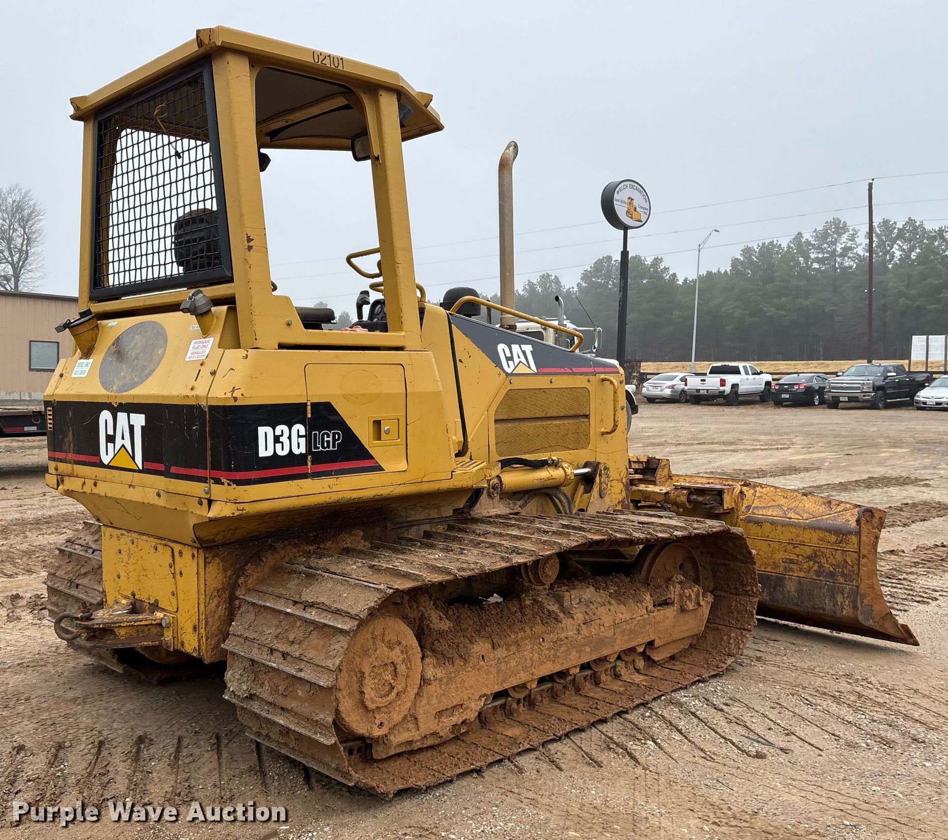 2004 Caterpillar D3G LGP dozer. Hours: 11,098 on meter, Serial: CAT00D3GLBYR00733, Unit #: 02101. Engine Caterpillar 3046, Displacement: 4.99L, Cylinders: 6, Fuel type: Diesel, HP: 90, kW: 67. Transmission Hydrostatic. Operators station Canopy, Steering: Joystick. Features Dozer blade Blade type: 6-way, Blade shape: Straight, Width: 10' 3". Tracks Width: 25", Grouser pads: Single, Bottom rollers: 5. Welch Excavation. Winona, TX 75792