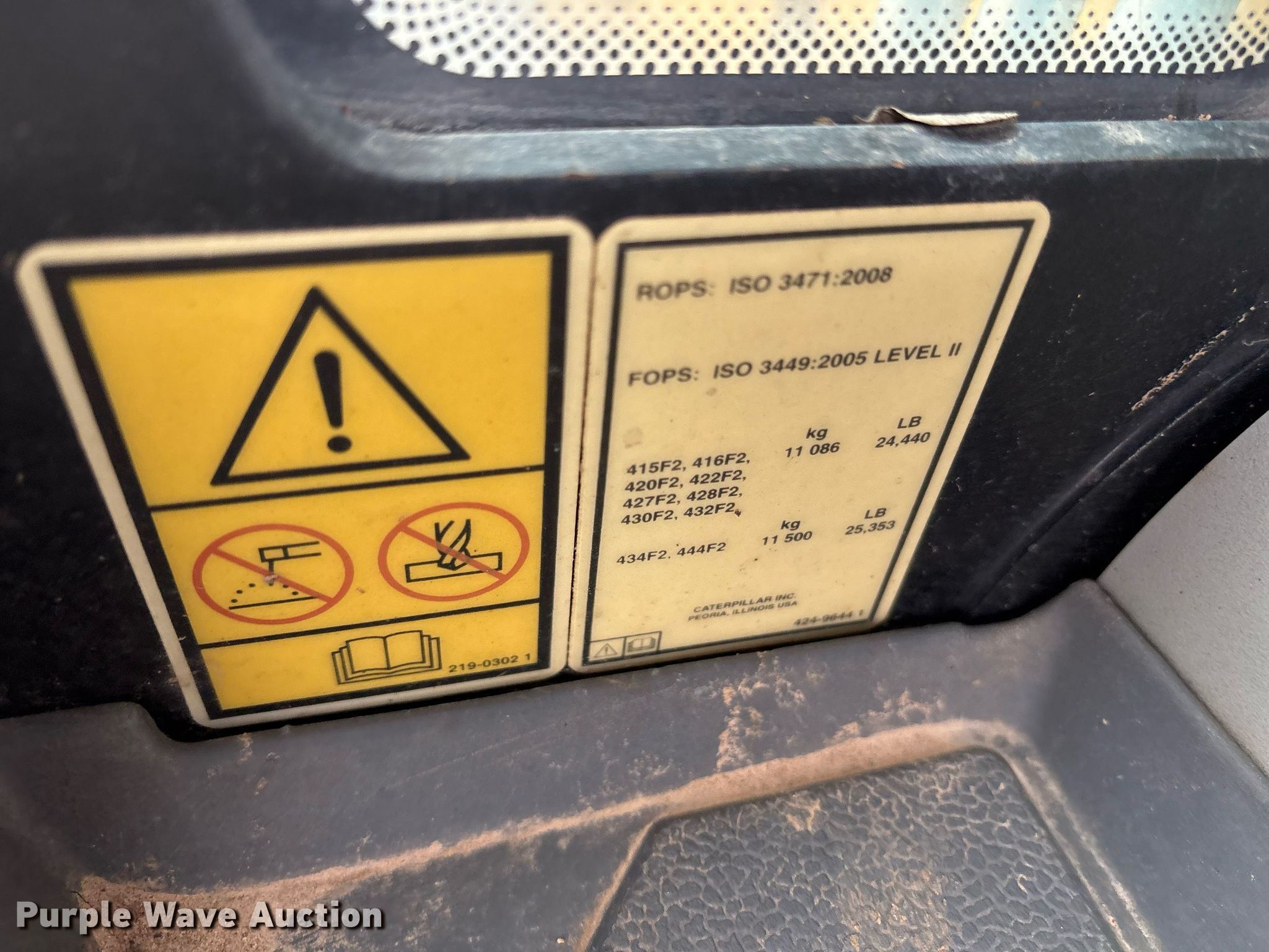 2015 Caterpillar 420F2 IT backhoe. Hours: 3,025 on meter, Serial: CAT0420FVHWD00741, Unit #: 3318. Engine Caterpillar C4.4, Serial: W7N04864, Displacement: 4.4L, Cylinders: 4, Fuel type: Diesel, HP: 102. Transmission Shuttle shift, 4F - 4R. Chassis Four wheel drive, Differential lock. Operators station OROPS, Backhoe controls: Pilot control. Features Loader IT Carrier, Quick coupler: Hydraulic, Auxiliary hydraulics, Bucket Caterpillar 251-1800, Width: 96", Cutting edge: Bolt-on.. Tires Front: 12.5/80-18, Rear: 19.5L-24 IND. Welch Excavation. Winona, TX 75792