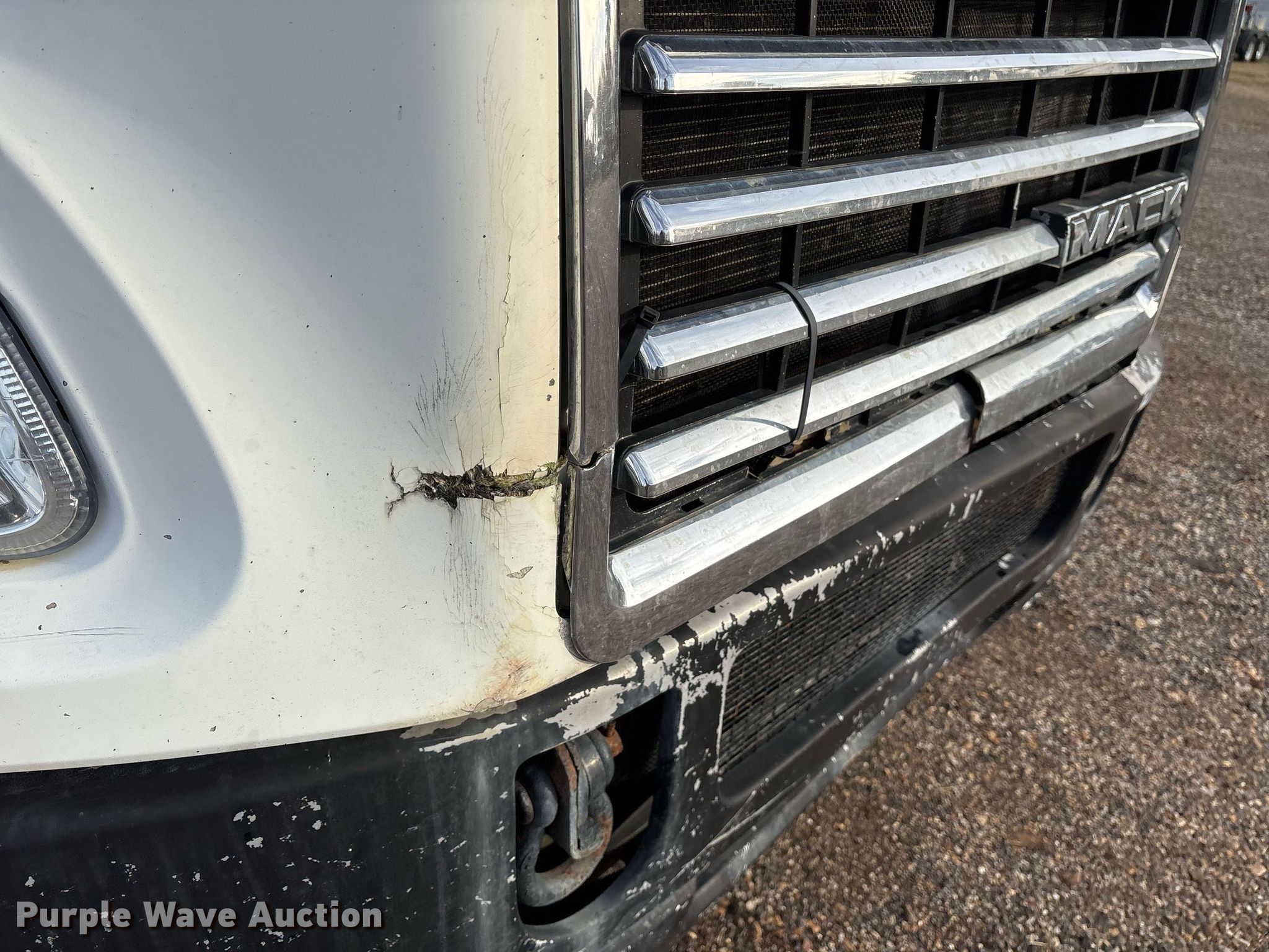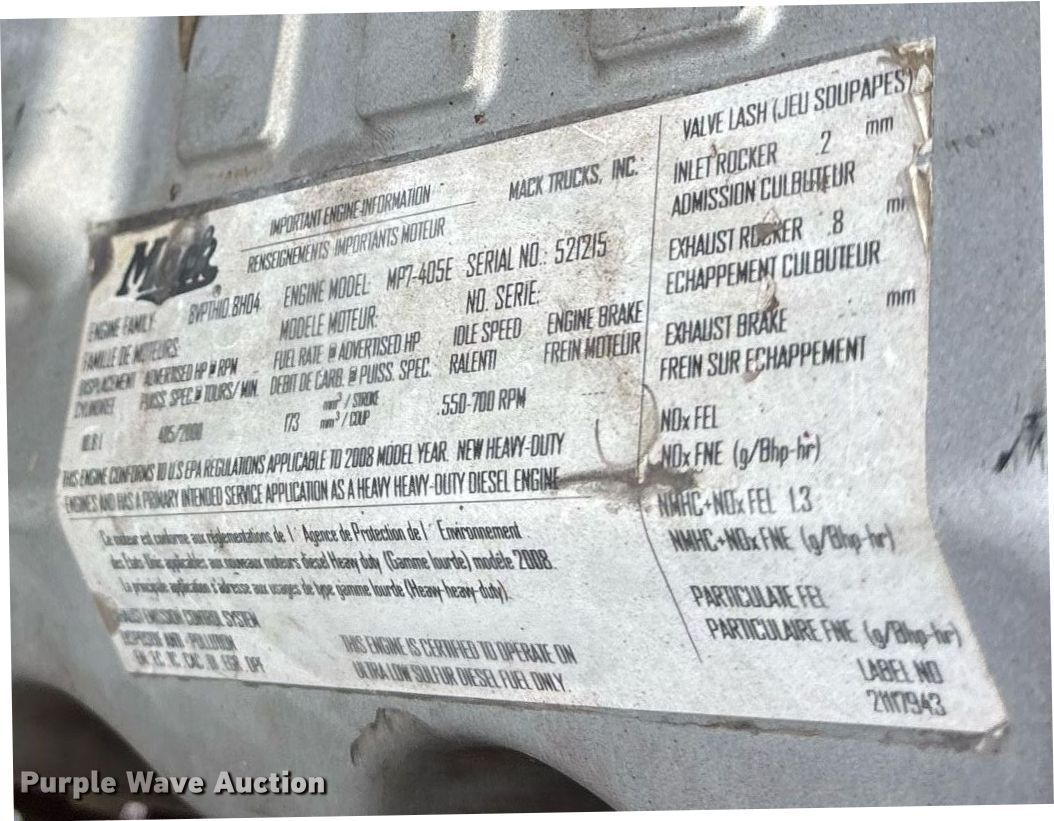2010 Mack Pinnacle dump truck. Miles: 506,206 on odometer, Hours: 17,094 on meter, VIN: 1M1AW02Y5AN008637. Engine Mack MP7, Displacement: 10.8L, Cylinders: 6, Fuel type: Diesel, Engine brake. Transmission Eaton Fuller, Manual, Speed: 10. Chassis Axles: Tandem, Differential lock: Inter-axle, Suspension: Air Dump valves, Brakes: Air, PTO. Interior AC, Heat, Heated mirrors, Cruise control. Features Dump bed 14' L x 8' W, Side height: 51", Bed type: Steel, Roll tarp, Ram: Single, End gate: Air operated. Tires Size: 11R22.5. Notes Dash warning indicator: Electrical fault, Dead battery. Texas title. Title distribution may be delayed up to 14 days from verification of funds. All In Enterprises. Longview, TX 75602
