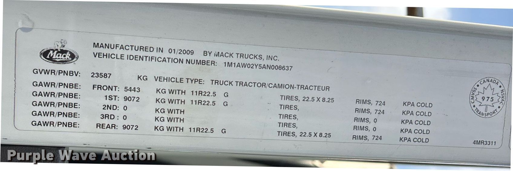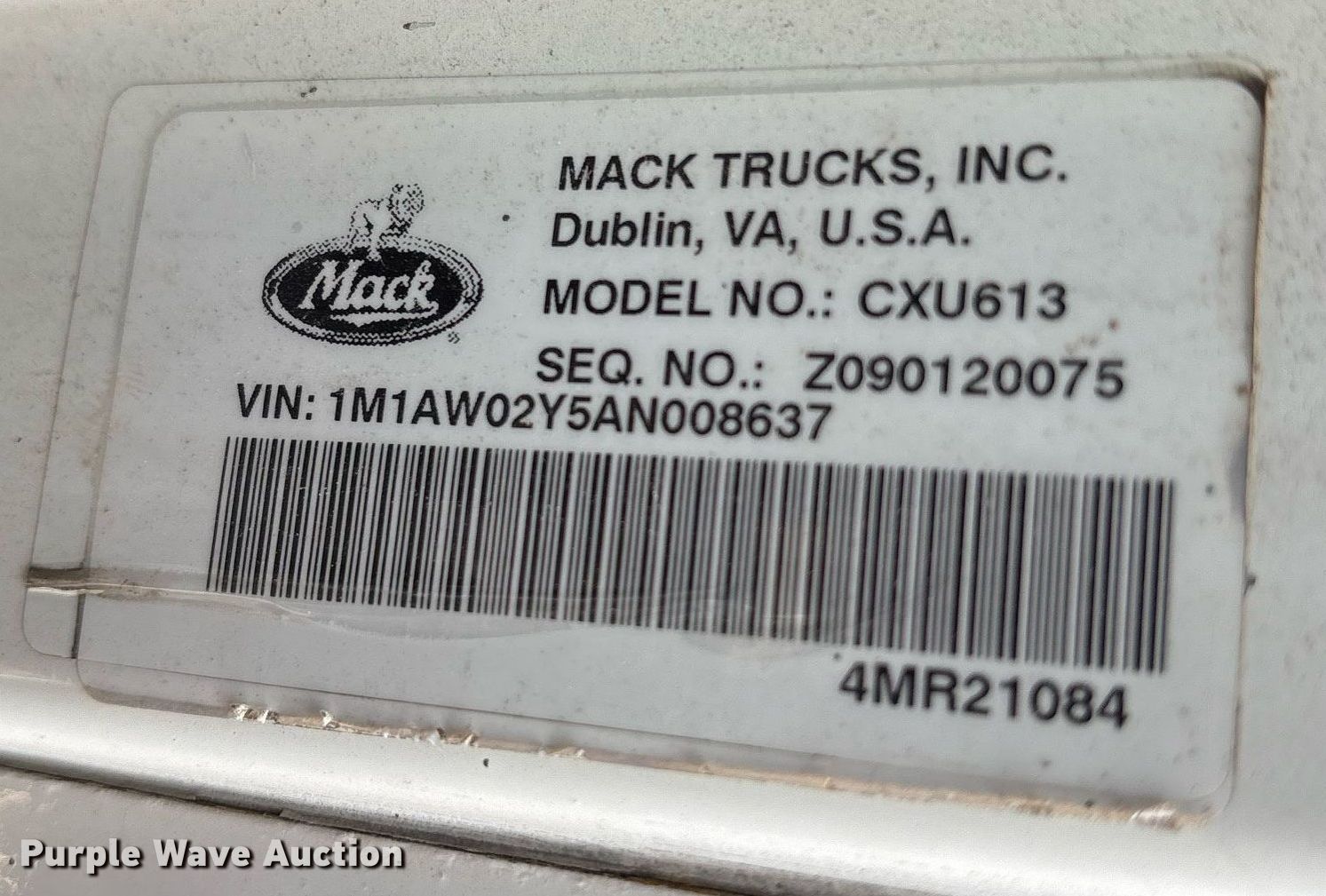 Purple Wave is selling a used Construction Dump Truck in Texas. This item is a 2010 Mack Pinnacle dump truck with the following: Miles: 506,206 on odometer, Hours: 17,094 on meter, VIN: 1M1AW02Y5AN008637