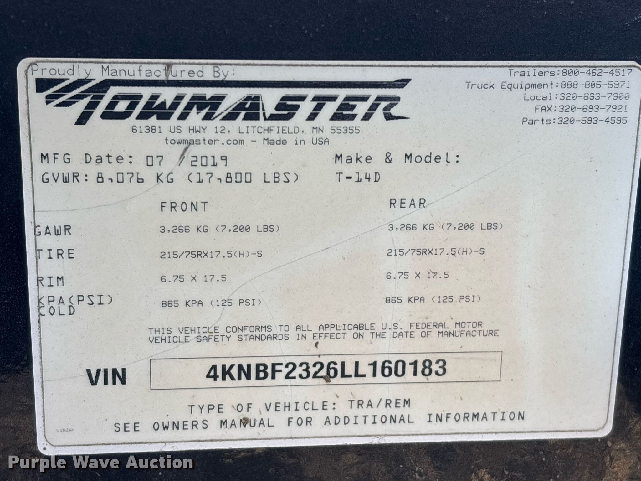 Purple Wave is selling a used Equip. Trailer in California. This item is a 2020 Towmaster T-14D equipment trailer with the following: VIN: 4KNBF2326LL160183, Unit #: TTER-53, Lot #: 84274034