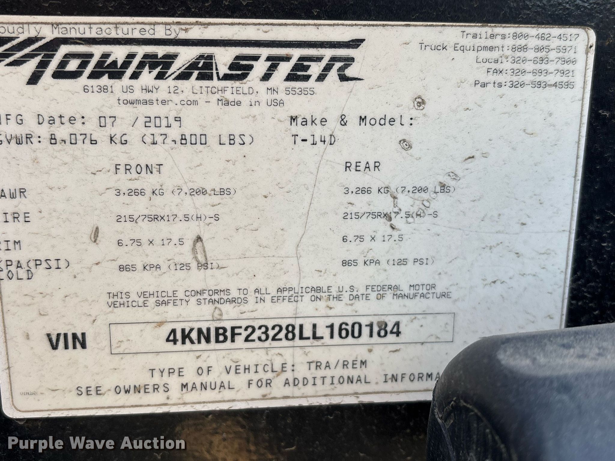 Purple Wave is selling a used Equip. Trailer in California. This item is a 2020 Monroe Towmaster T-14D equipment trailer with the following: VIN: 4KNBF2328LL160184, Unit #: TTER-52, Lot #: 84273994