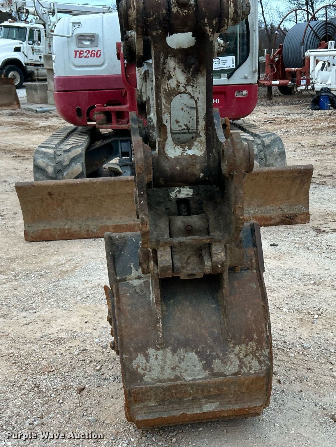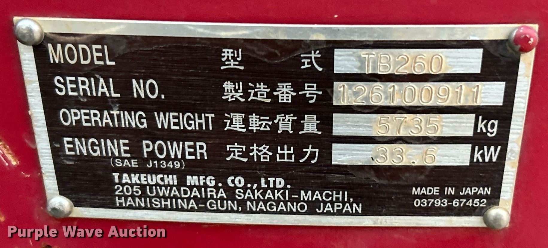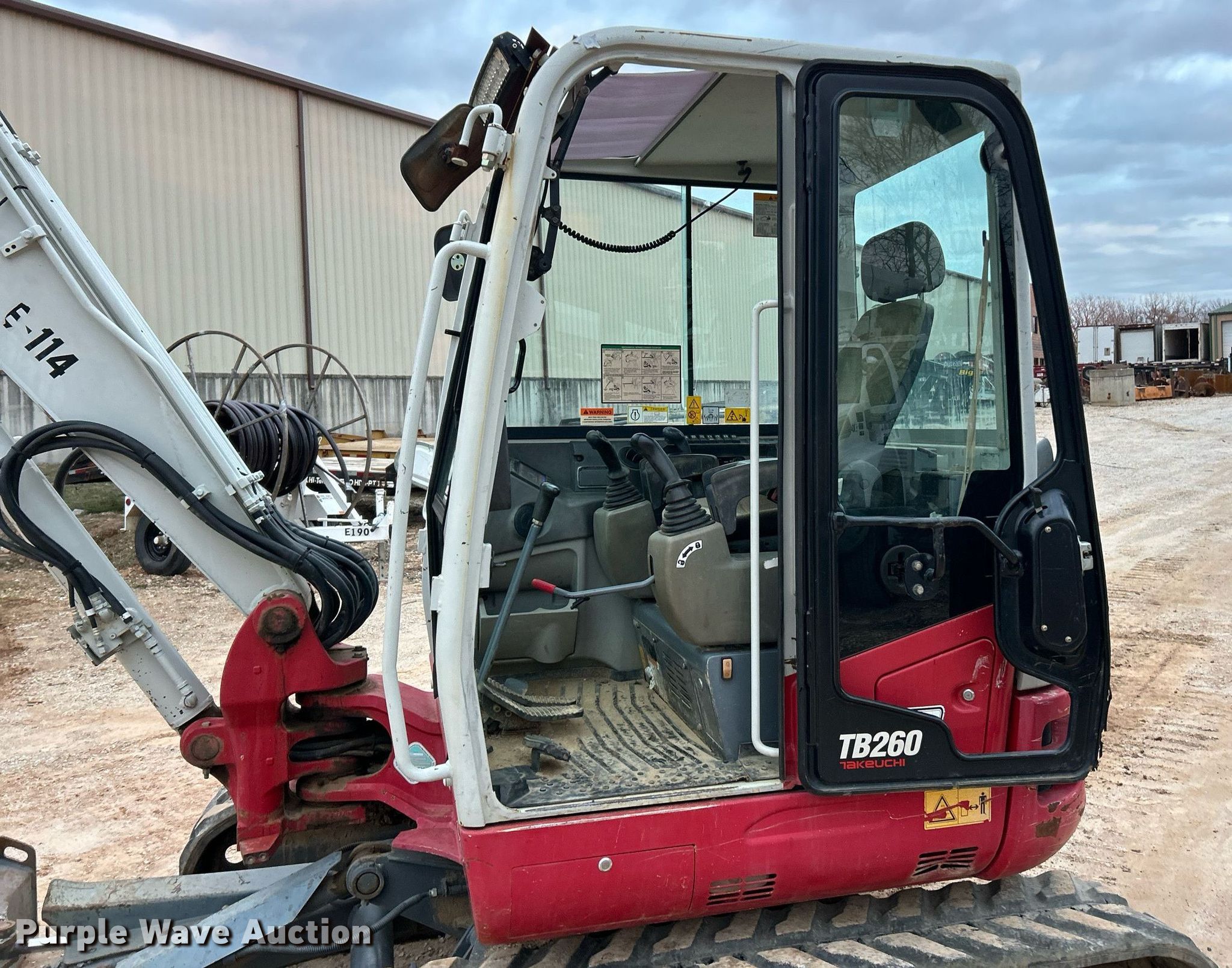 2015 Takeuchi TB260 mini excavator. Hours: 2,898 on meter, Serial: 126100911, Unit #: E114. Engine Yanmar, Displacement: 2.091L, Cylinders: 4, Fuel type: Diesel. Transmission Hydrostatic, Two speed travel. Operators station Enclosed cab, Heat, Pattern changer. Features Auxiliary hydraulics, Backfill blade Width: 79", Boom Swing, Stick Stick length: 6', Quick coupler: Mechanical WB, Bucket WB, Width: 18", Teeth: 4. Tracks Width: 15", Rubber. Notes Door glass missing, Safety arm issues, does not engage. Ewing Signal Construction LLC. - Open Inspection February 21 and 26. 1730 N Gregory. Nixa, MO 65714