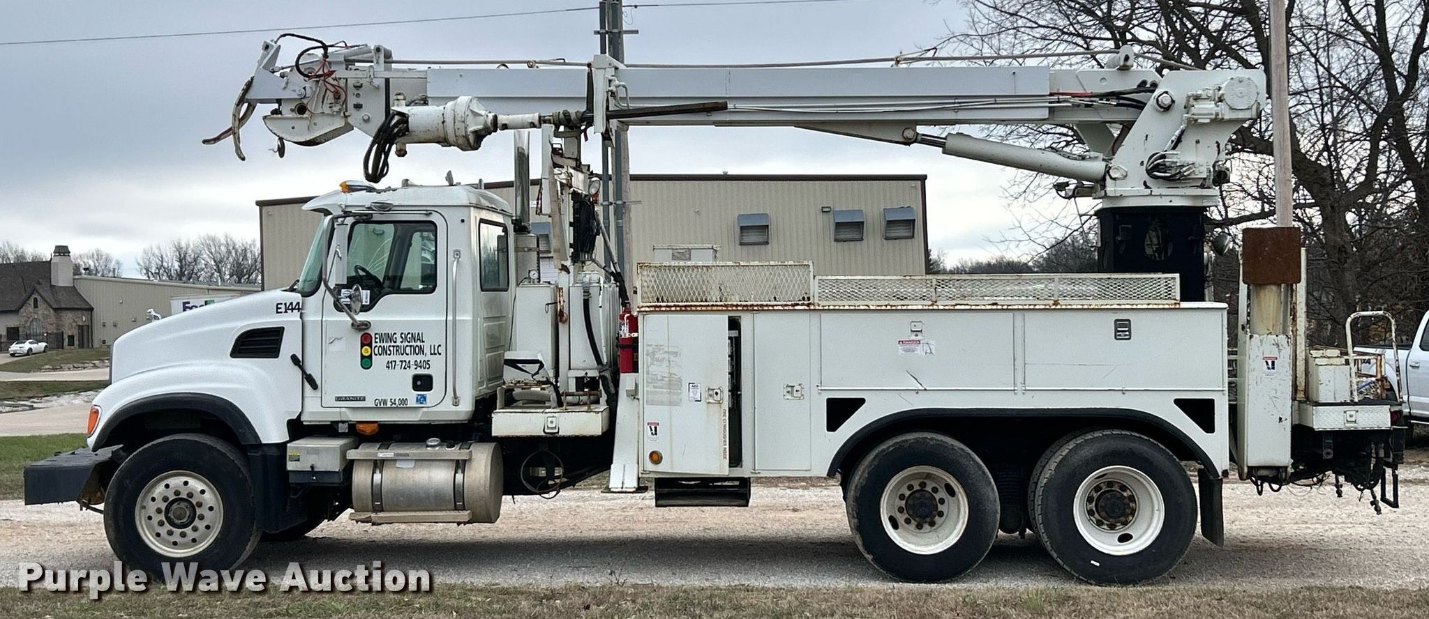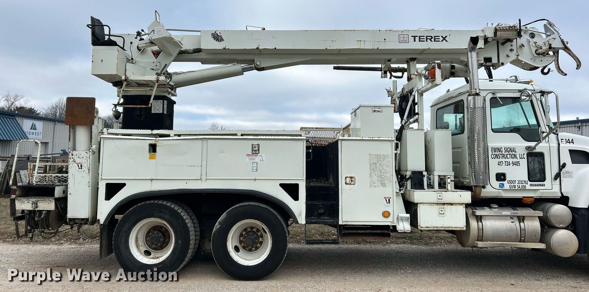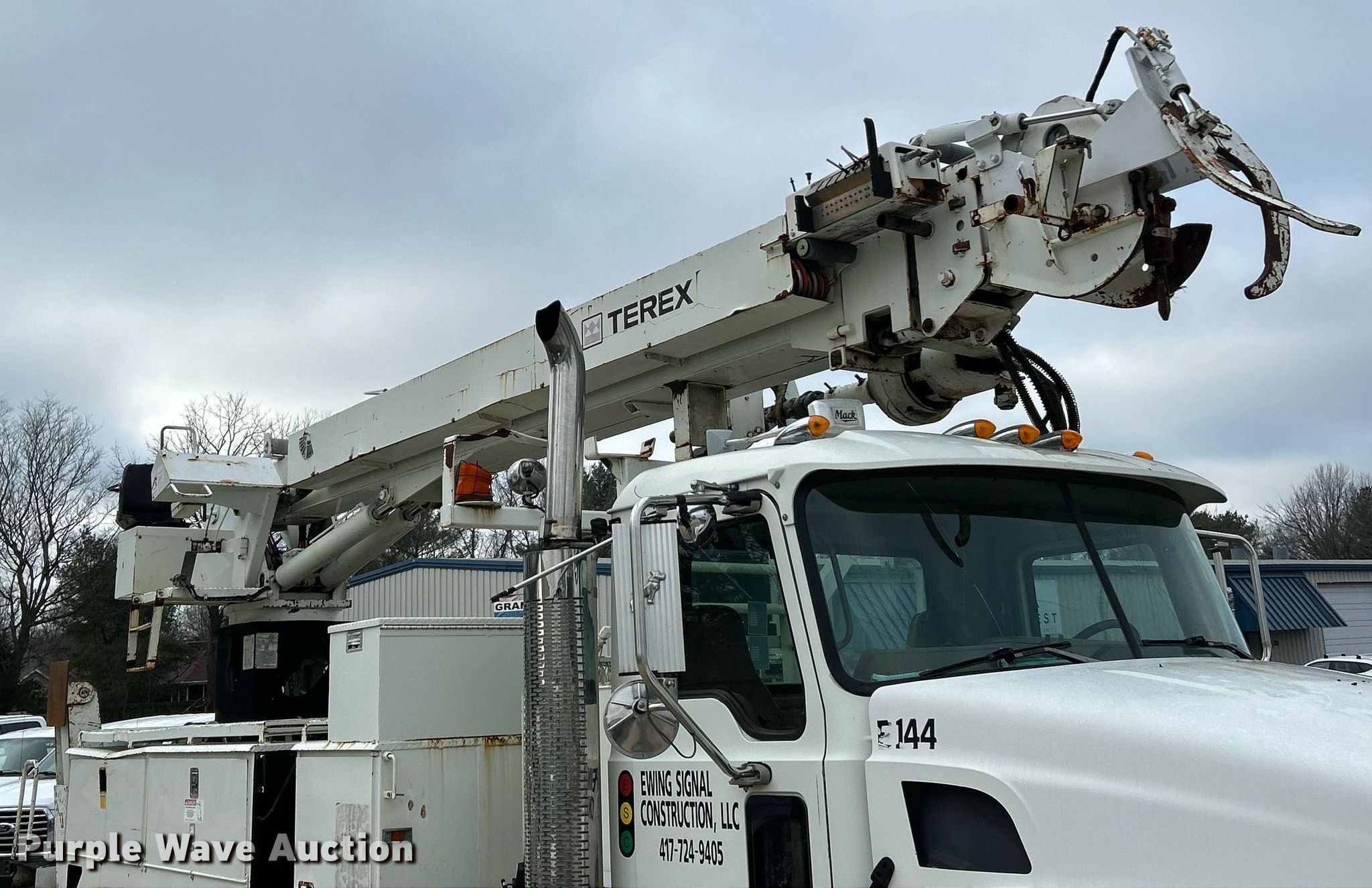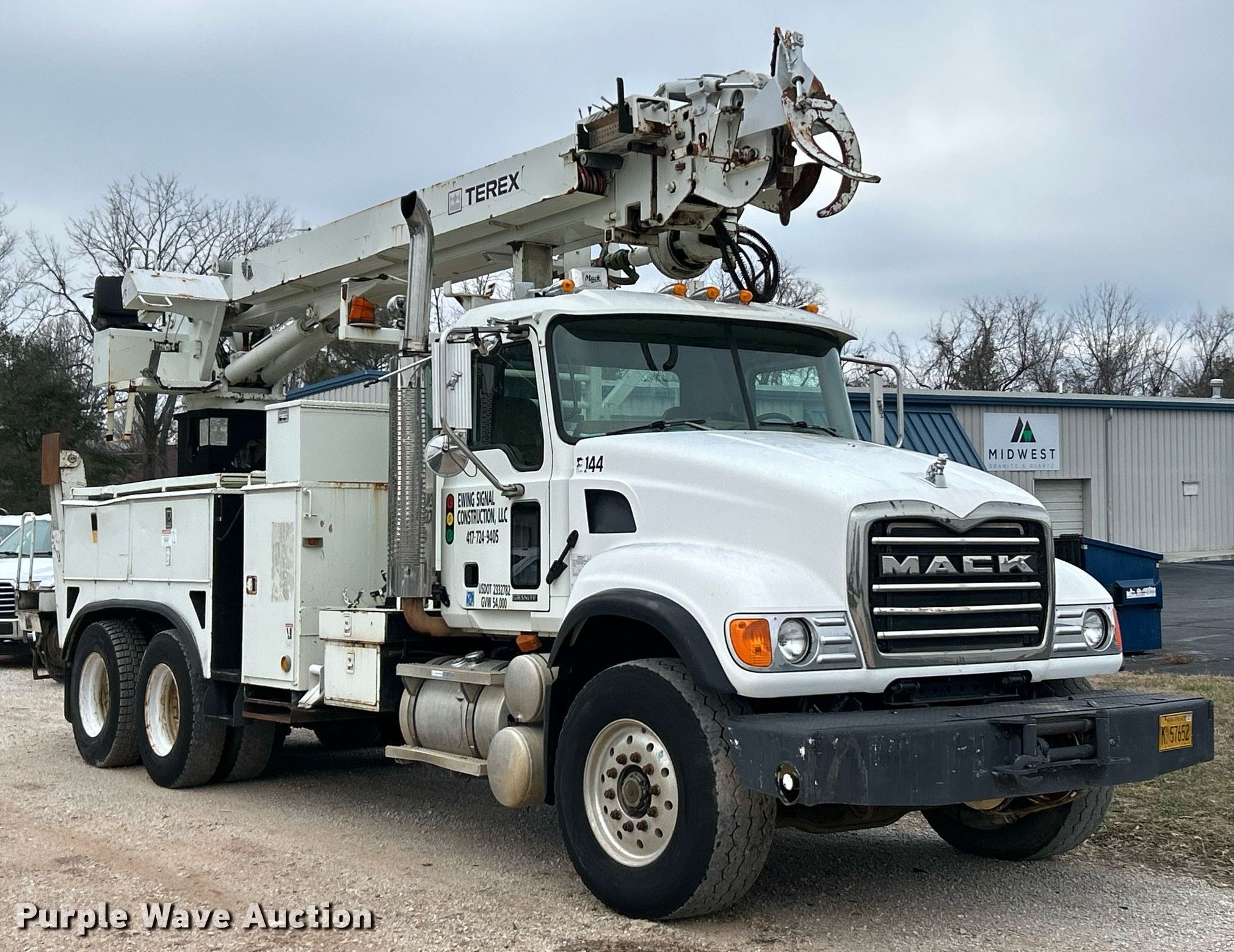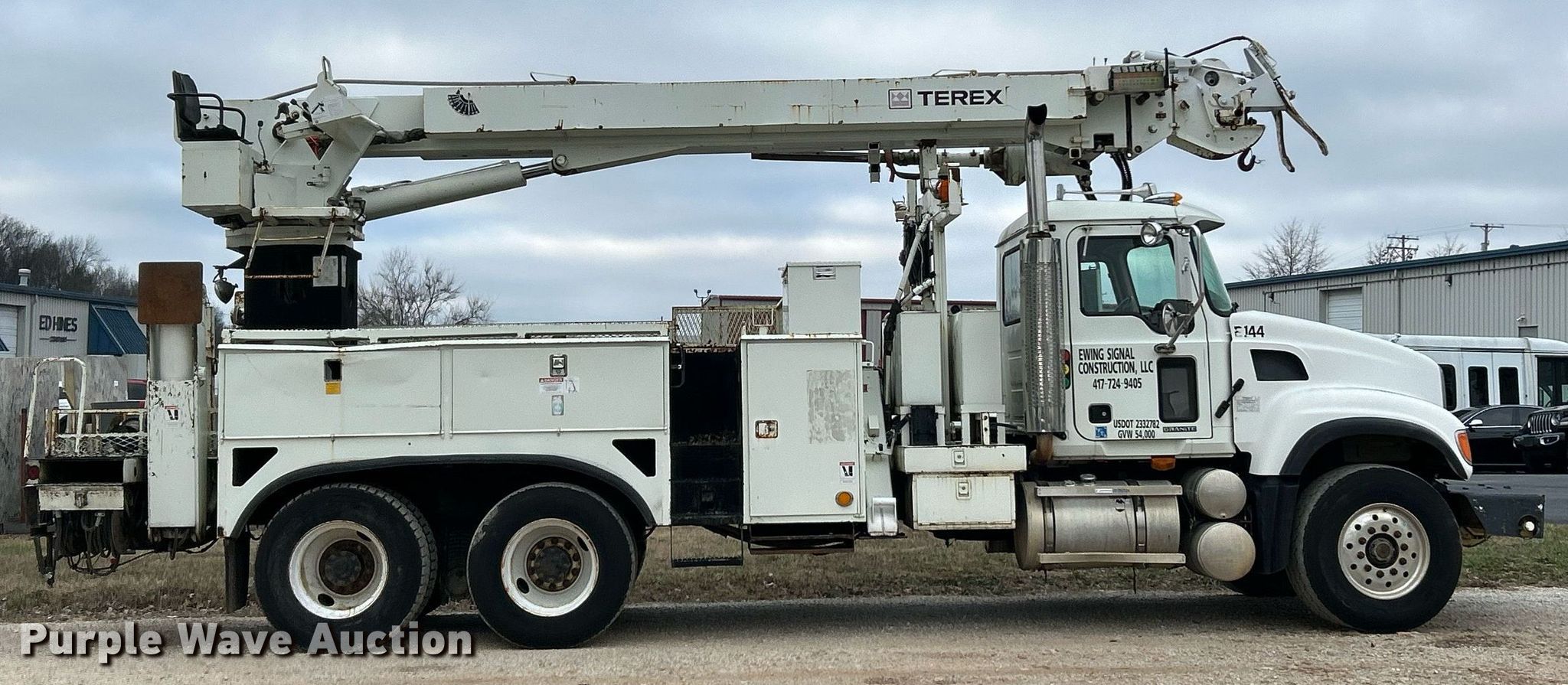 2007 Mack CV713 digger derrick truck. Miles: 138,360 on odometer, Hours: 12,887 on meter, VIN: 1M2AG11C07M058588, Unit #: E144. Engine Displacement: 12.0L, Cylinders: 6, Fuel type: Diesel. Transmission Mack Maxitorque, Manual. Chassis Axles: Tandem, Suspension: Camelback, Brakes: Air, PTO. Interior AC, Heat, Heated mirrors, Cruise control. Features Bed Terex Utilities, 16' 10" L x 94" W, Boom Terex Commander C5050, Serial: 2070634069, Boom type: Telescopic, Boom controls Platform/ basket, Material handler, Pole guide, Auger. Tires Front: 15R22.5, Rear: 11R22.5. Notes Windshield chipped or cracked, Non-operational front driver side toolbox door, Unknown operating condition of auger. Arkansas title. Title distribution may be delayed up to 30 days from verification of funds. Ewing Signal Construction LLC. - Open Inspection February 21 and 26. 1730 N Gregory. Nixa, MO 65714