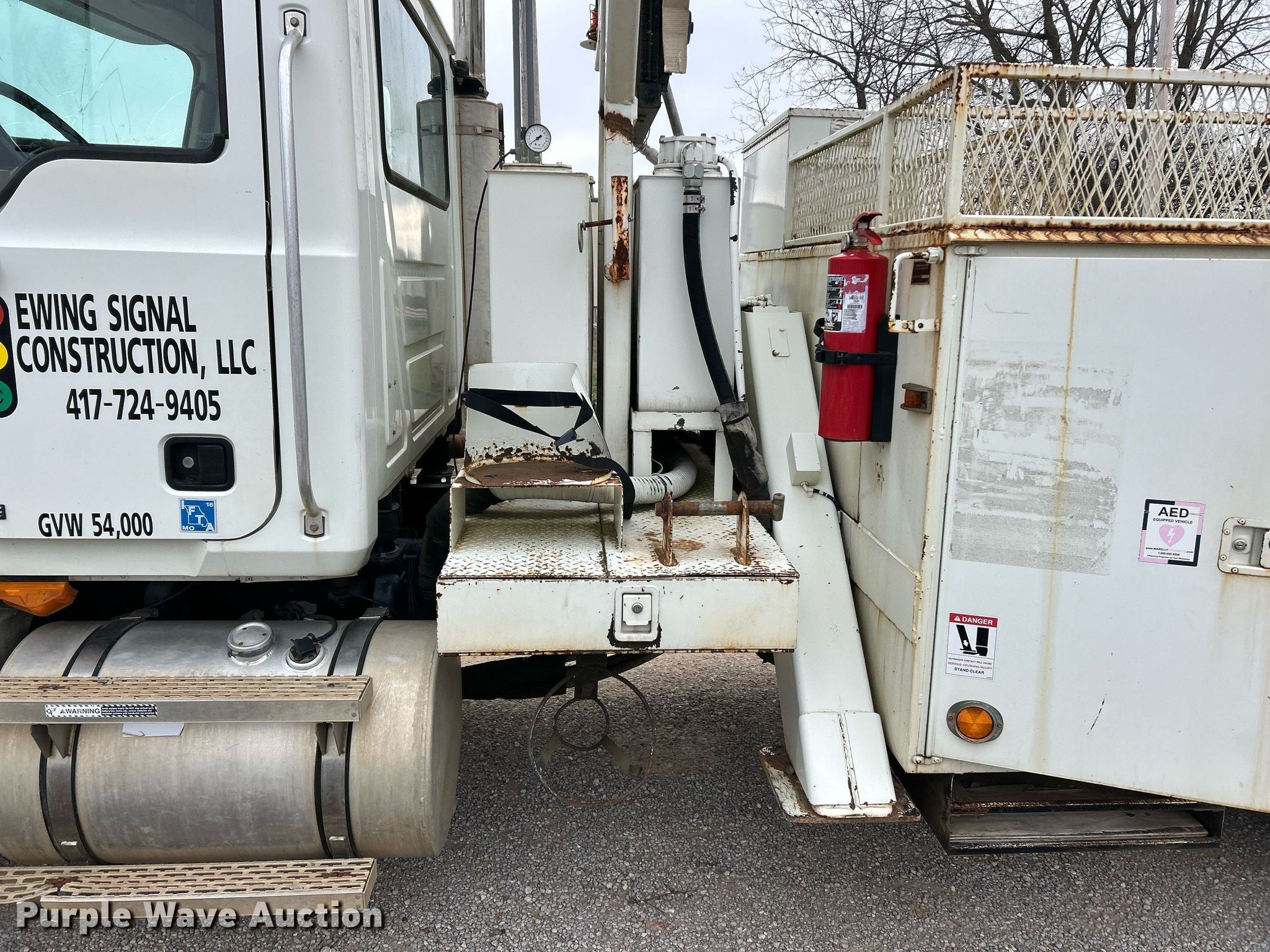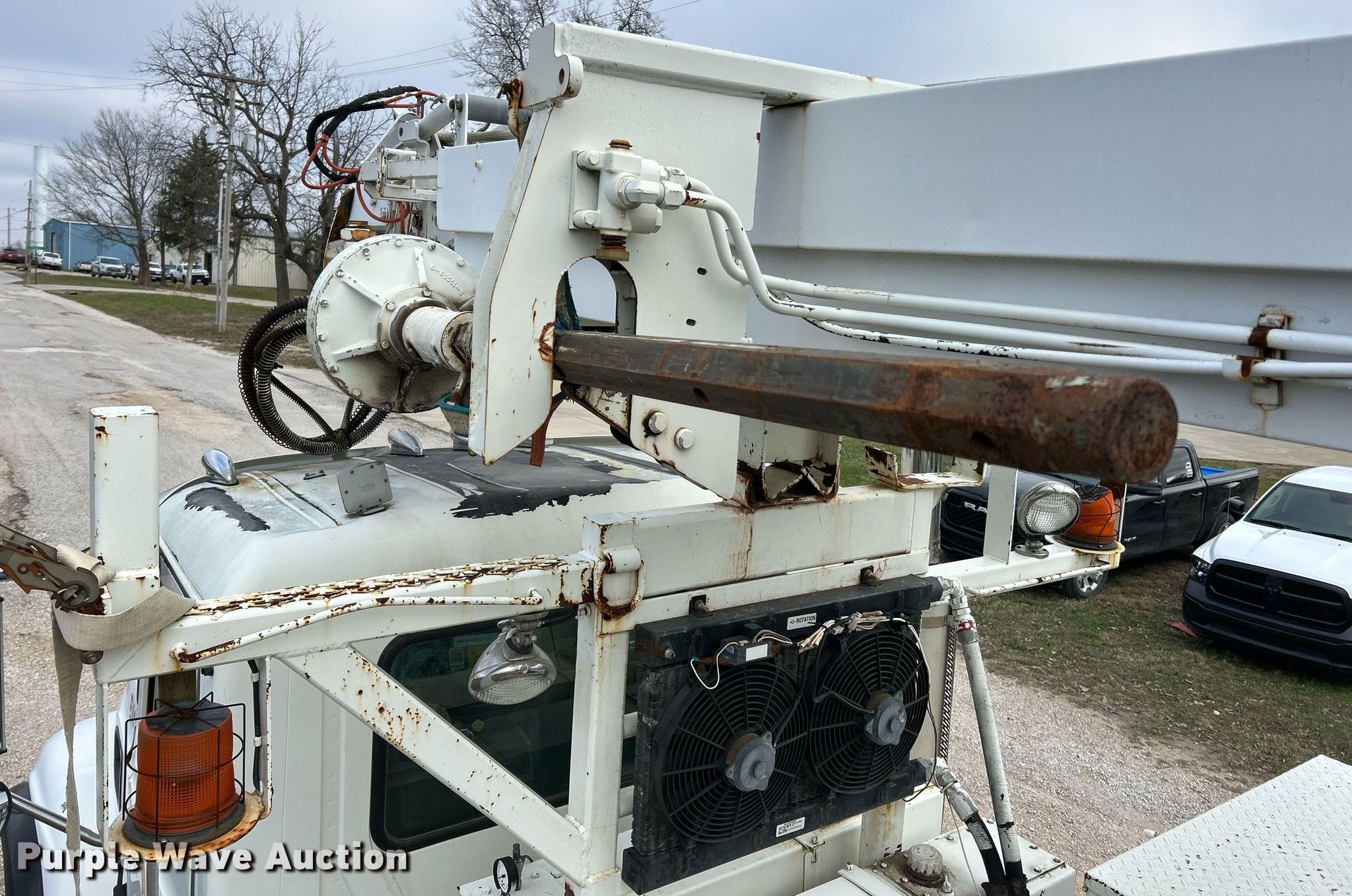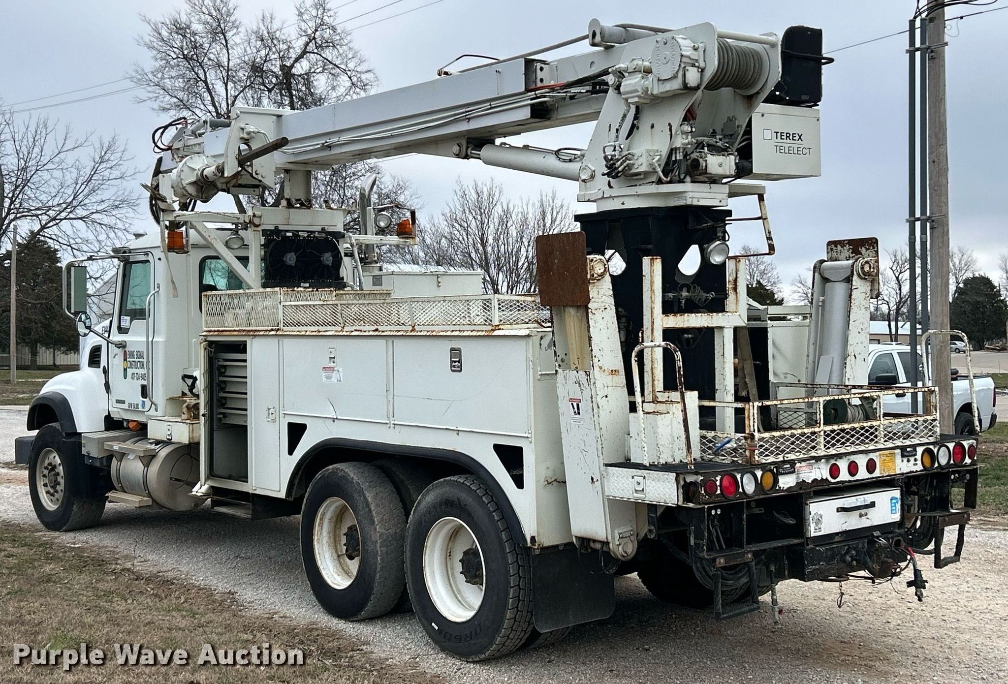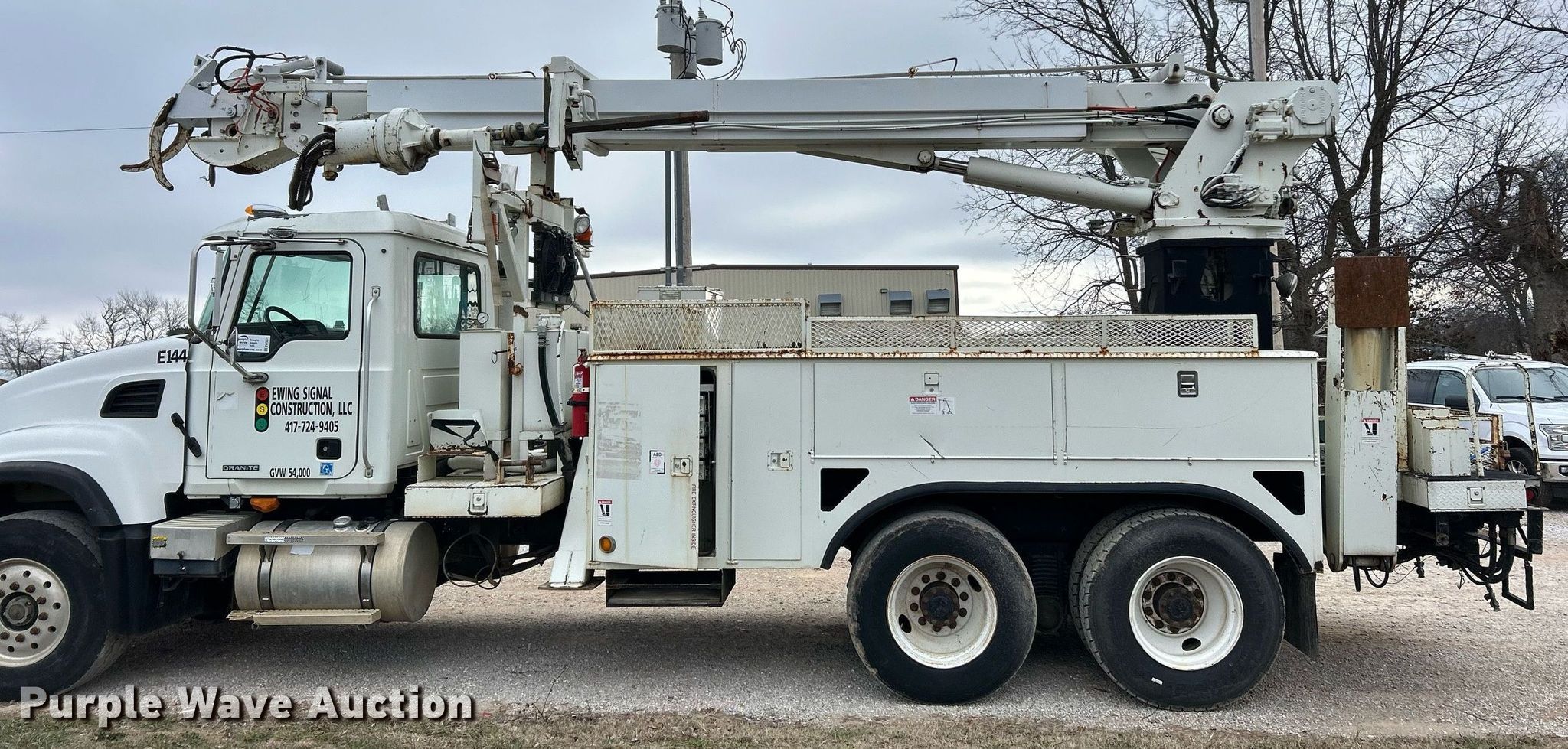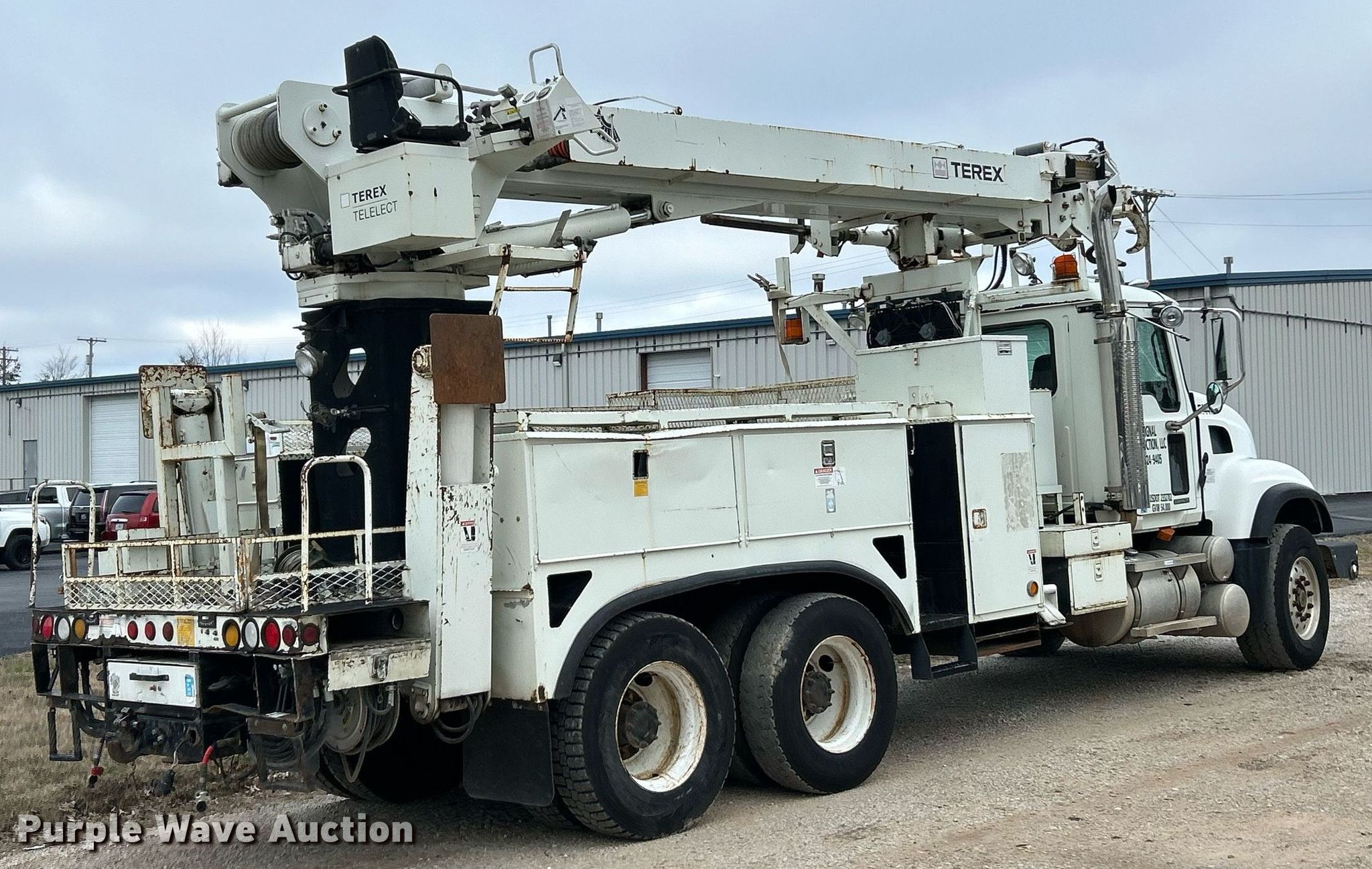 2007 Mack CV713 digger derrick truck. Miles: 138,360 on odometer, Hours: 12,887 on meter, VIN: 1M2AG11C07M058588, Unit #: E144. Engine Displacement: 12.0L, Cylinders: 6, Fuel type: Diesel. Transmission Mack Maxitorque, Manual. Chassis Axles: Tandem, Suspension: Camelback, Brakes: Air, PTO. Interior AC, Heat, Heated mirrors, Cruise control. Features Bed Terex Utilities, 16' 10" L x 94" W, Boom Terex Commander C5050, Serial: 2070634069, Boom type: Telescopic, Boom controls Platform/ basket, Material handler, Pole guide, Auger. Tires Front: 15R22.5, Rear: 11R22.5. Notes Windshield chipped or cracked, Non-operational front driver side toolbox door, Unknown operating condition of auger. Arkansas title. Title distribution may be delayed up to 30 days from verification of funds. Ewing Signal Construction LLC. - Open Inspection February 21 and 26. 1730 N Gregory. Nixa, MO 65714