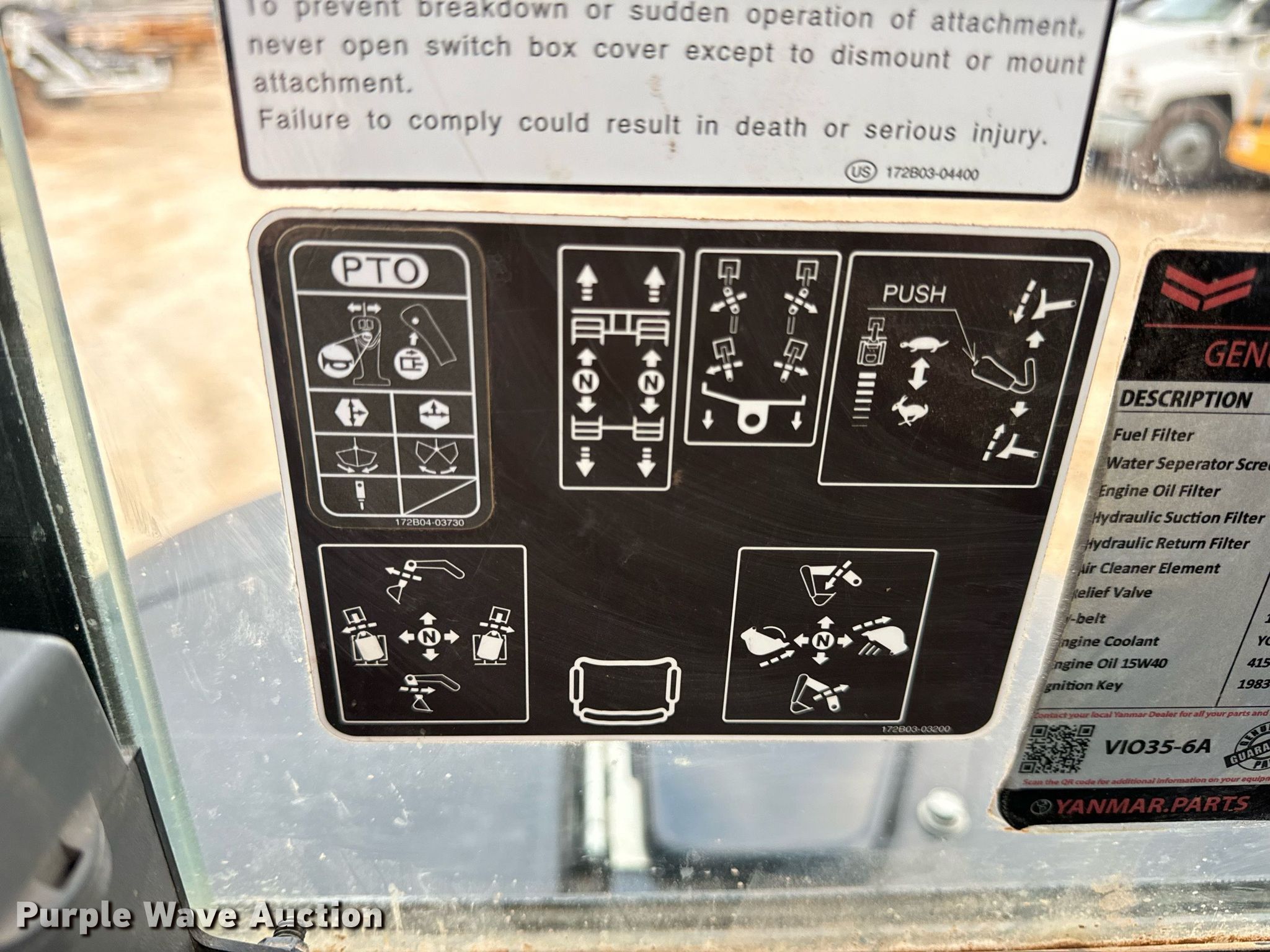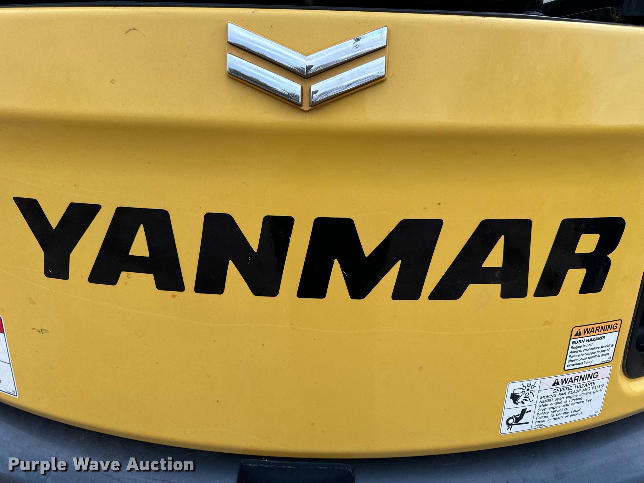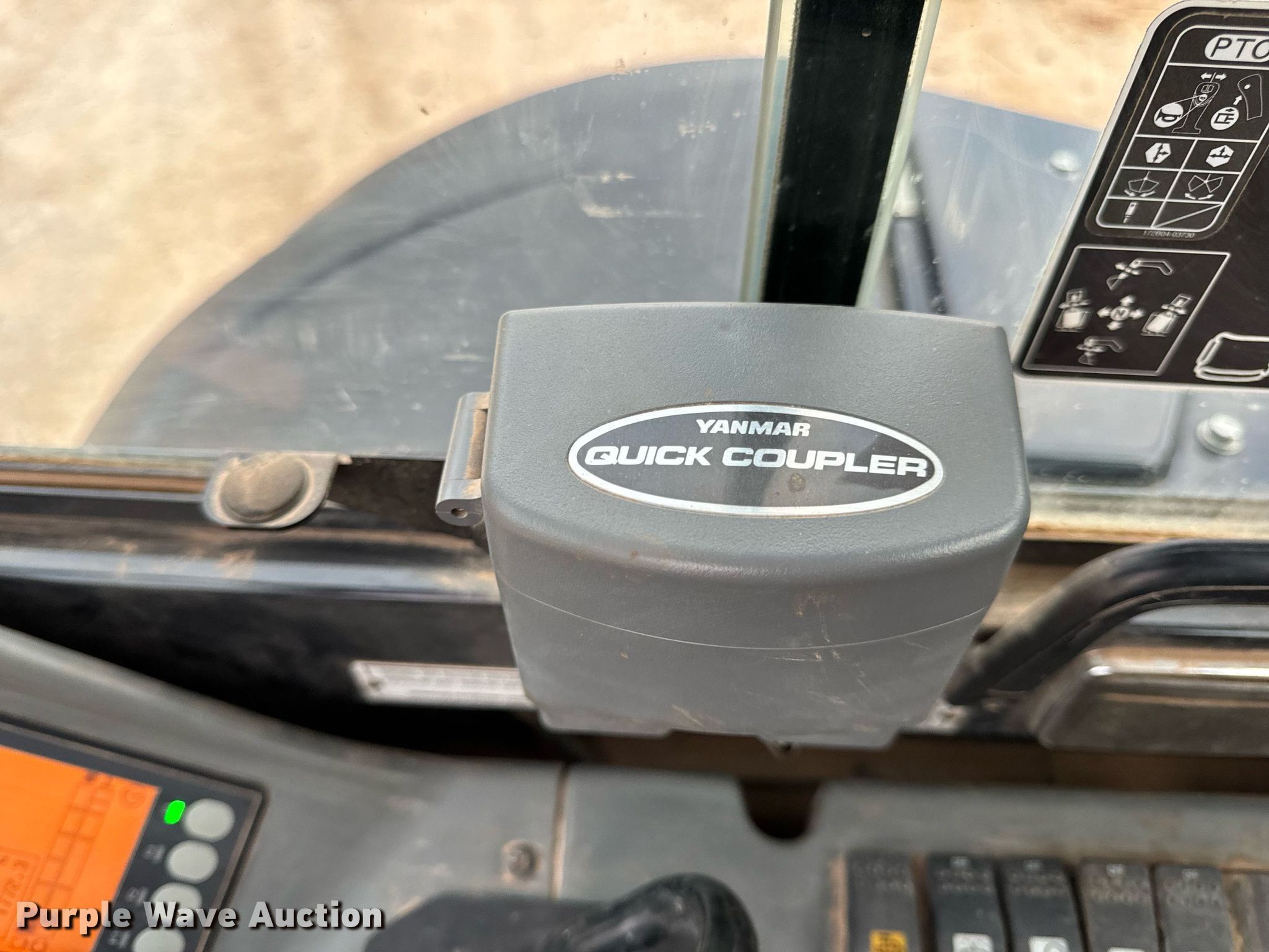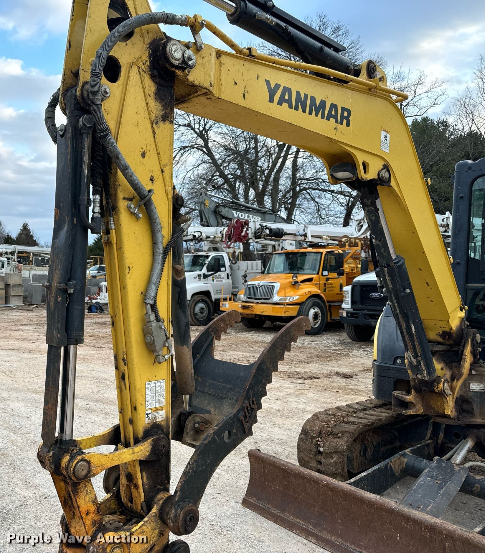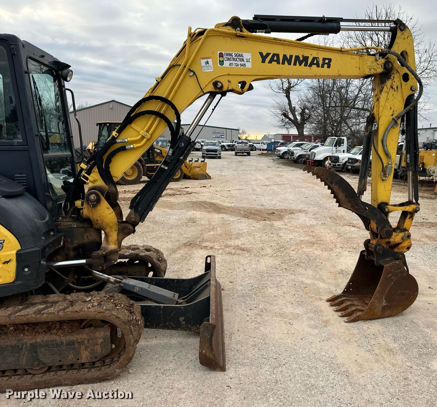Yanmar VIO55-6A mini excavator. Hours: 1,772 on meter, Serial: YMRVI055JKAJAG474, Unit #: E187. Engine Yanmar 4TNV86CT-PBV, Displacement: 2.091L, Cylinders: 3, Fuel type: Diesel. Transmission Hydrostatic, Two speed travel. Operators station Enclosed cab, AC, Heat. Features Auxiliary hydraulics, Counter weights, Backfill blade Width: 77.5", Boom Swing, Stick Stick length: 65", Quick coupler: Hydraulic Yanmar, Thumb: Hydraulic TAG, Bucket TAG 284178-29, Width: 23", Teeth: 5. Tracks Width: 15.5", Rubber. Ewing Signal Construction LLC. - Open Inspection February 21 and 26. 1730 N Gregory. Nixa, MO 65714