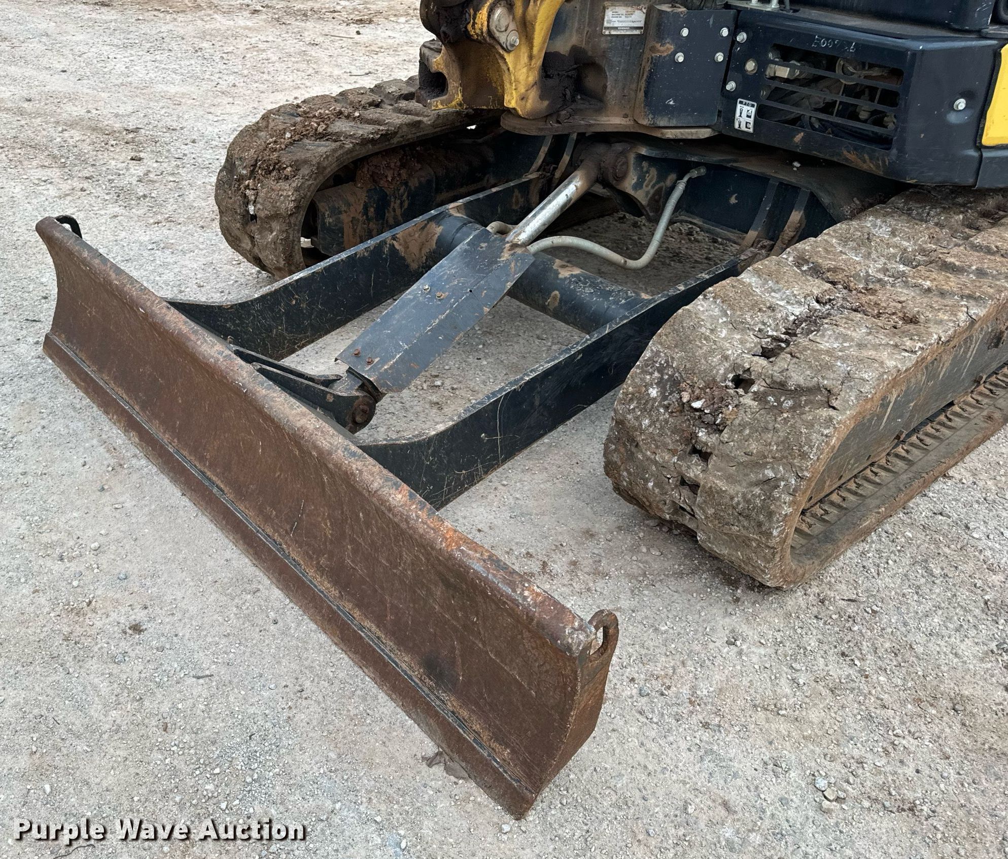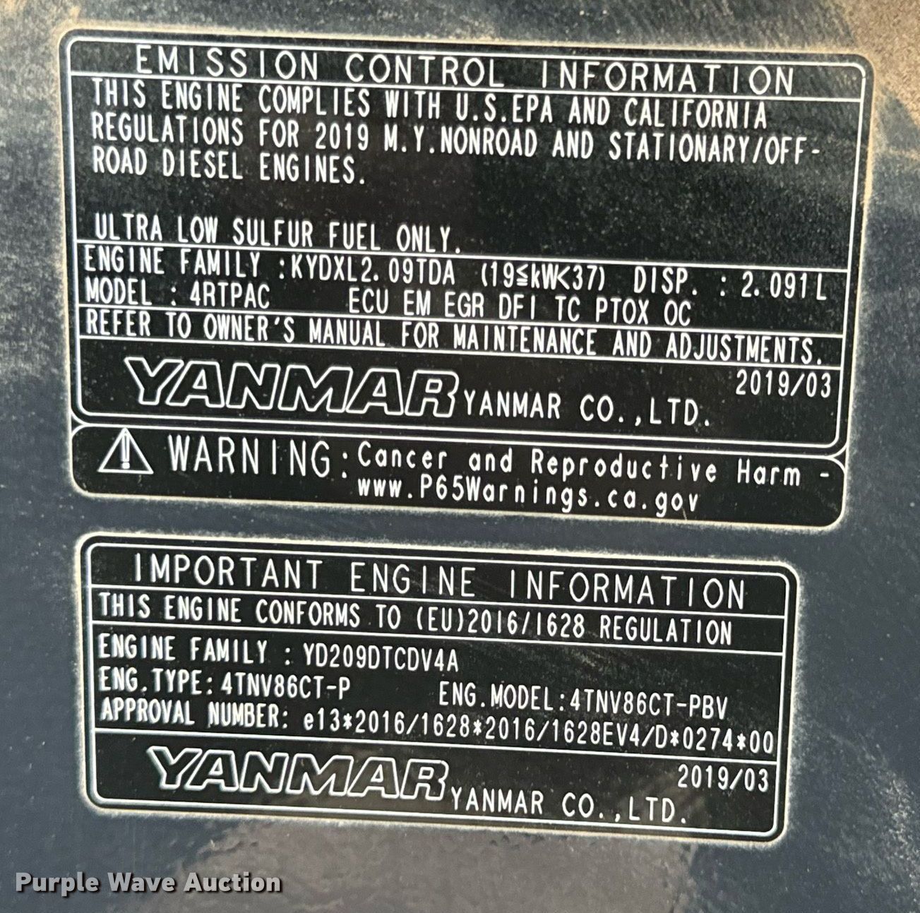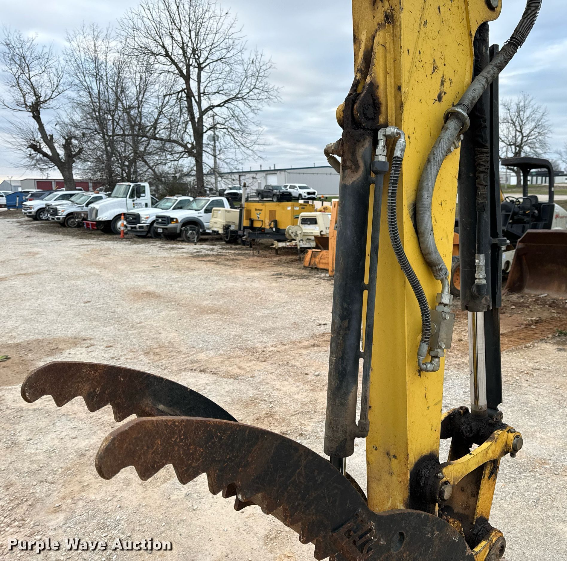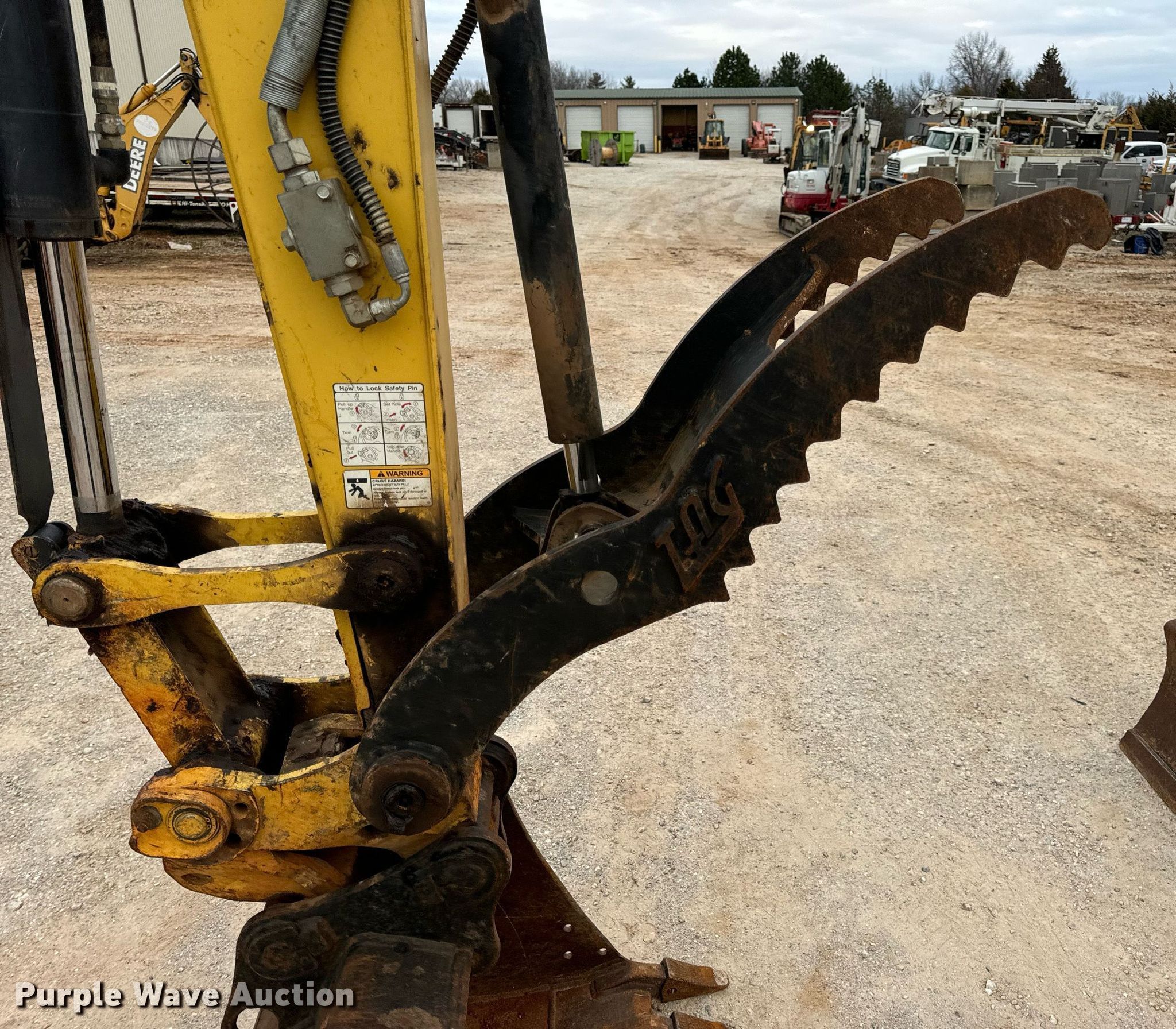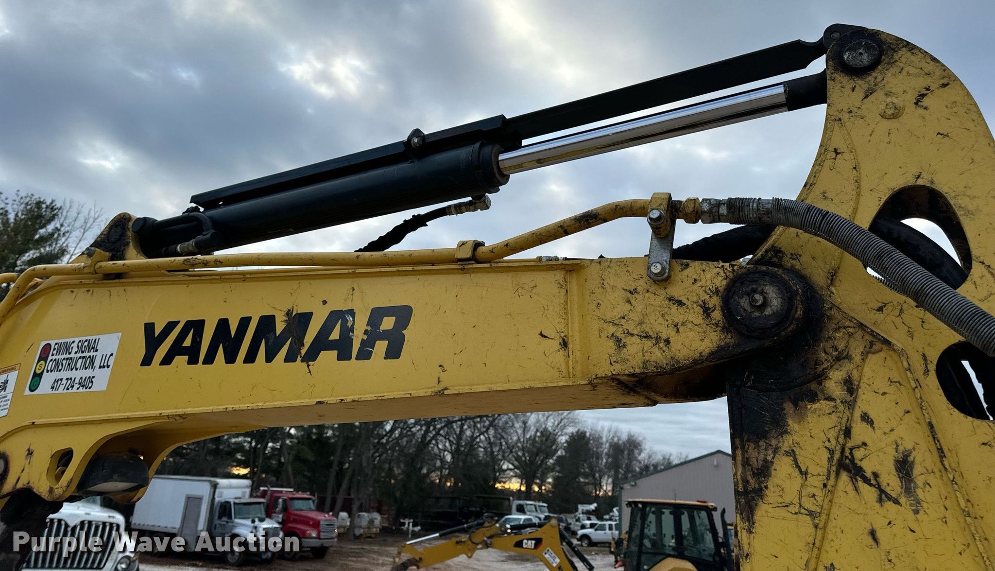 Yanmar VIO55-6A mini excavator. Hours: 1,772 on meter, Serial: YMRVI055JKAJAG474, Unit #: E187. Engine Yanmar 4TNV86CT-PBV, Displacement: 2.091L, Cylinders: 3, Fuel type: Diesel. Transmission Hydrostatic, Two speed travel. Operators station Enclosed cab, AC, Heat. Features Auxiliary hydraulics, Counter weights, Backfill blade Width: 77.5", Boom Swing, Stick Stick length: 65", Quick coupler: Hydraulic Yanmar, Thumb: Hydraulic TAG, Bucket TAG 284178-29, Width: 23", Teeth: 5. Tracks Width: 15.5", Rubber. Ewing Signal Construction LLC. - Open Inspection February 21 and 26. 1730 N Gregory. Nixa, MO 65714