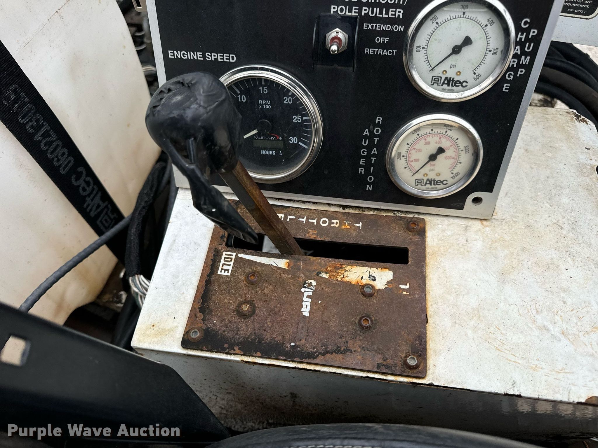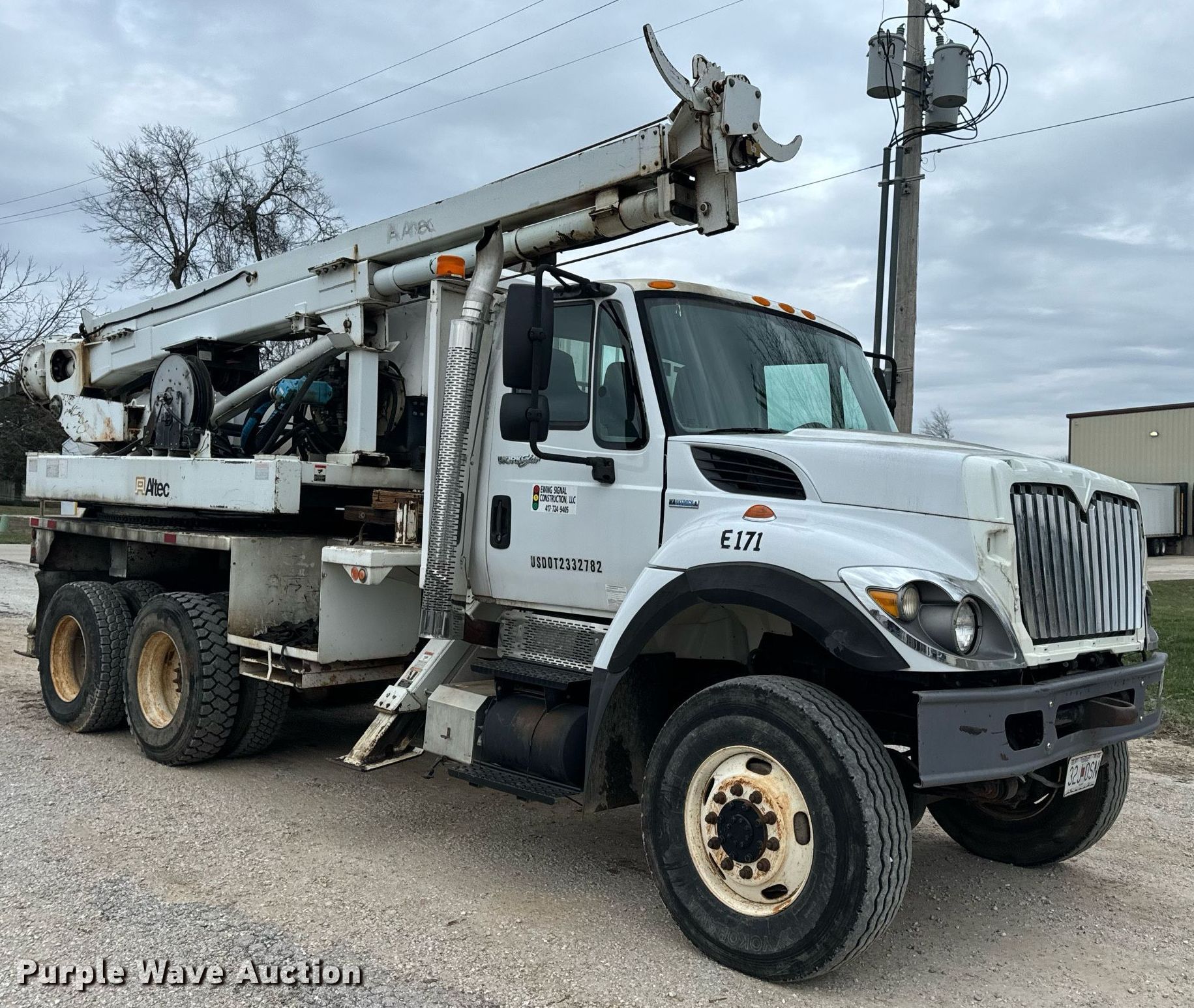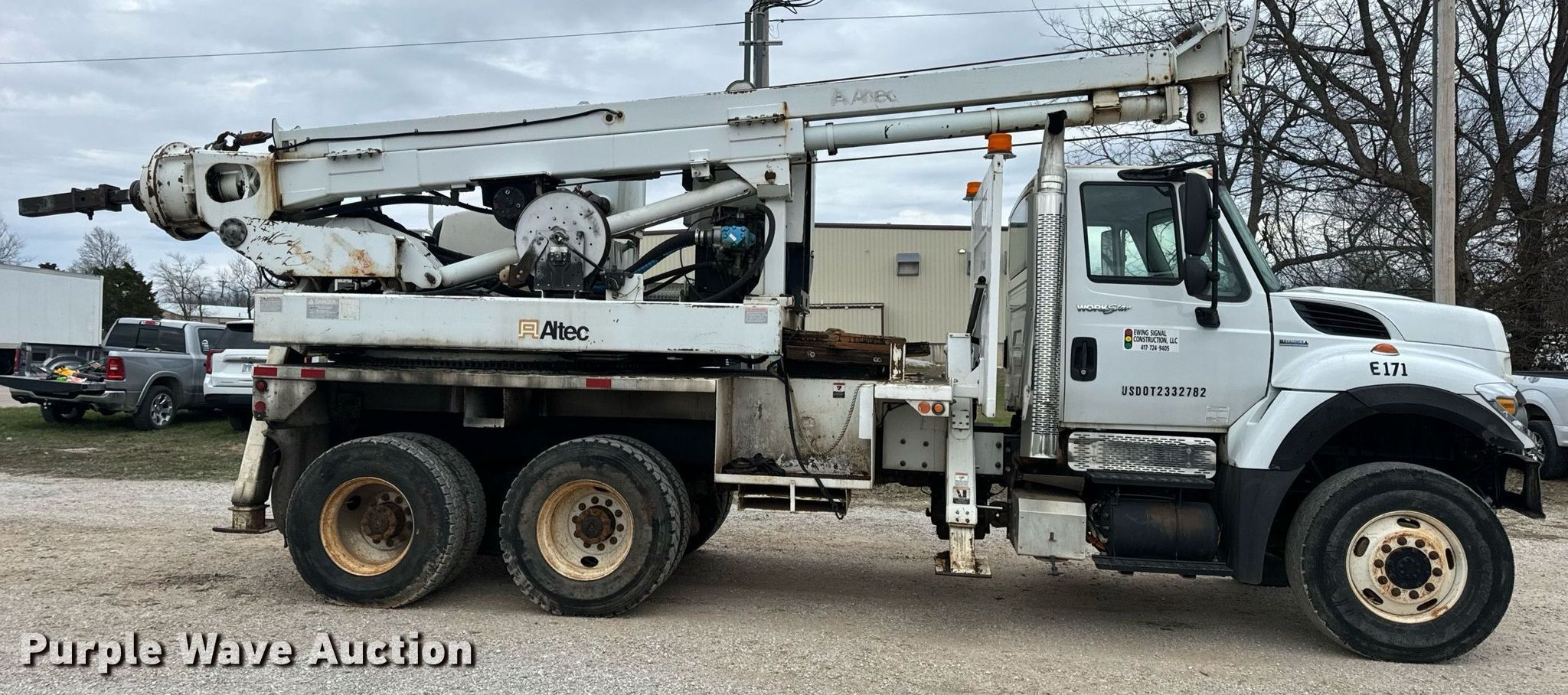 2009 International 7400 WorkStar pressure digger truck. Miles: 57,884 on odometer, Hours: 4,337 on meter, VIN: 1HTWJAZR79J048930, Unit #: E171. Engine International MaxxForce, Displacement: 9.3L, Cylinders: 6, Fuel type: Diesel. Transmission Allison, Automatic. Chassis Six wheel drive, Axles: Tandem, Suspension: Spring over walking beam, Brakes: Air, PTO, GVWR: 54,000 lbs. Interior AC, Heat, Cruise control, Brake controller. Features Bed Altec, Serial: 90-1057458706-08, 14' x 8' W, Chip bed Engine John Deere 6068TF150, Serial: PE6068T713984, Cylinders: 6, Fuel: Diesel, Boom Altec HD35A, Maximum lift capacity: 8,000 lbs, Maximum lift height: 35', Boom type: Telescopic, Boom controls, Pressure digger, Pole guide, Auger. Tires Front: 315/80R22.5, Rear: 11R22.5. Missouri title. Title distribution may be delayed up to 30 days from verification of funds. Ewing Signal Construction LLC. - Open Inspection February 21 and 26. 1730 N Gregory. Nixa, MO 65714