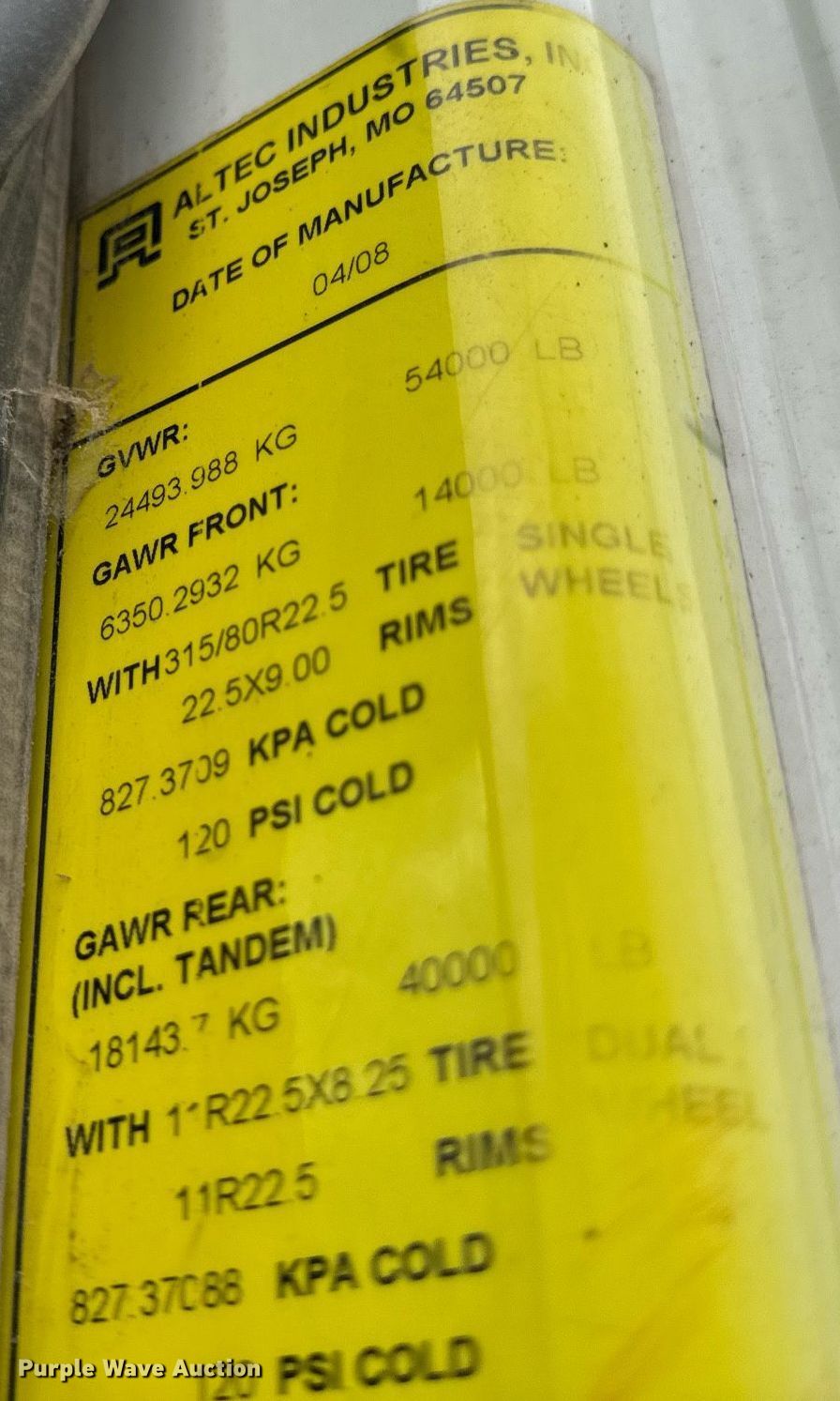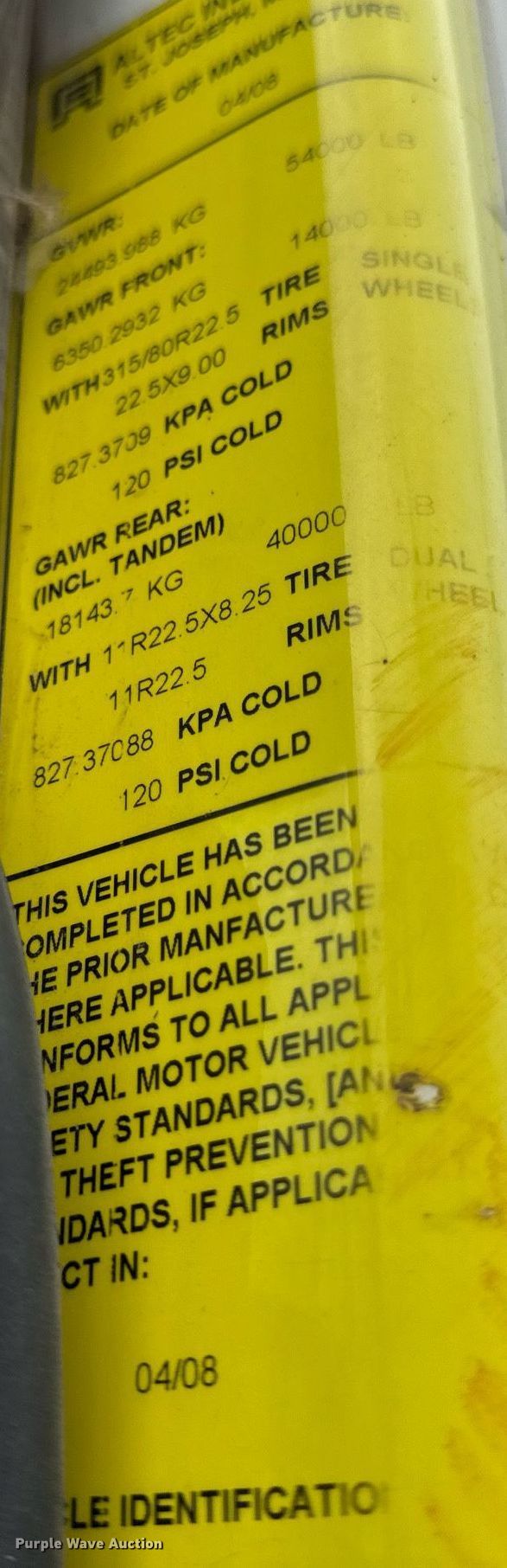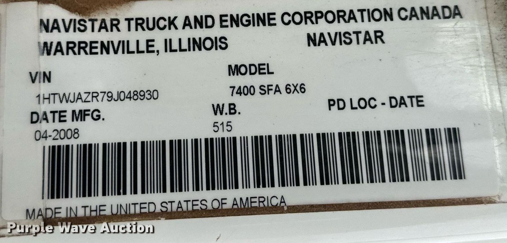 2009 International 7400 WorkStar pressure digger truck. Miles: 57,884 on odometer, Hours: 4,337 on meter, VIN: 1HTWJAZR79J048930, Unit #: E171. Engine International MaxxForce, Displacement: 9.3L, Cylinders: 6, Fuel type: Diesel. Transmission Allison, Automatic. Chassis Six wheel drive, Axles: Tandem, Suspension: Spring over walking beam, Brakes: Air, PTO, GVWR: 54,000 lbs. Interior AC, Heat, Cruise control, Brake controller. Features Bed Altec, Serial: 90-1057458706-08, 14' x 8' W, Chip bed Engine John Deere 6068TF150, Serial: PE6068T713984, Cylinders: 6, Fuel: Diesel, Boom Altec HD35A, Maximum lift capacity: 8,000 lbs, Maximum lift height: 35', Boom type: Telescopic, Boom controls, Pressure digger, Pole guide, Auger. Tires Front: 315/80R22.5, Rear: 11R22.5. Missouri title. Title distribution may be delayed up to 30 days from verification of funds. Ewing Signal Construction LLC. - Open Inspection February 21 and 26. 1730 N Gregory. Nixa, MO 65714