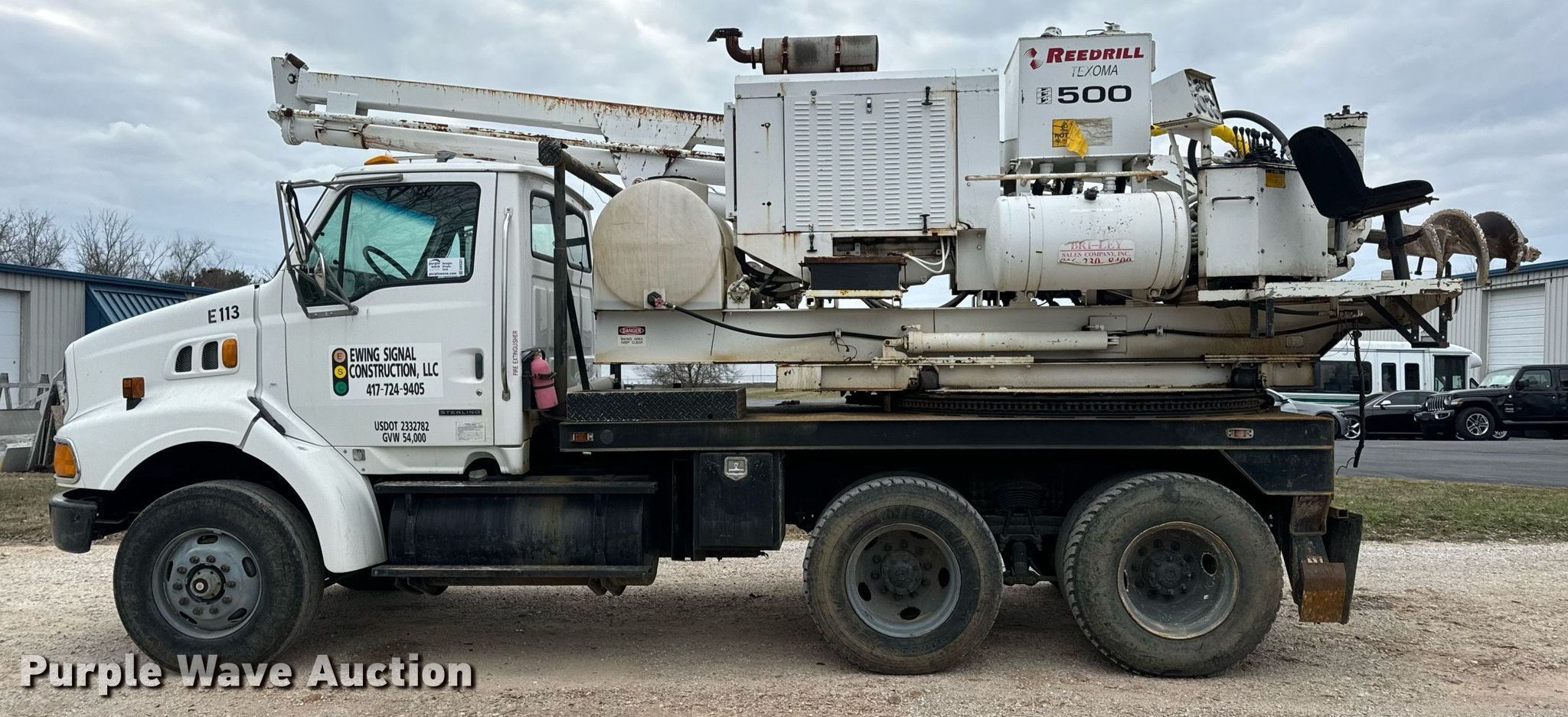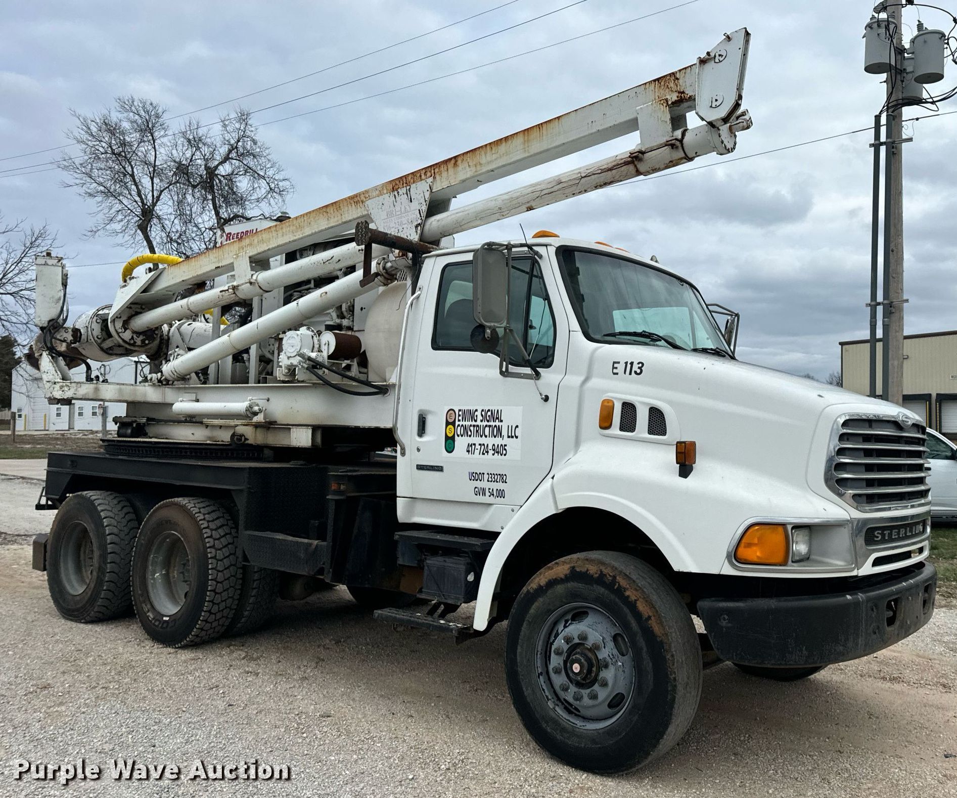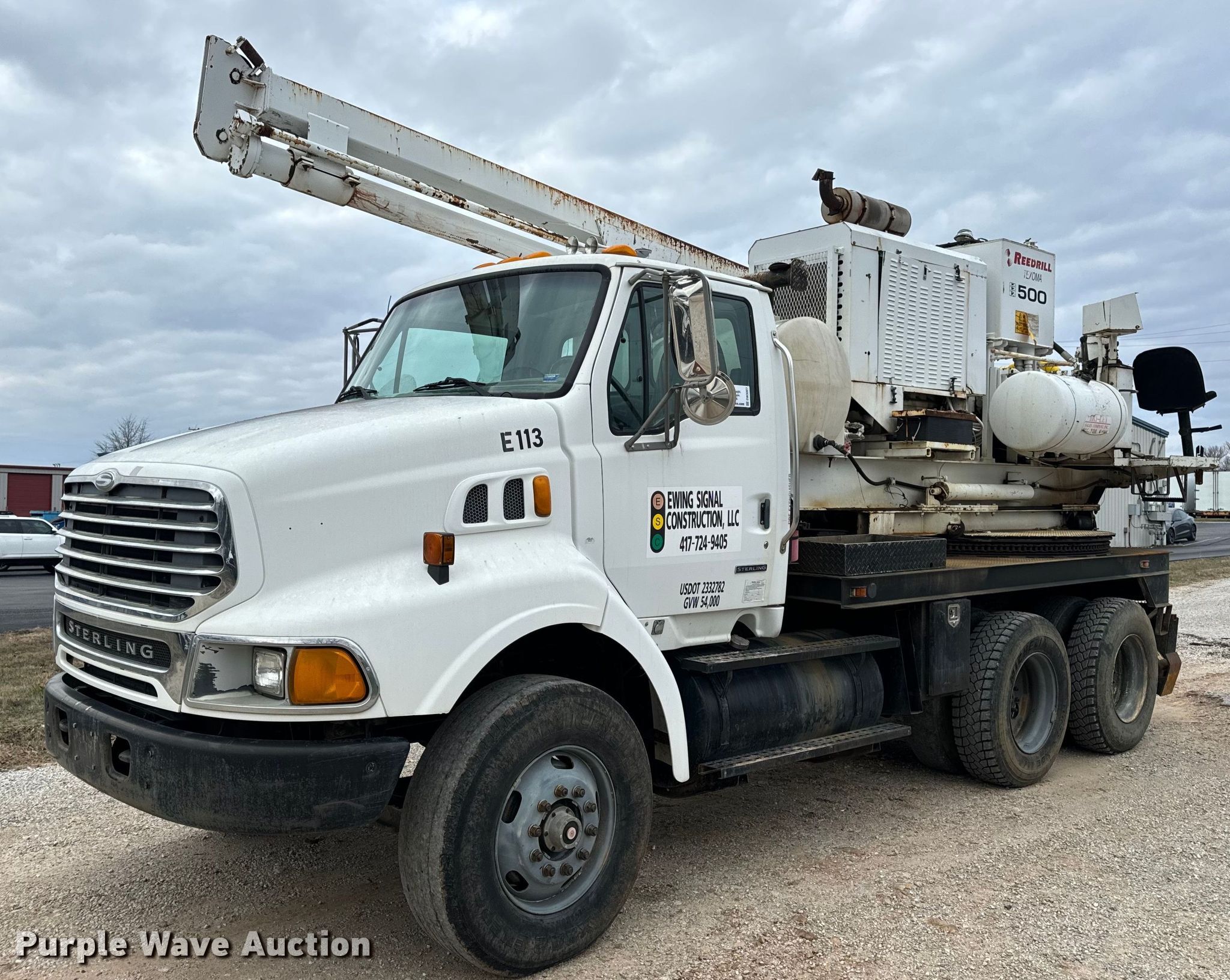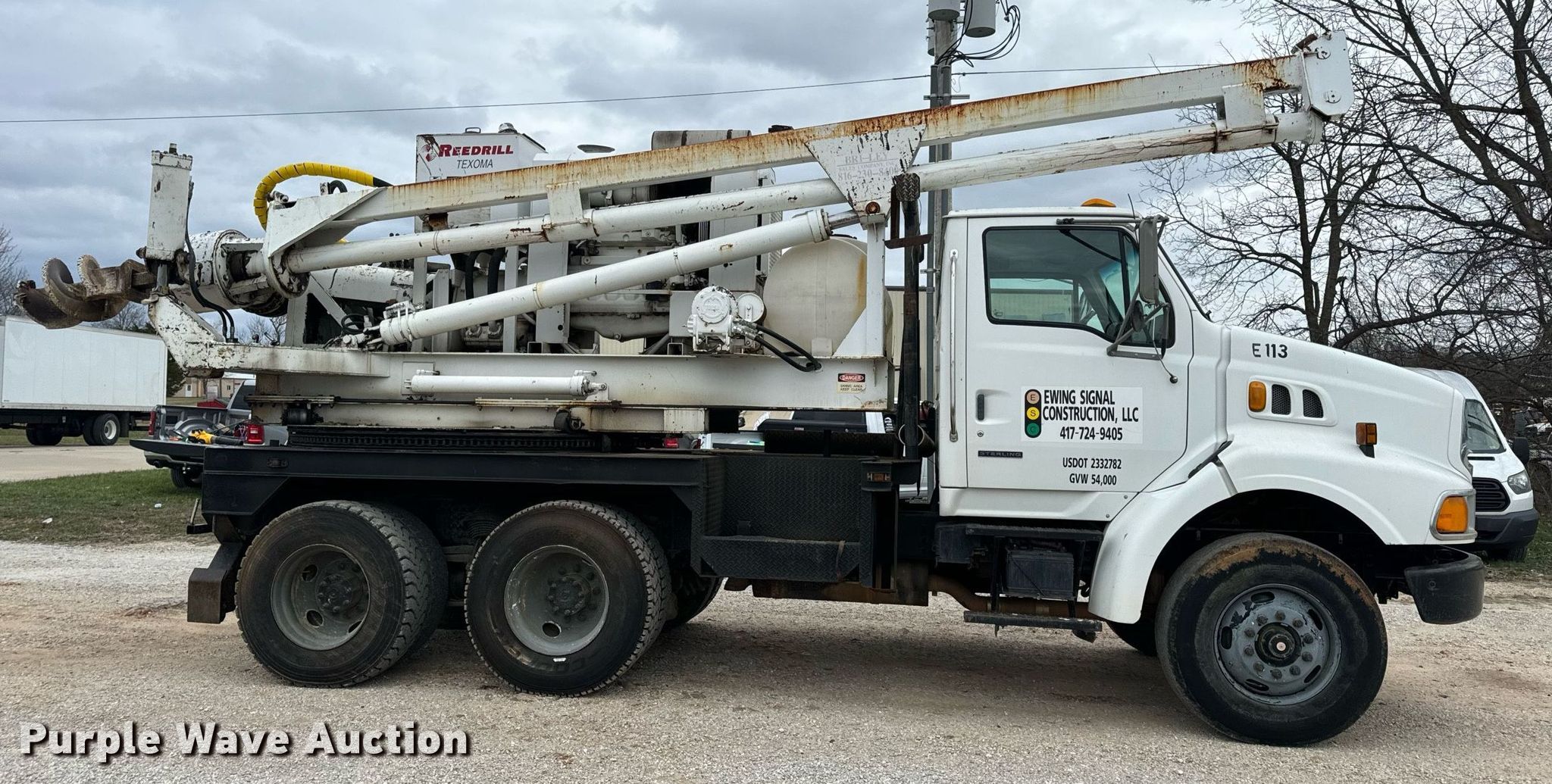 2002 Sterling L-Line pressure digger truck. Miles: 79,795 on odometer, Hours: 4,987 on meter, VIN: 2FZHAZAN12A94260, Unit #: E113. Engine Caterpillar C-10, Serial: 3CS24382, Displacement: 10.3L, Cylinders: 6, Fuel type: Diesel, HP: 350. Transmission Eaton Fuller Roadranger, Manual, Speed: 10. Chassis Axles: Tandem, Suspension: Spring over walking beam, Brakes: Air, PTO, GVWR: 56,000 lbs. Interior AC, Heat, Cruise control. Features Bed 13' L x 96" W, Engine John Deere 6068DF150, Serial: PE6068D156882, Displacement: 6.8L, Cylinders: 6, Fuel: Diesel, Hours: 3,188, Boom Reedrill 500, Serial: 1W26Z76, Boom length: 15', Boom type: Telescopic, Boom controls Platform/ basket, Pressure digger, Auger. Tires Front: 315/80R22.5, Rear: 11R22.5. Notes Dash warning indicator: Engine warning, Non-operational winch. Arkansas title. Title distribution may be delayed up to 30 days from verification of funds. Ewing Signal Construction LLC. - Open Inspection February 21 and 26. 1730 N Gregory. Nixa, MO 65714