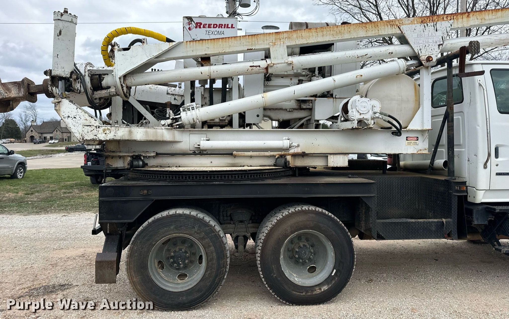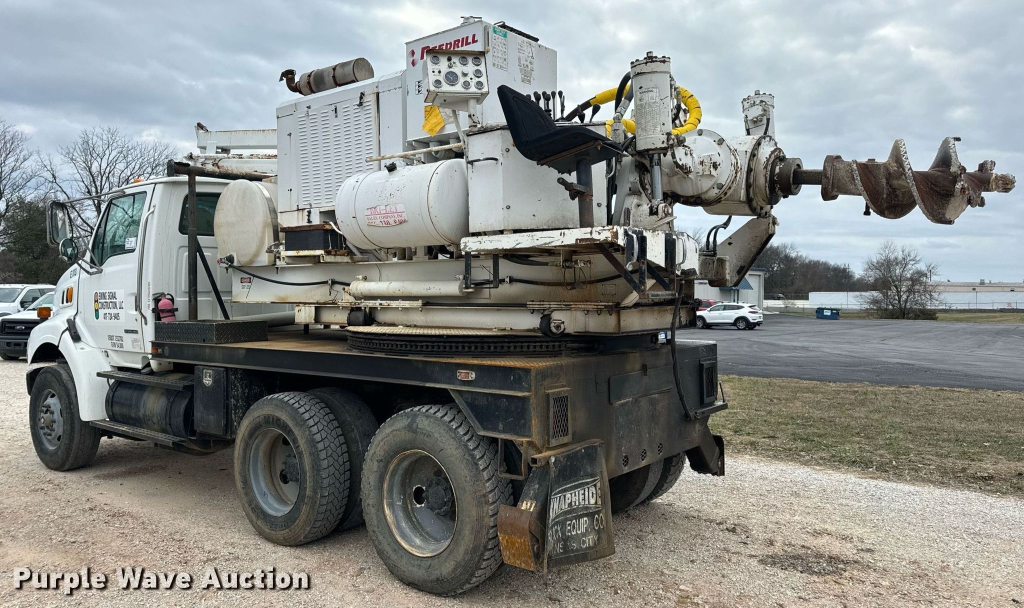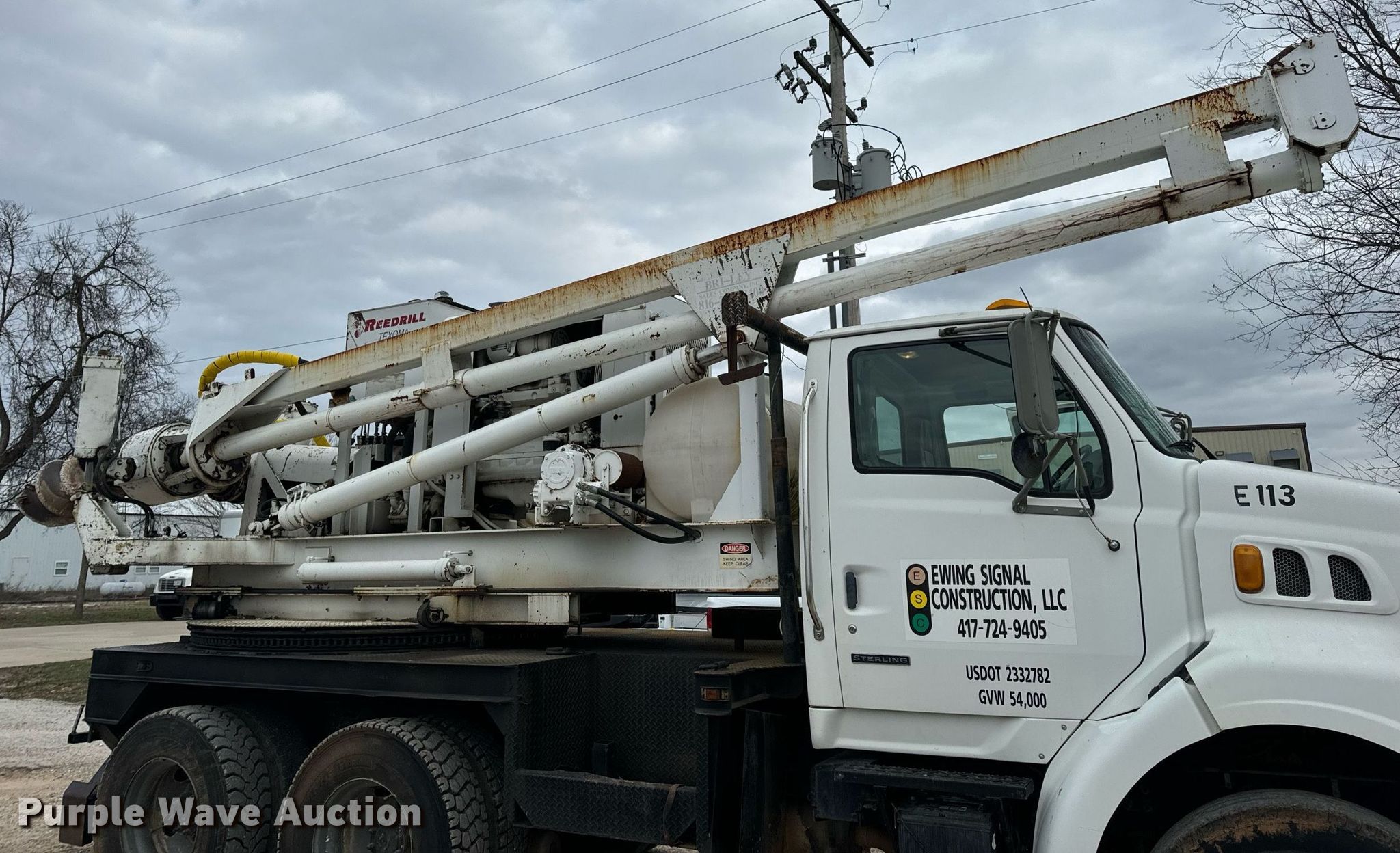 2002 Sterling L-Line pressure digger truck. Miles: 79,795 on odometer, Hours: 4,987 on meter, VIN: 2FZHAZAN12A94260, Unit #: E113. Engine Caterpillar C-10, Serial: 3CS24382, Displacement: 10.3L, Cylinders: 6, Fuel type: Diesel, HP: 350. Transmission Eaton Fuller Roadranger, Manual, Speed: 10. Chassis Axles: Tandem, Suspension: Spring over walking beam, Brakes: Air, PTO, GVWR: 56,000 lbs. Interior AC, Heat, Cruise control. Features Bed 13' L x 96" W, Engine John Deere 6068DF150, Serial: PE6068D156882, Displacement: 6.8L, Cylinders: 6, Fuel: Diesel, Hours: 3,188, Boom Reedrill 500, Serial: 1W26Z76, Boom length: 15', Boom type: Telescopic, Boom controls Platform/ basket, Pressure digger, Auger. Tires Front: 315/80R22.5, Rear: 11R22.5. Notes Dash warning indicator: Engine warning, Non-operational winch. Arkansas title. Title distribution may be delayed up to 30 days from verification of funds. Ewing Signal Construction LLC. - Open Inspection February 21 and 26. 1730 N Gregory. Nixa, MO 65714
