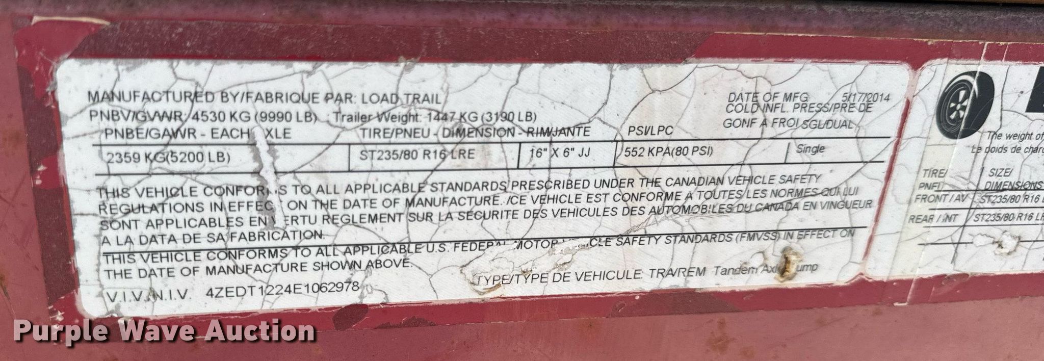Purple Wave is selling a used Dump Trailer in Missouri. This item is a 2014 Load Trail dump trailer with the following: VIN: 4ZEDT1224E1062978, Unit #: E95