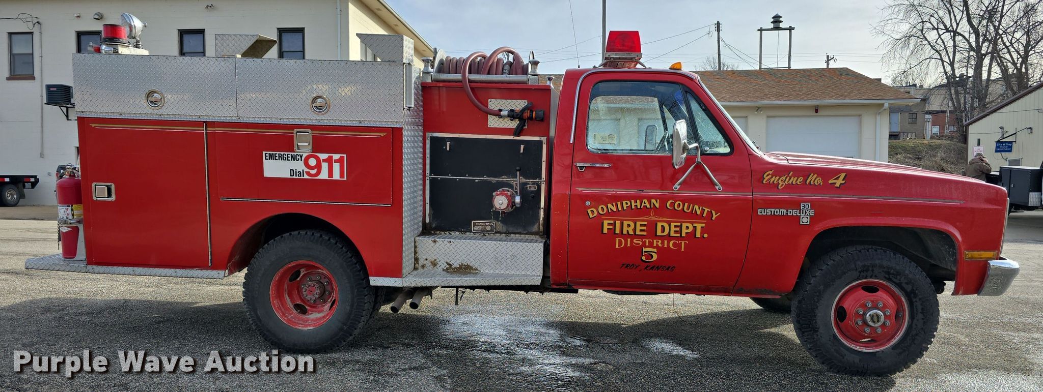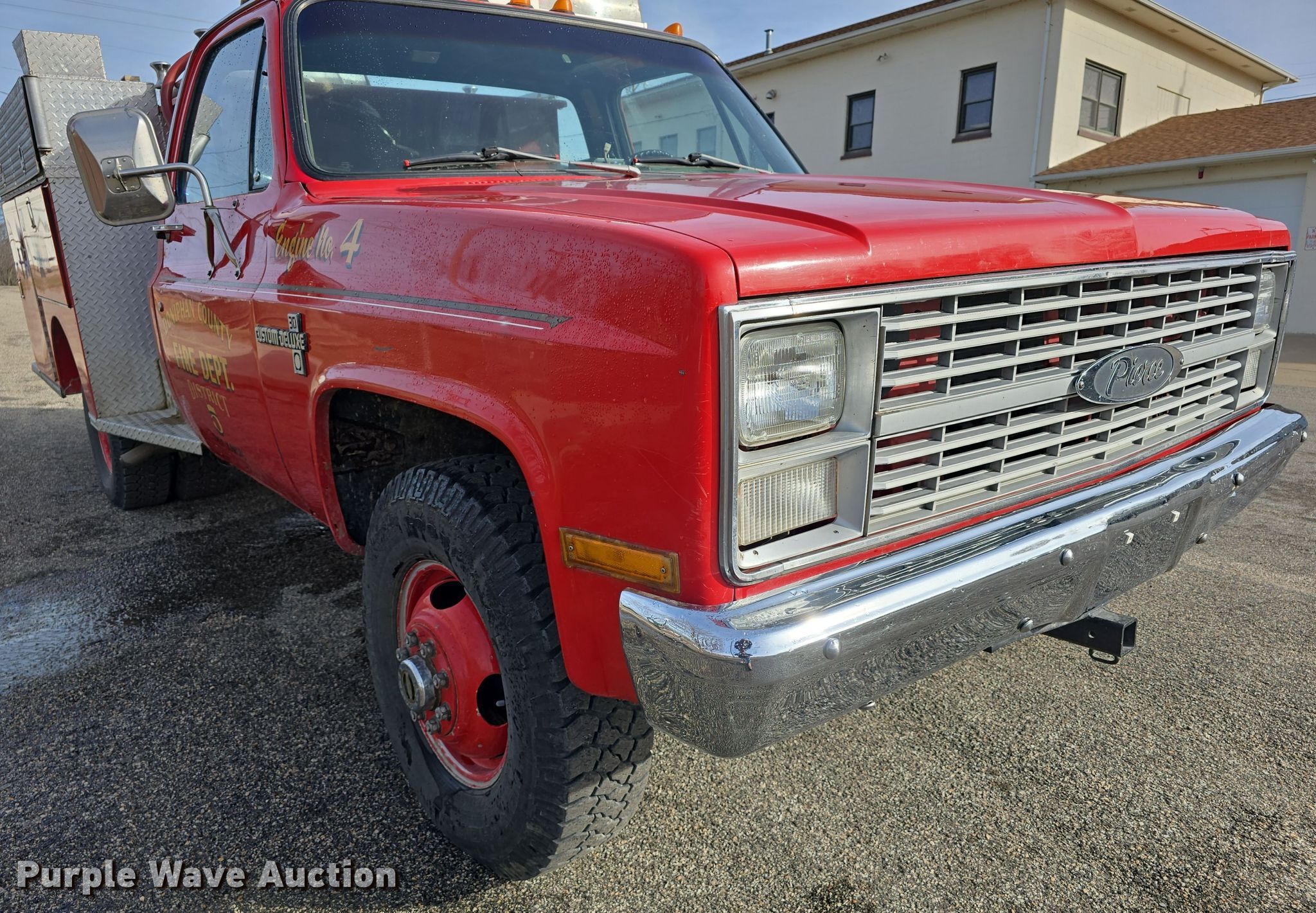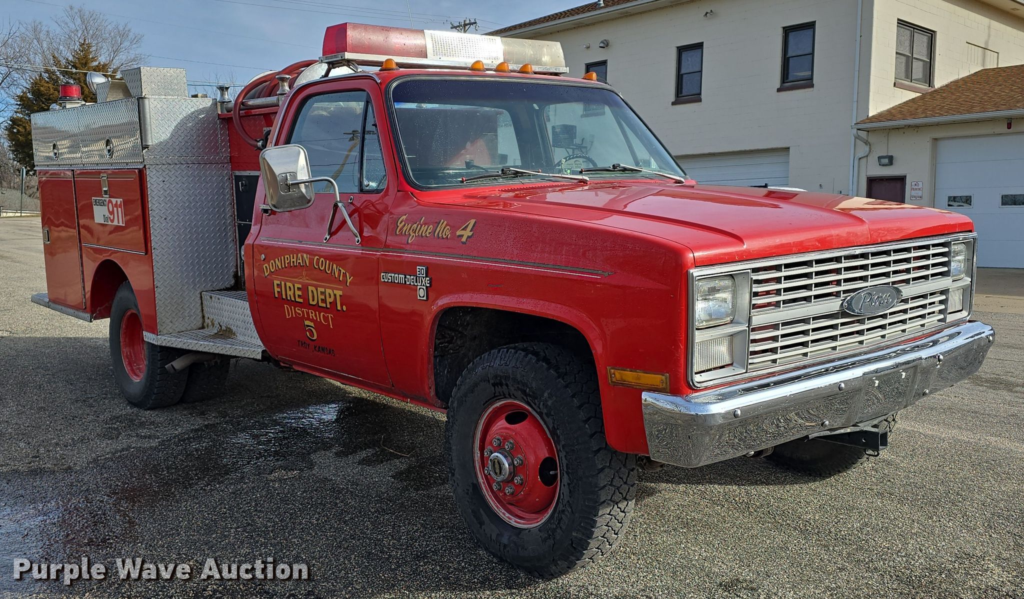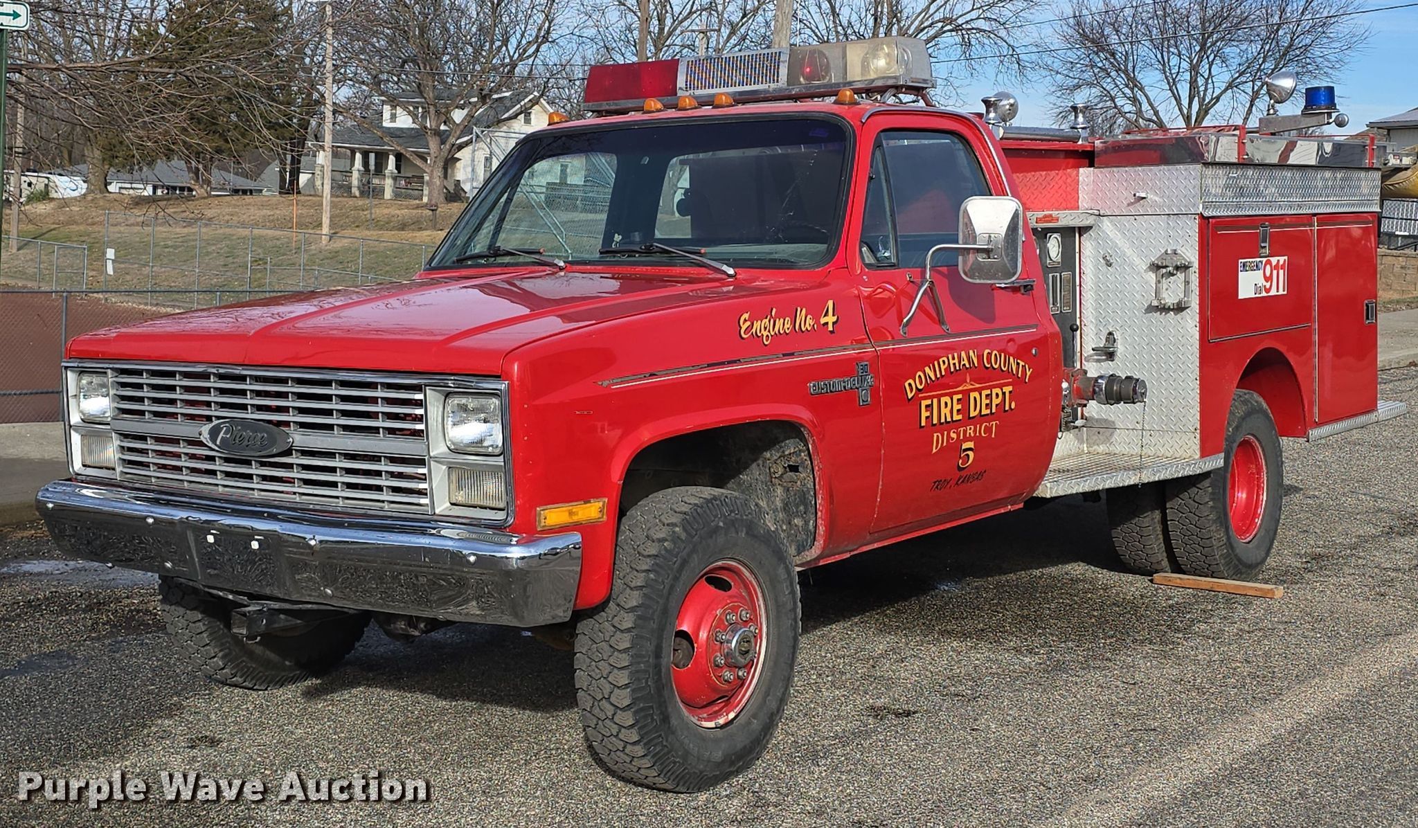 Purple Wave is selling a used Fire Truck or Emergency Vehicle in Kansas. This item is a 1983 Chevrolet Custom Deluxe 30 pumper fire truck with the following: Miles: 65,067 on odometer, Miles or hours may vary, unit still in use, VIN: 1GBJK34W4DV122923