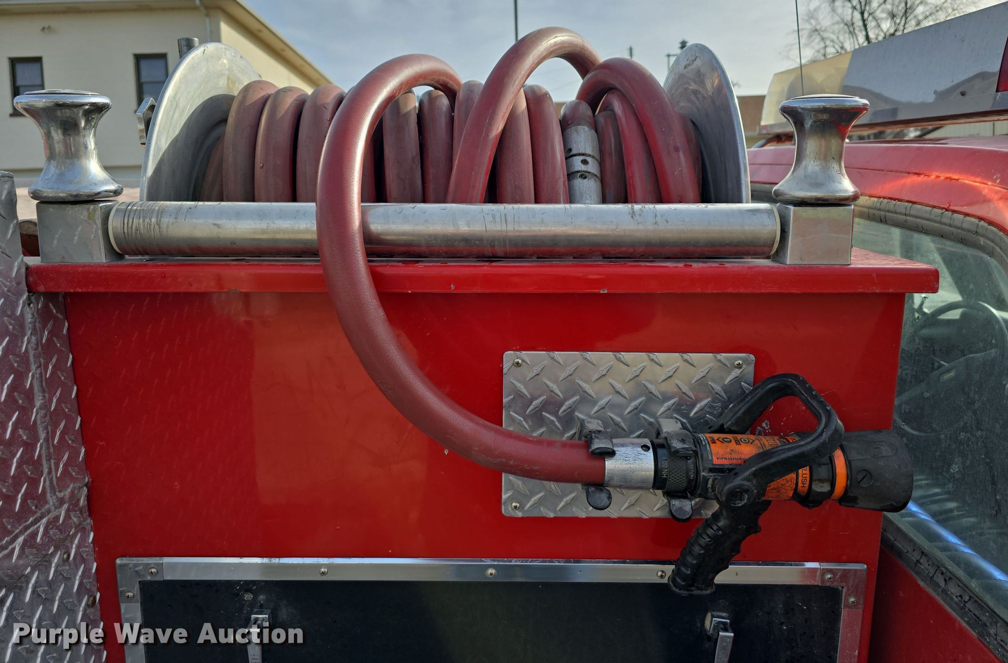 • Yellow fire hose, hose nozzle on hose reel, and contents not included