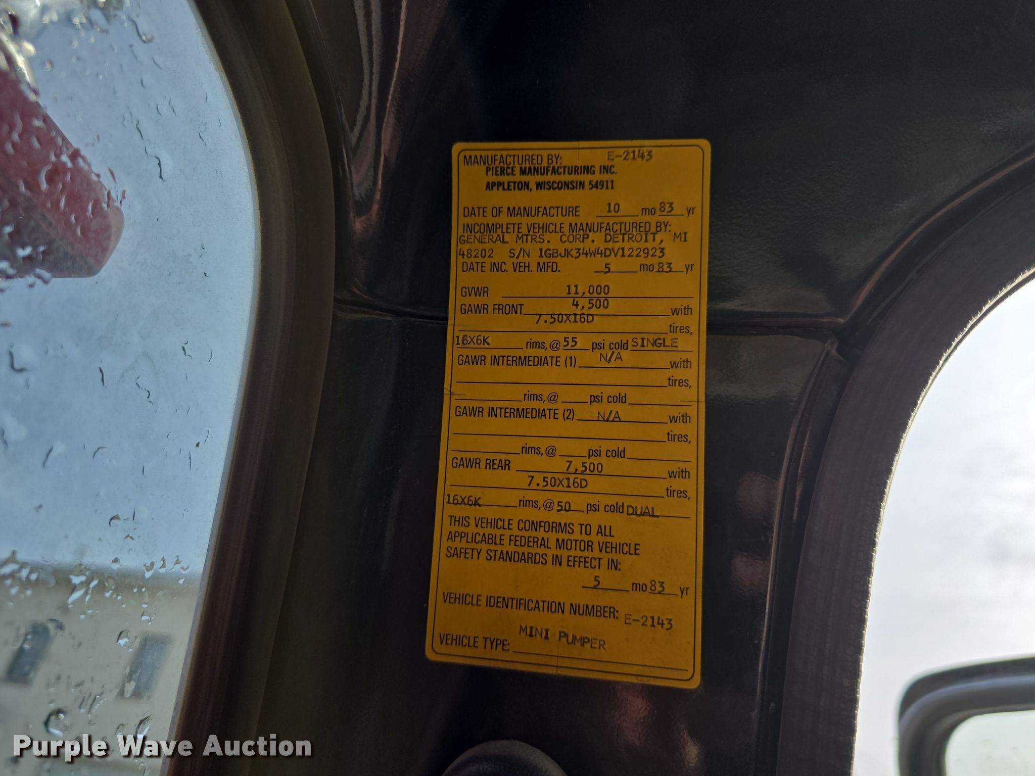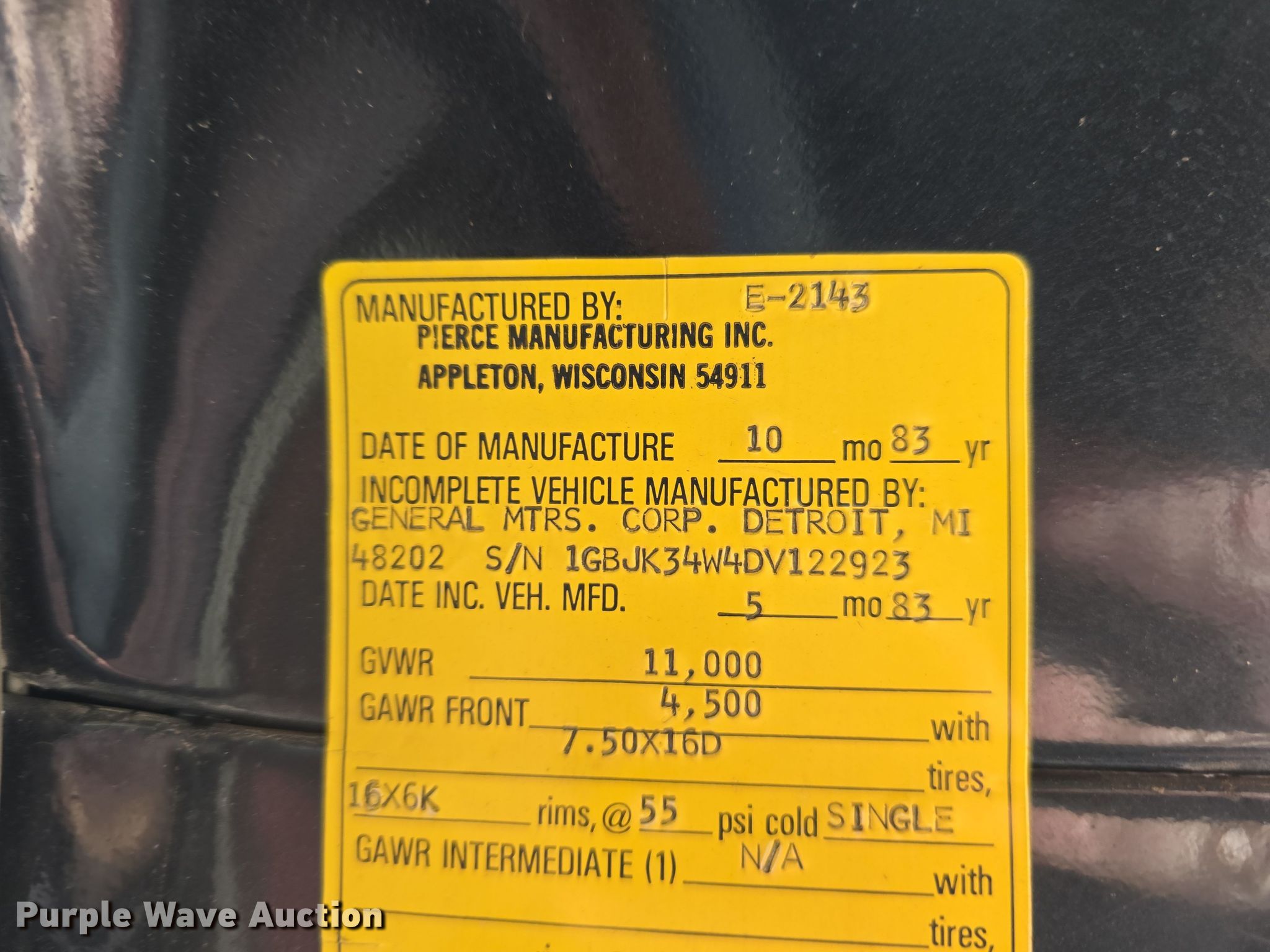 1983 Chevrolet Custom Deluxe 30 pumper fire truck. Miles: 65,067 on odometer, Miles or hours may vary, unit still in use, VIN: 1GBJK34W4DV122923. Engine Displacement: 7.4L V8 OHV, Cylinders: 8, Fuel type: Gas. Transmission Manual, Speed: 4. Chassis Four wheel drive, Axles: Single, Suspension: Spring, Brakes: Hydraulic, GVWR: 11,000 lbs, Wheelbase: 136". Interior Heat, Auxiliary controls. Features PTO, Fire truck body Pierce, Pump 400 gpm, Ground ladder, PA/ siren controls. Tires Size: 235/85R16. Notes Ladder and hose on reel included, Yellow fire hose, hose nozzle on hose reel, and contents not included. Kansas title. Title distribution may be delayed up to 14 days from verification of funds. Doniphan County Rural Fire District #5. Troy, KS 66087
