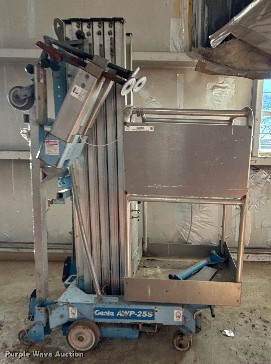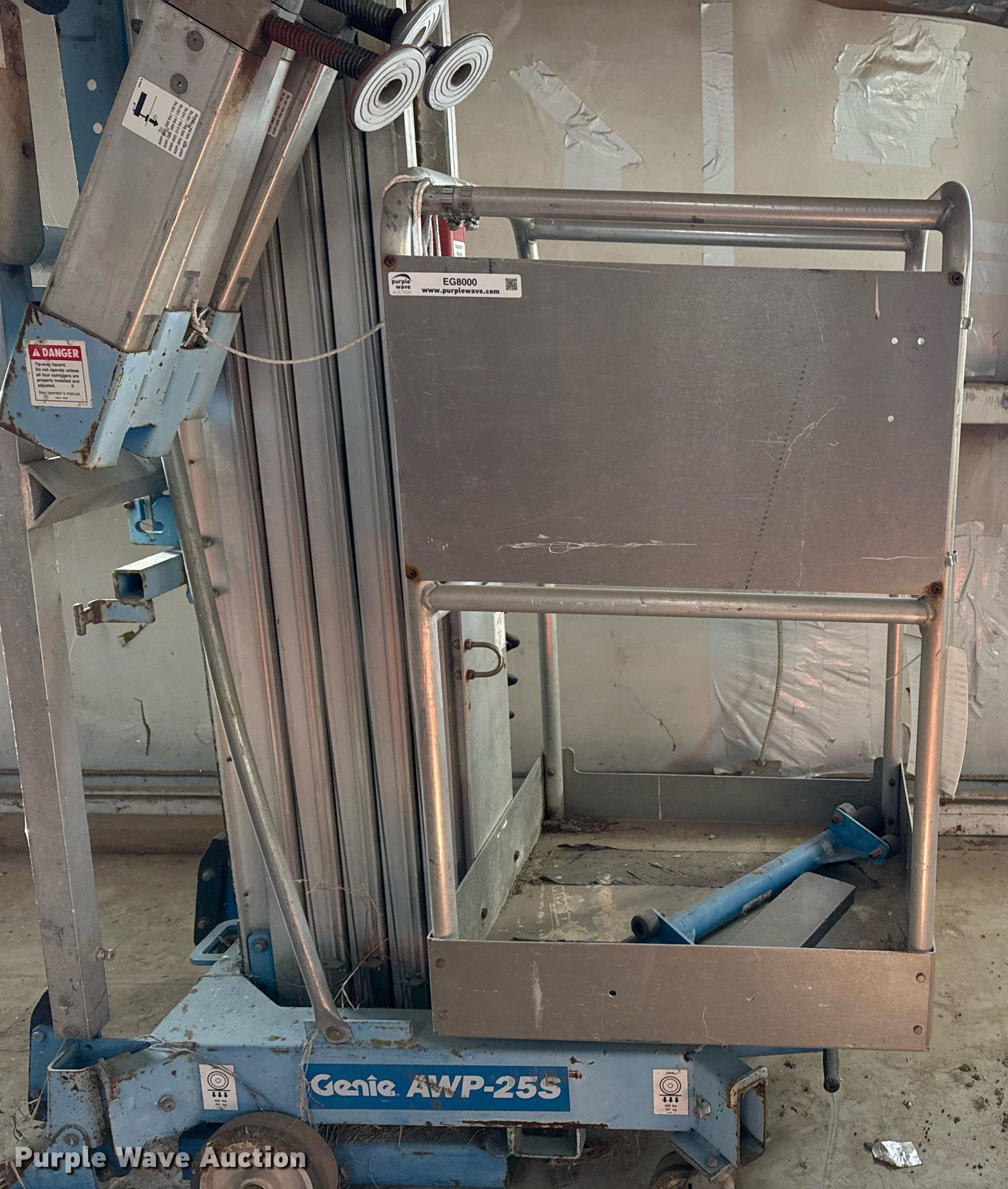 2005 Genie AWP-25S vertical lift. Hours: Unknown, Serial: AWP0535473. Electric Motor kW: 1.8. Features Maximum lift capacity: 350 lbs, Maximum lift height: 24', Platform: 27" L x 26" W, AC power outlet, Controls: Platform, Ground. Notes Unknown operating condition. City of Glenpool. Glenpool, OK 74033