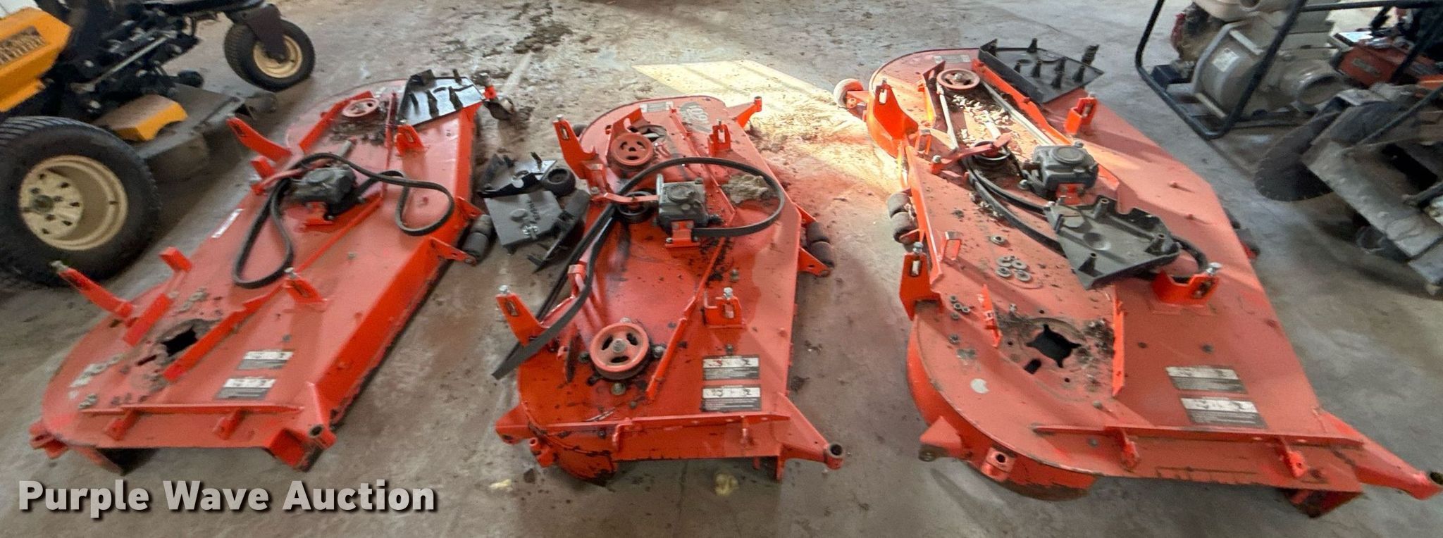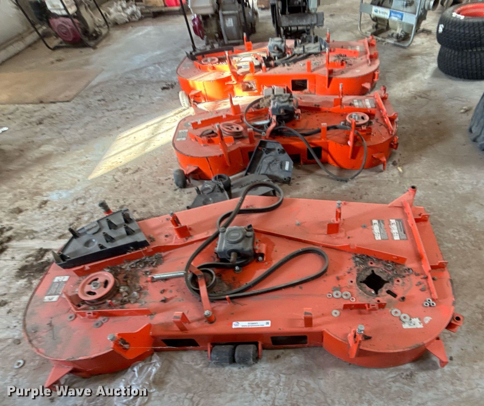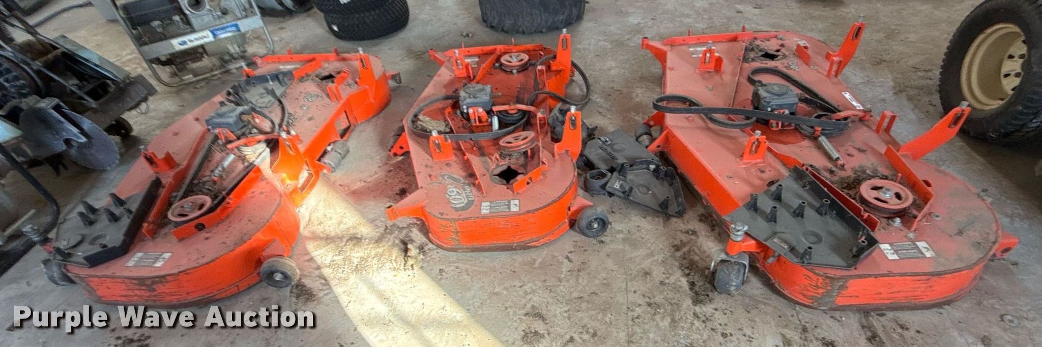 Purple Wave is selling a used Lawn and Garden in Oklahoma. This item is a (3) Kubota mower decks with the following: Mower deck, (2) width: 72", Width: 60"