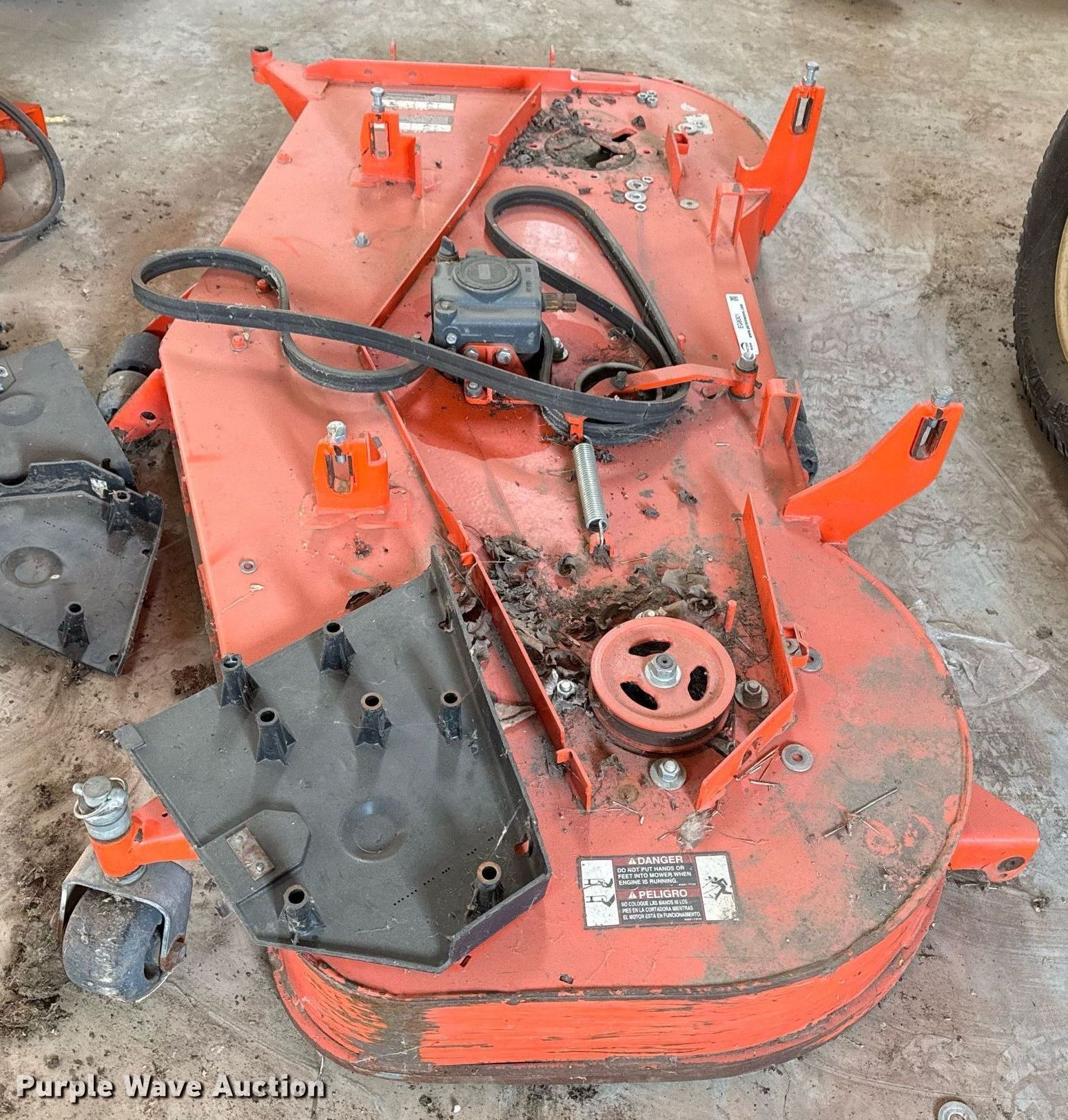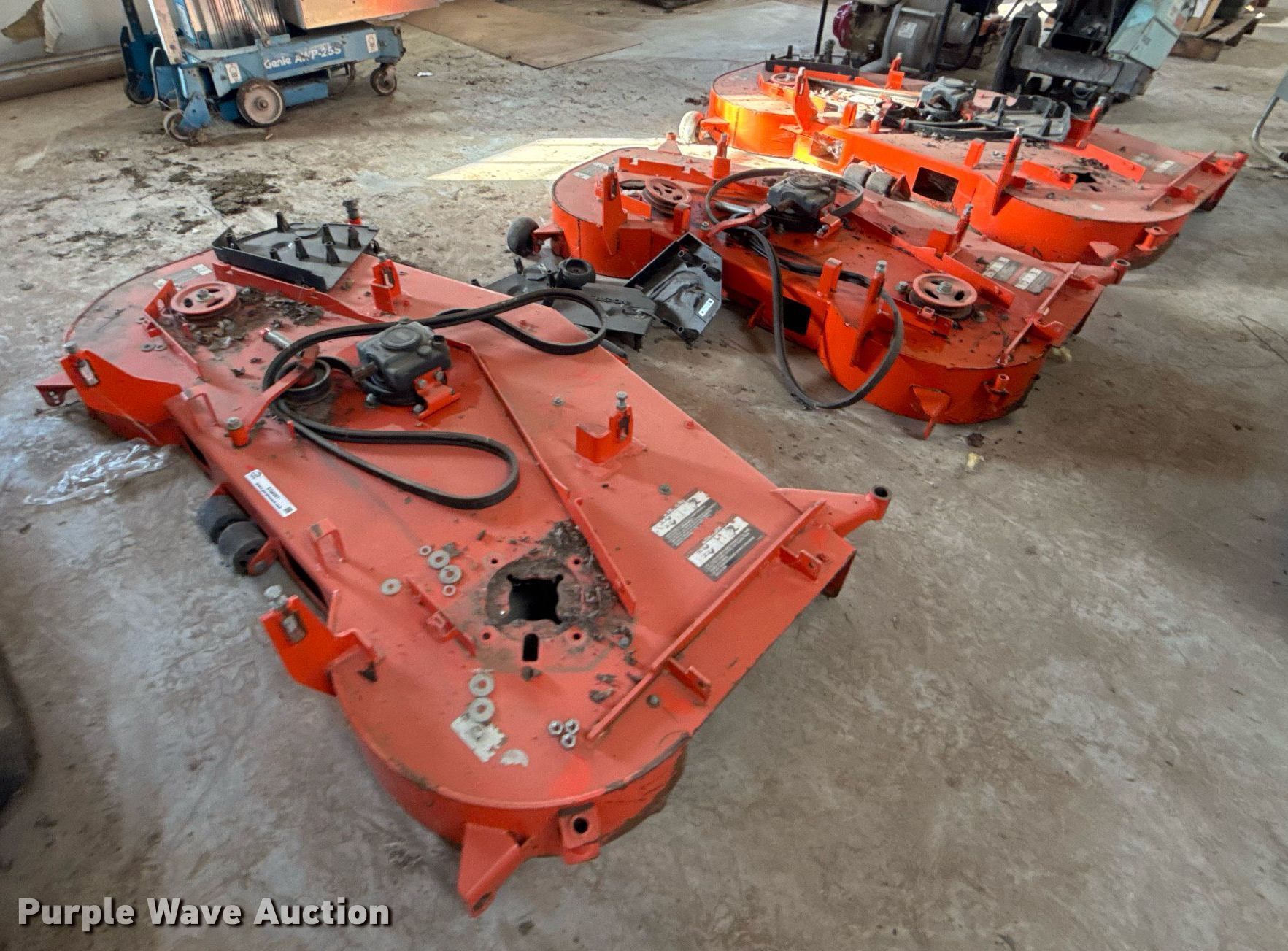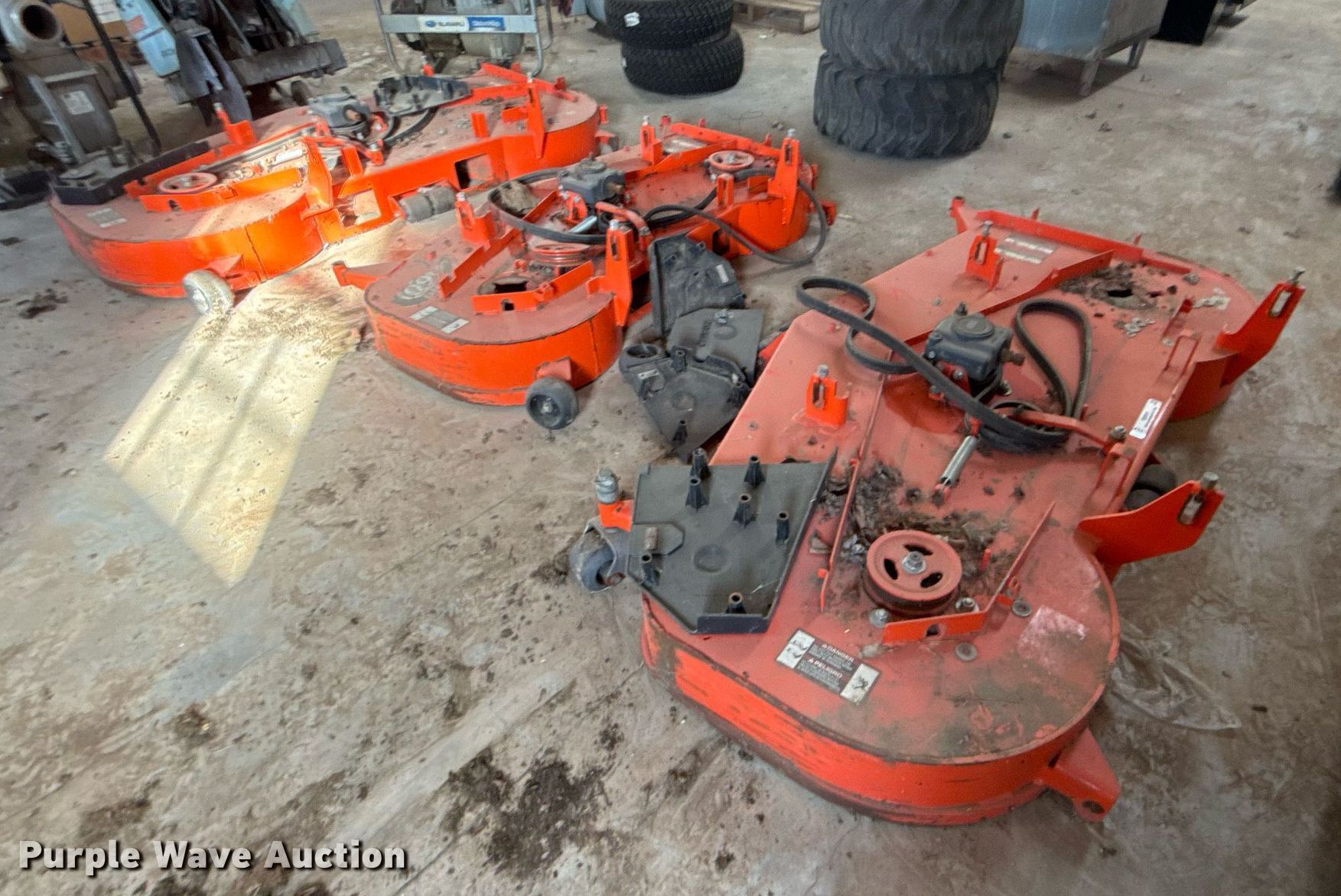 Purple Wave is selling a used Lawn and Garden in Oklahoma. This item is a (3) Kubota mower decks with the following: Mower deck, (2) width: 72", Width: 60"