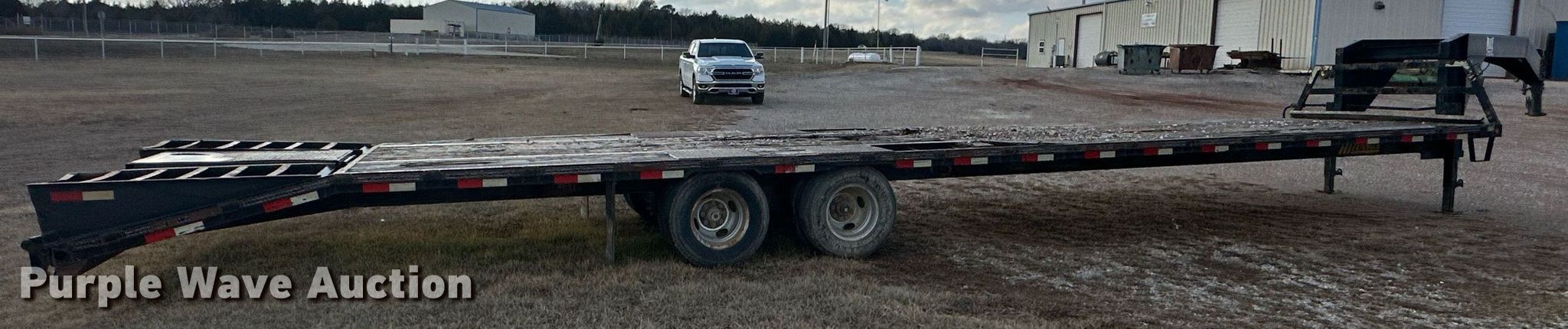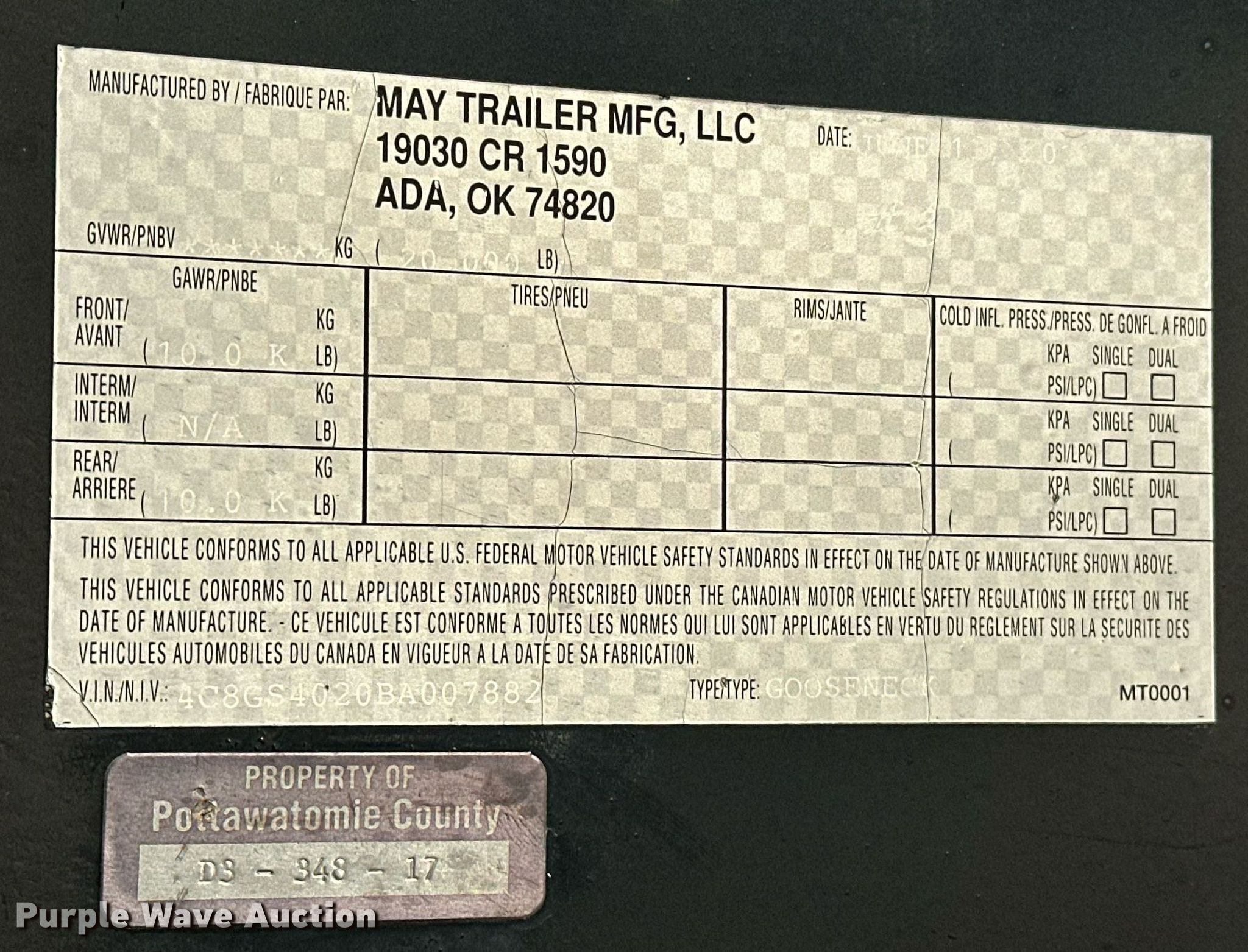 2011 May Trailer equipment trailer. VIN: 4C8GS4020BA007882. Dimensions Overall: 48' 6" L x 101" W, Deck: 35' L x 97" W, Tail length: 5', Ramps: Manual Length: 5'. Features Deck type: Wood. Chassis Hitch: Gooseneck, Landing gear: Dual, Suspension: Spring, Brakes: Electric, Axles: Tandem, GVWR: 20,000 lbs, GAWR: 10,000 lbs. Tires Steel wheels, Size: ST235/80R16. Notes Runner lights missing, Deck boards damaged, Wiring issues, connector needs replaced. Oklahoma title. Title distribution may be delayed up to 14 days from verification of funds. Pottawatomie County, OK. Maud, OK 74854
