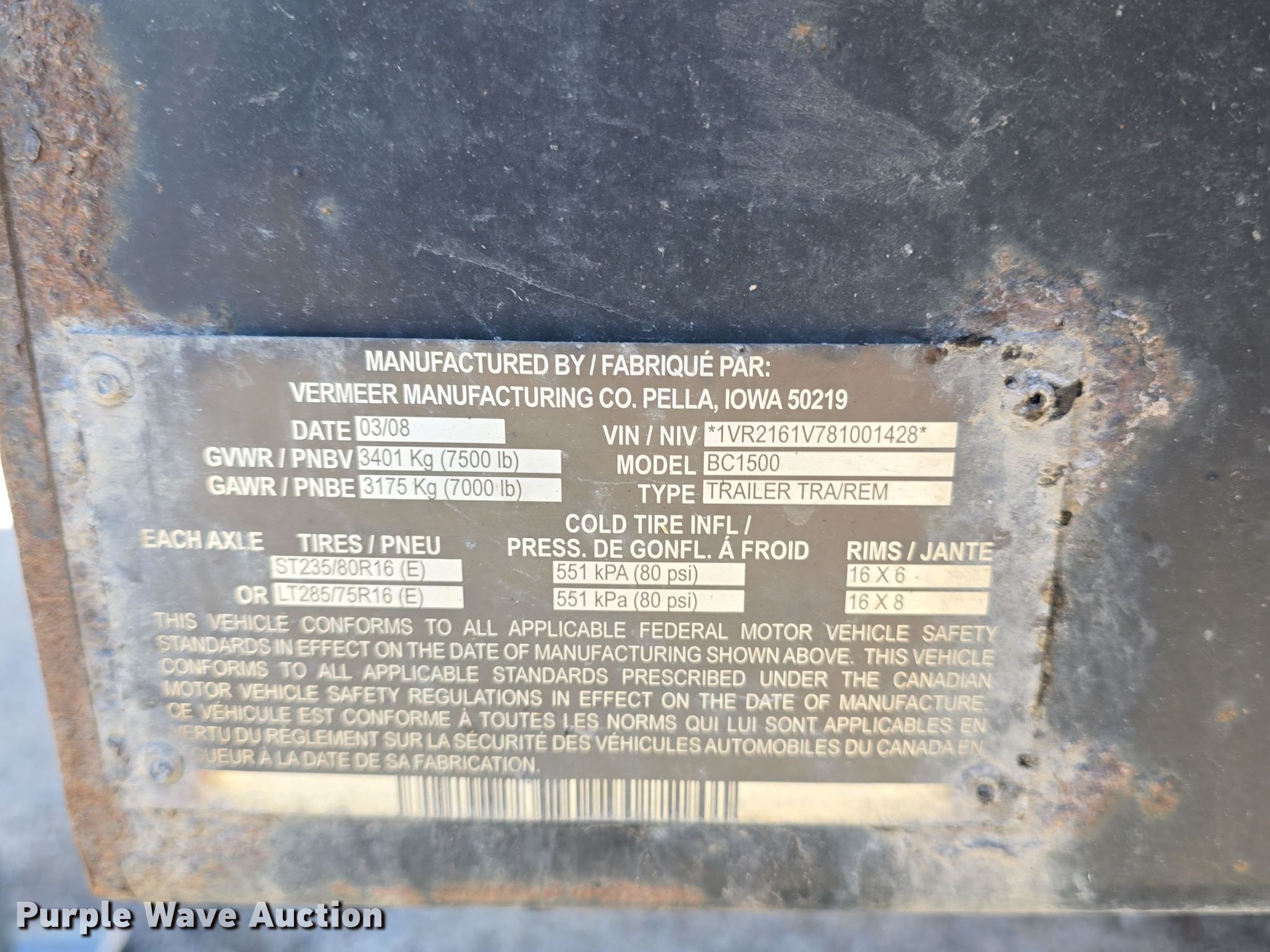 Purple Wave is selling a used Wood Chipper or Stump Grinder in Kansas. This item is a 2008 Vermeer BC1500 wood chipper with the following: VIN: 1VR2161V781001428