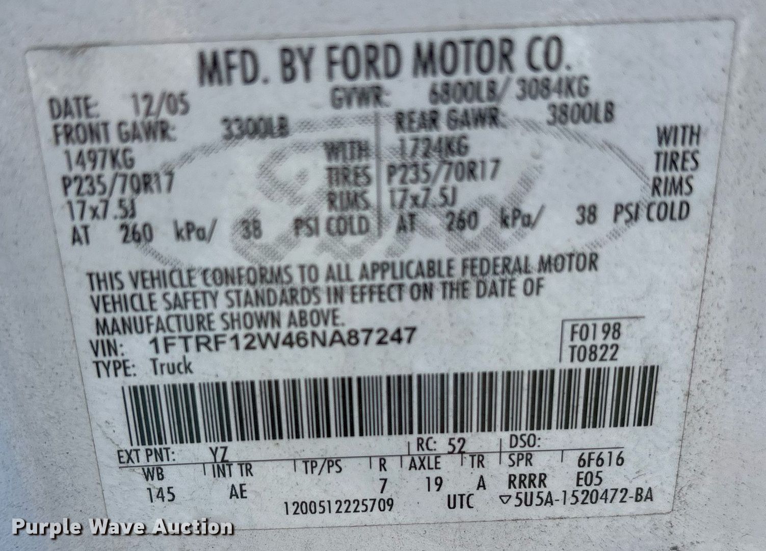Purple Wave is selling a used 1/2 Ton Pickup or Van in Oklahoma. This item is a 2006 Ford F150 pickup truck with the following: Miles: 52,743 on odometer, VIN: 1FTRF12W46NA87247, Unit #: 517