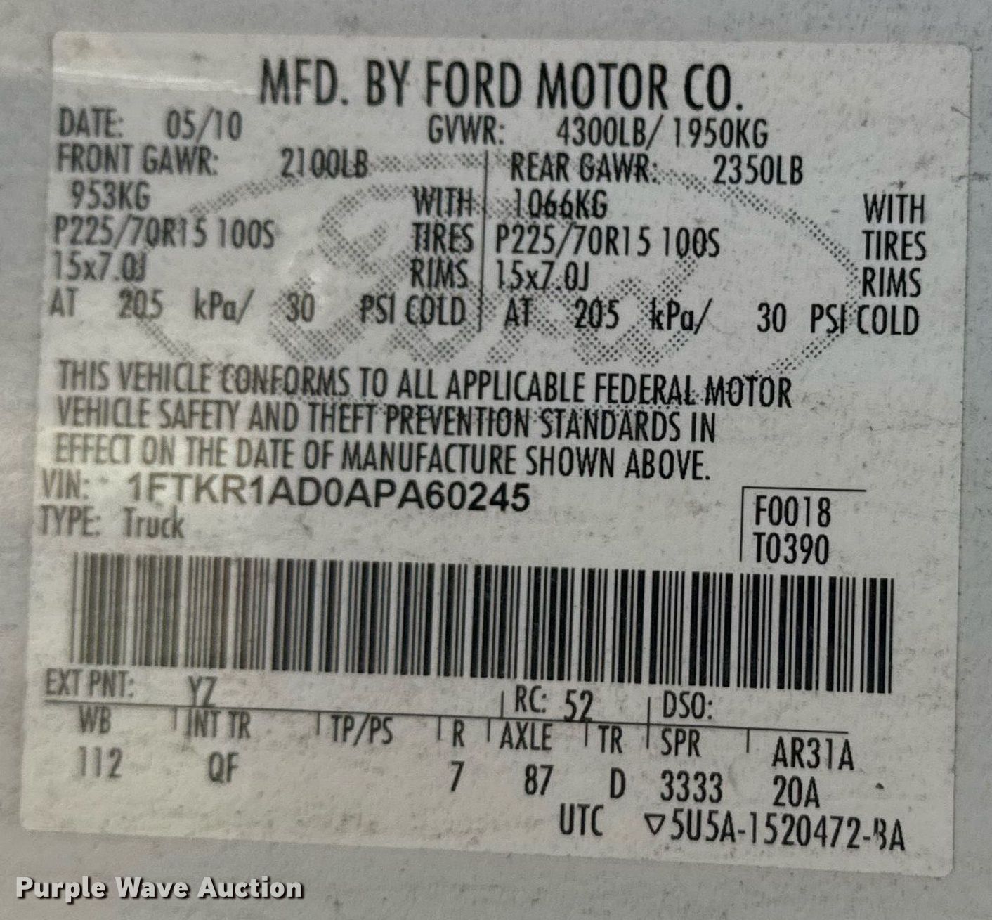 Purple Wave is selling a used Compact Pickup or Van in Oklahoma. This item is a 2010 Ford Ranger pickup truck with the following: Miles: 27,763 on odometer, VIN: 1FTKR1AD0APA60245, Unit #: 502