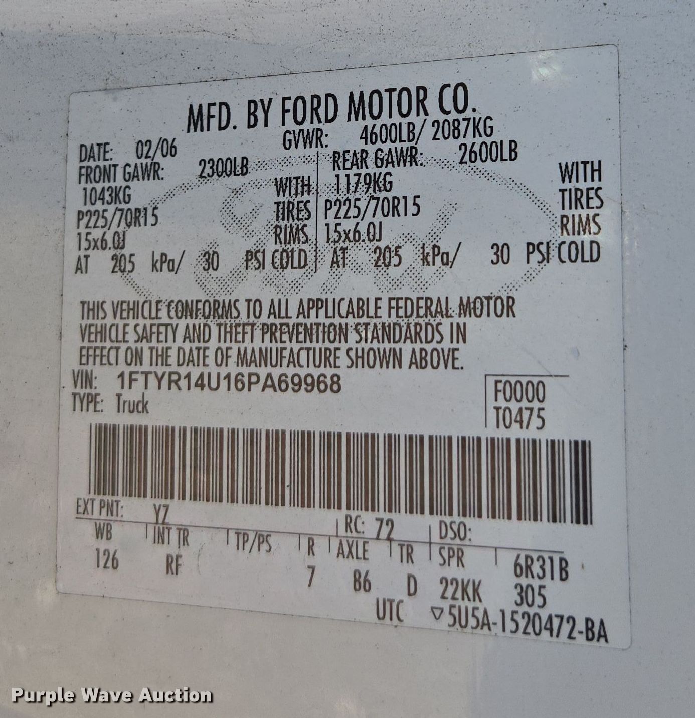 2006 Ford Ranger SuperCab pickup truck. Miles: 54,613 on odometer, VIN: 1FTYR14U16PA69968, Lot #: 43772025. Engine Displacement: 3.0L V6 OHV, Cylinders: 6, Fuel type: Gas. Transmission Automatic. Interior AC, Heat. Tires Size: 225/70R15. Secured storage hosted by a Copart facility. Please review REQUIRED REMOVAL INSTRUCTIONS. Buyer responsible for all aspects of state emissions compliance. Titles will be distributed after confirmation of payment and removal. California title. Title distribution may be delayed up to 30 days from verification of funds. City of Pittsburg. Fairfield, CA 94534