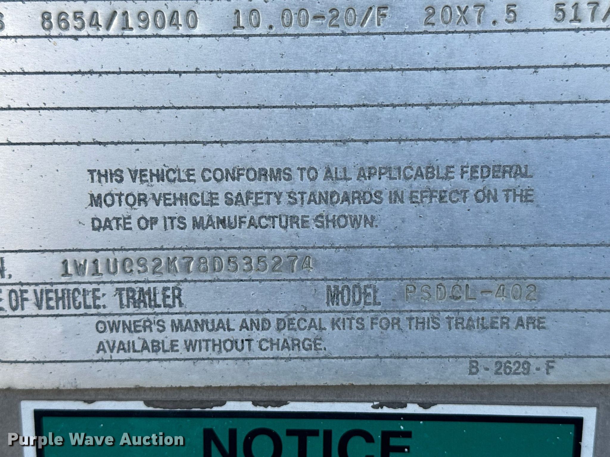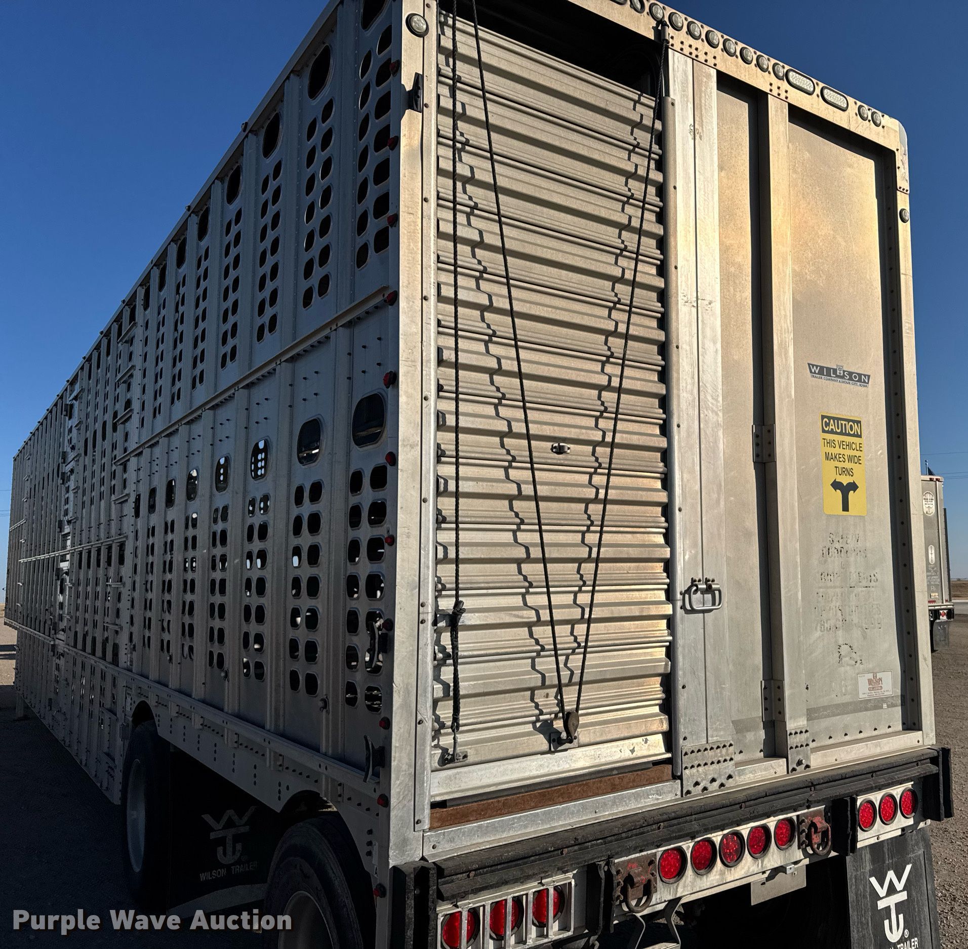 2008 Wilson PSDCL 402 livestock trailer. VIN: 1W1UCS2K78D535274. Dimensions Overall: 53' L x 102" W, Body: 53' L x 102" W. Features Decks: Two, Center gates: 1. Chassis Suspension: Air, Brakes: Air, Axles: Tandem, Spread, GVWR: 75,000 lbs, GAWR: 19,040 lbs. Tires Aluminum wheels, Size: 11R24.5. Kansas title. Title distribution may be delayed up to 14 days from verification of funds. PSI Transport. Hoxie, KS 67740