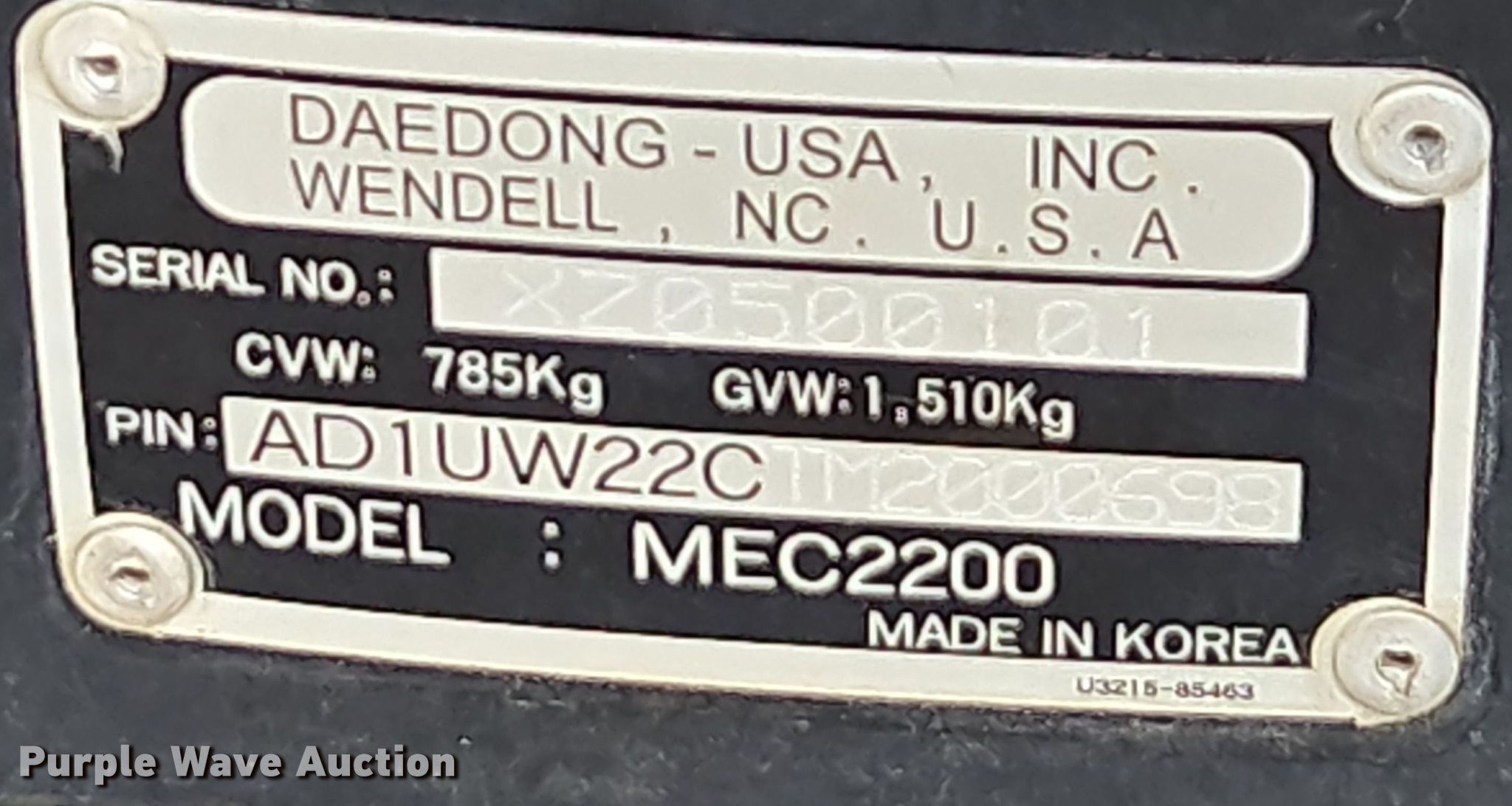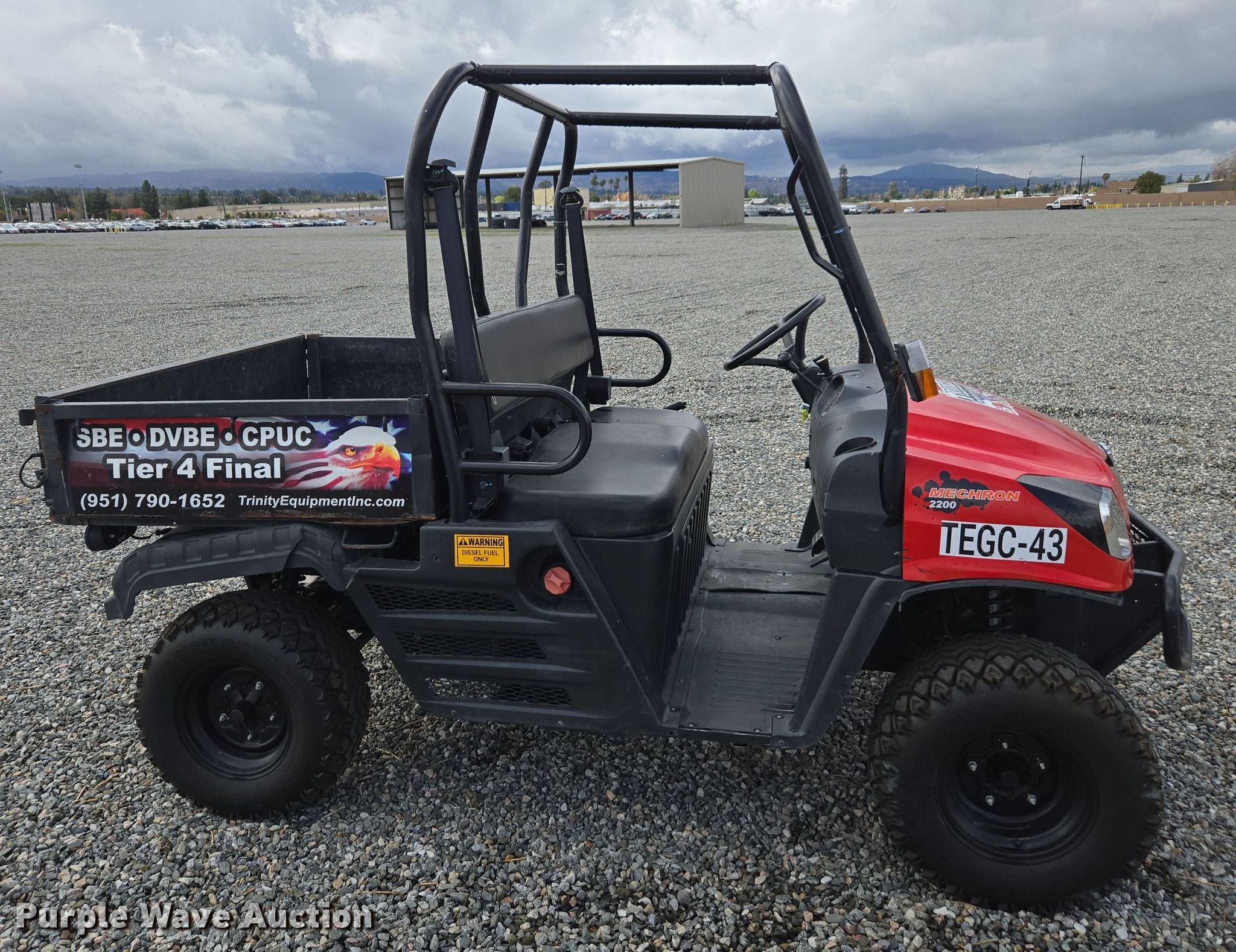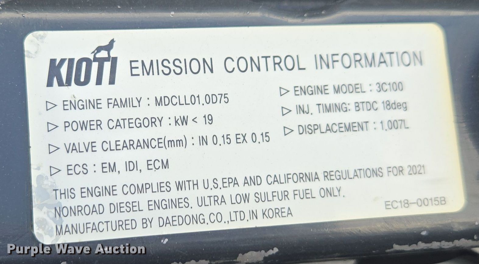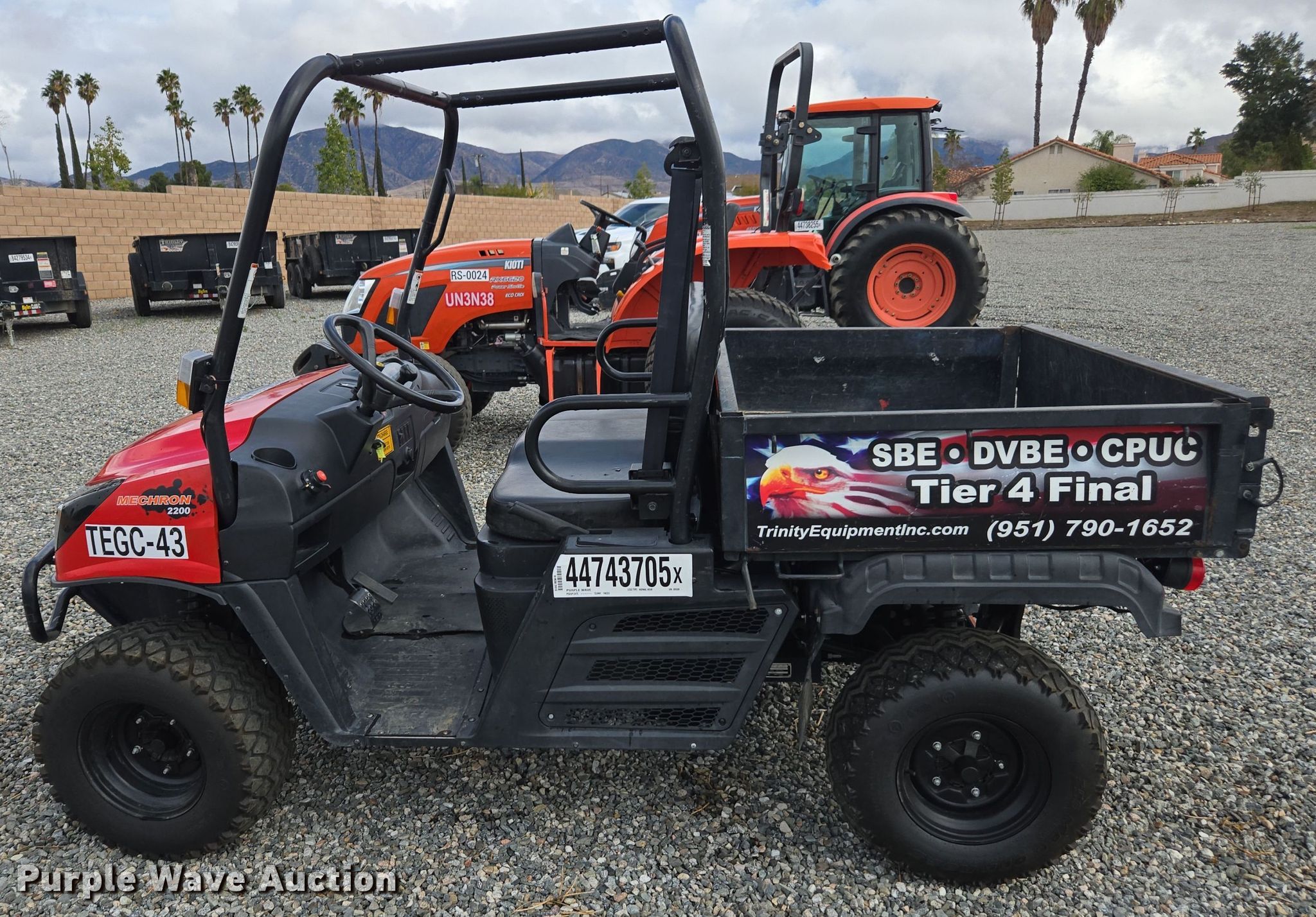 2021 Kioti Mechron 2200 utility vehicle. Hours: 928 on meter, Serial: XZ0500101, Lot #: 44743705. Engine Kioti 3C100, Displacement: 1.007L, Cylinders: 3, Fuel type: Diesel. Transmission Automatic. Chassis Four wheel drive/ All wheel drive. Features Grille guard, Receiver hitch, Dump bed 41" L x 60" W, Dump bed type: Manual. Tires Size: 25x10-12NHS. Secured storage hosted by a Copart facility. Please review REQUIRED REMOVAL INSTRUCTIONS. Transfer of ownership documentation will be a bill of sale. No title will be provided. Trinity Equipment Rentals Inc.. Mentone, CA 92359
