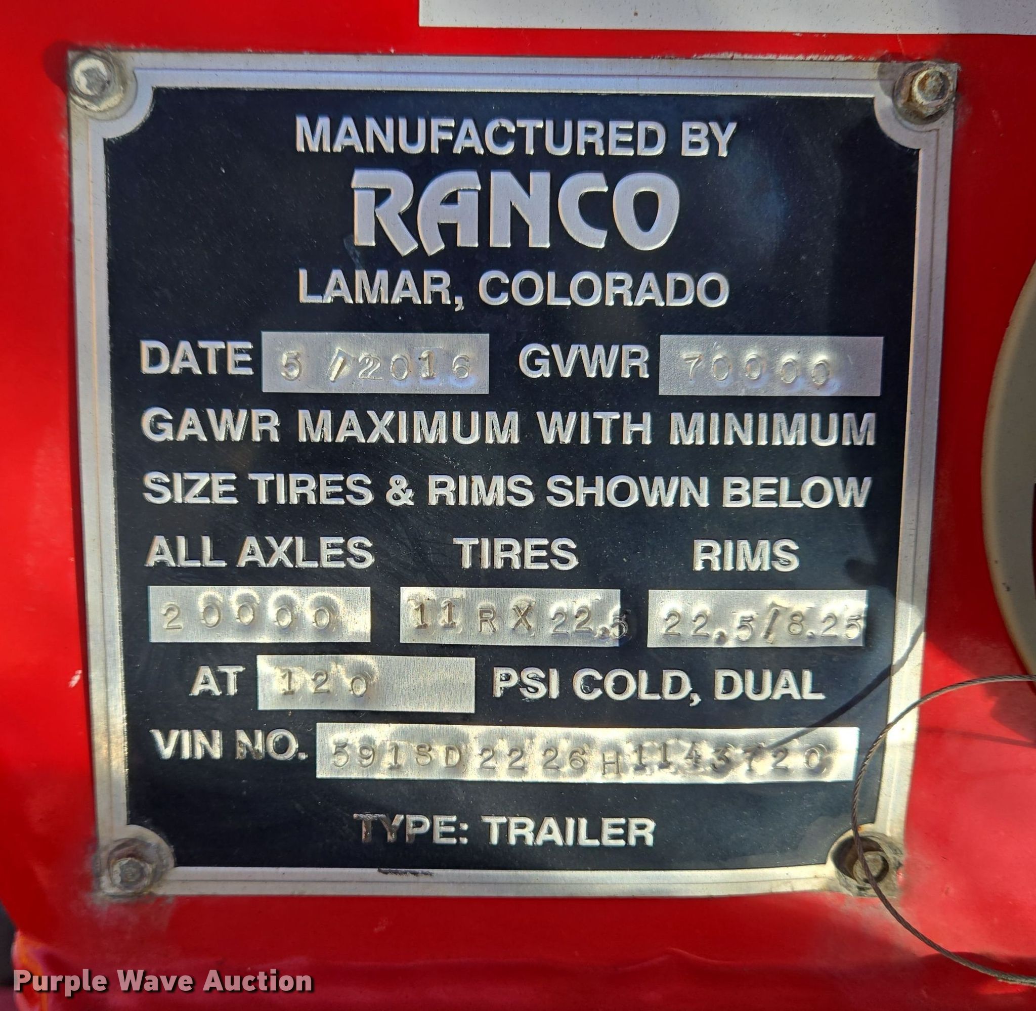 2017 Ranco end dump trailer. VIN: 591SD2226H1143720. Dimensions Overall: 24' L x 96" W, Body: 21' 6" L x 96" W, Side height: 54". Features Body type: Steel, Ram: Single, End gate: Air operated, Roll tarp. Chassis Landing gear: Dual, Suspension: Spring, Brakes: Air, Axles: Tandem, GVWR: 70,000 lbs. Tires Steel wheels, Size: 11R22.5. Notes Semi truck not included. Illinois title. Title distribution may be delayed up to 14 days from verification of funds. Fischer Brothers Construction. Ingleside, IL 60041