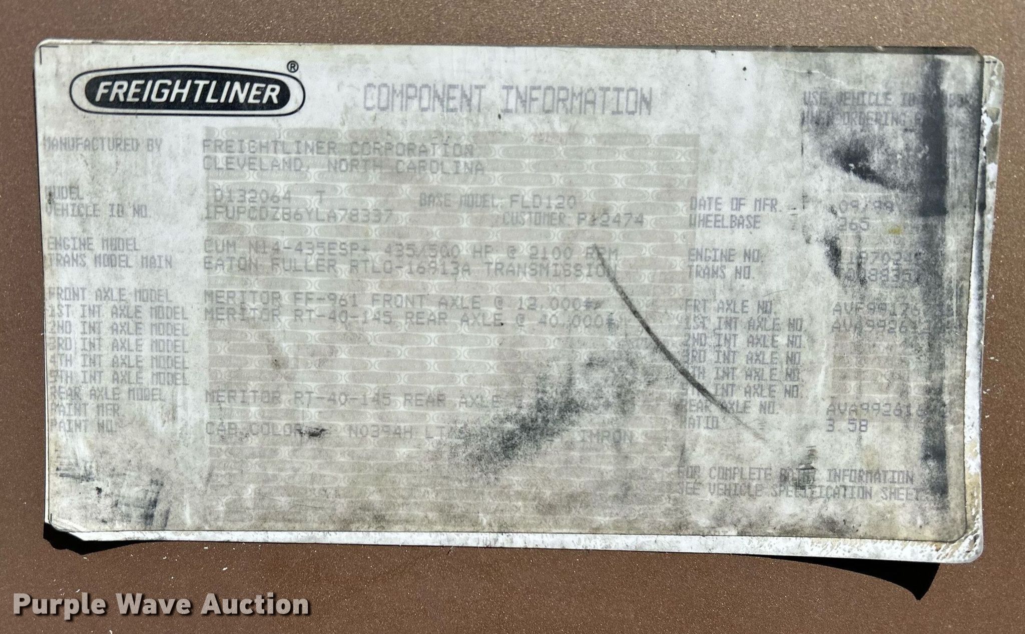 Purple Wave is selling a used Truck Tractor in Texas. This item is a 2000 Freightliner FLD120 semi truck with the following: Miles: 158,415 on odometer, VIN: 1FUPCDZB6YLA78337