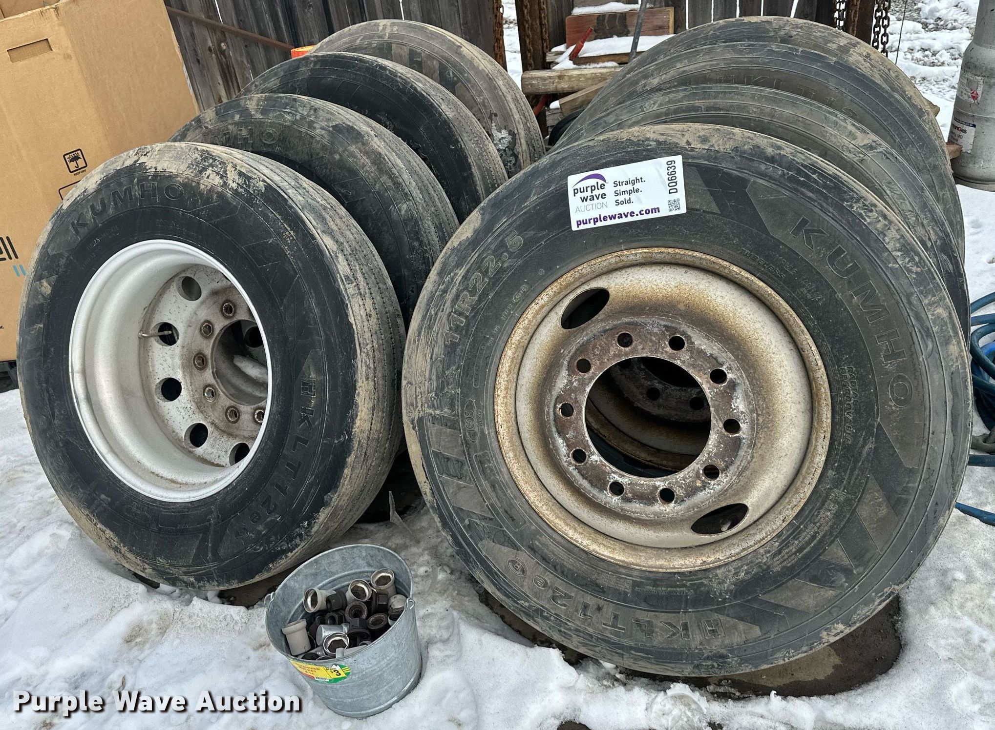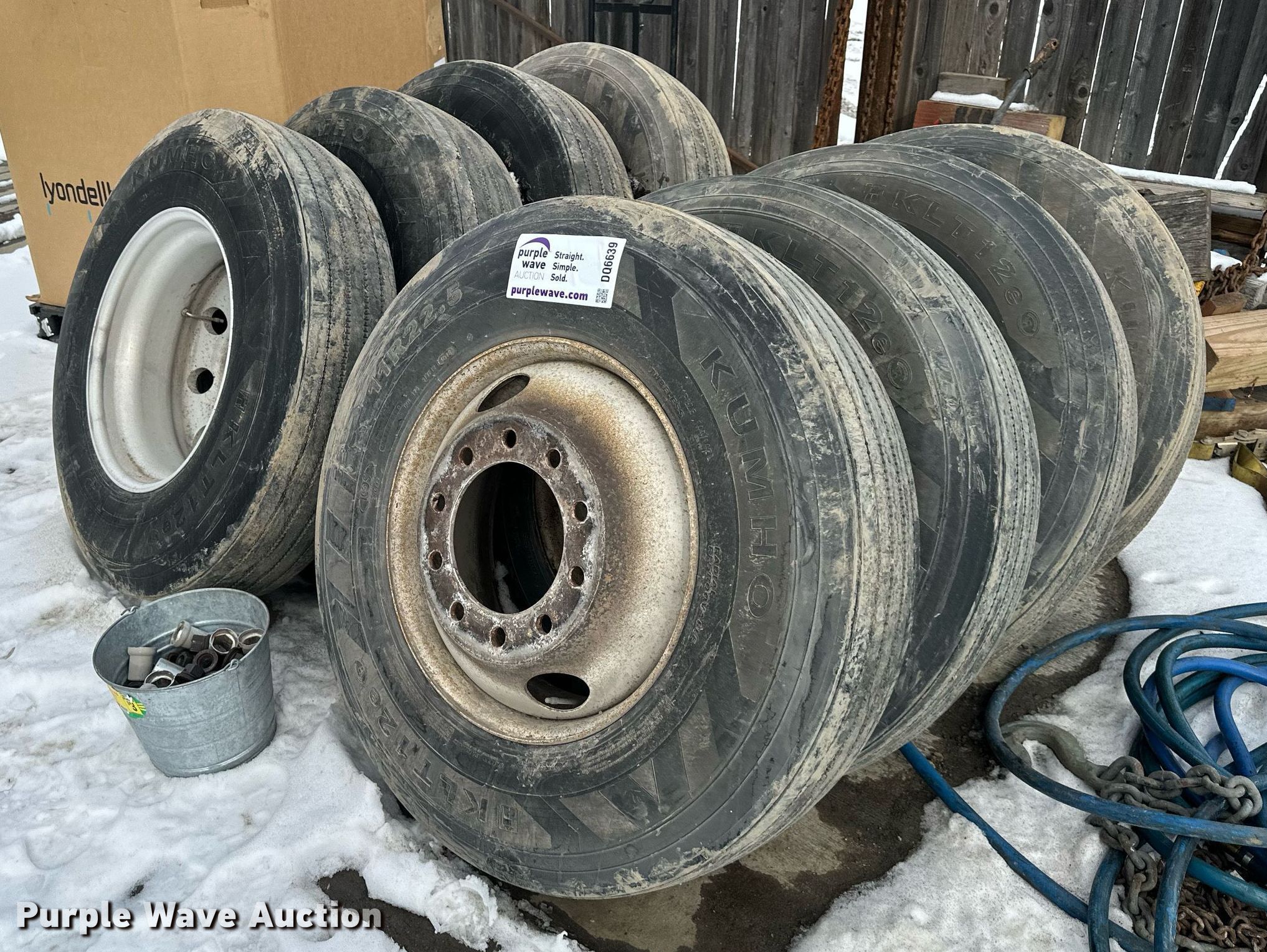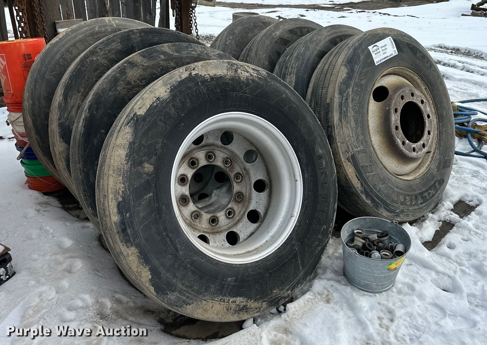 Purple Wave is selling a used Fleet Tires in Kansas. This item is a (8) Kumbo 11R22.5 tires and wheels with the following: (4) Aluminum wheels, (4) Steel wheels