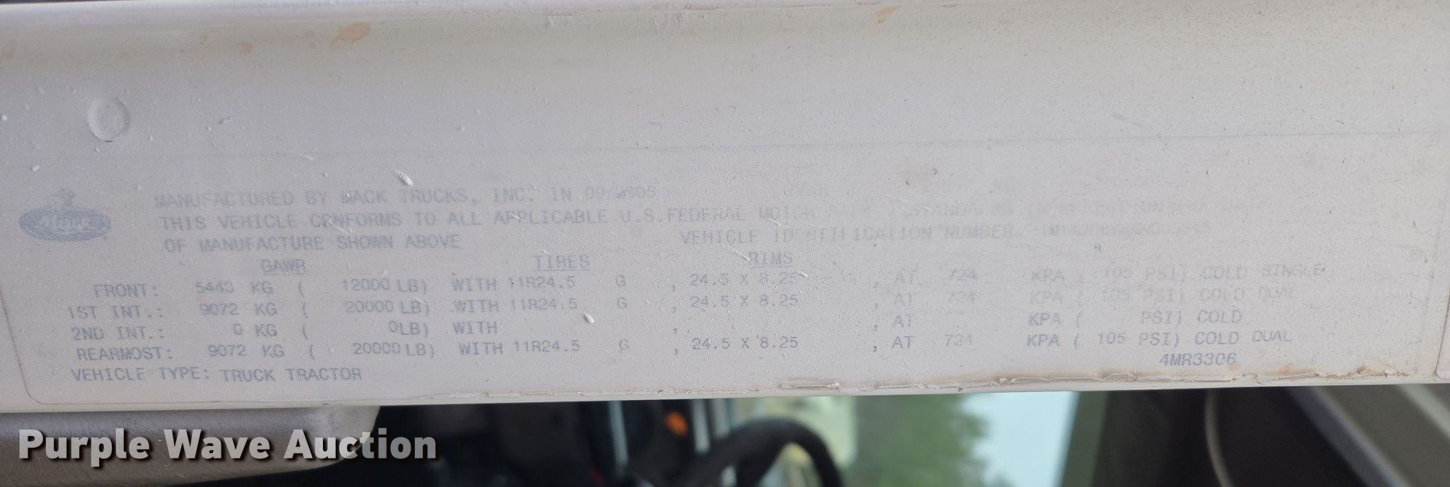 Purple Wave is selling a used Truck Tractor in Alabama. This item is a 2006 Mack CHN613 semi truck with the following: Miles: 504,953 on odometer, Hours: 24,972 on meter, VIN: 1M1AJ06Y86N005845