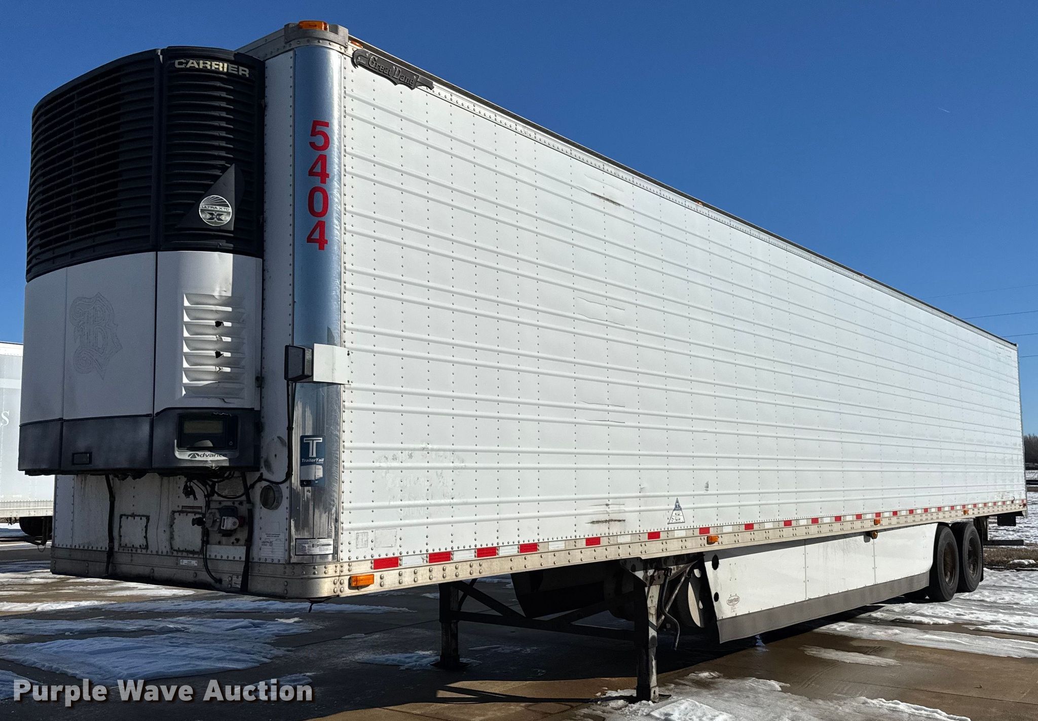 2006 Great Dane refrigerated van trailer. VIN: 1GRAA06226W700365, Unit #: 5404. Dimensions Overall: 54' 10" L x 102" W, Body: 53' L x 102" W. Features Deck type: Aluminum, Refrigeration unit Carrier Ultra XTC X Series, Hours: 18,572. Chassis Landing gear: Dual, Suspension: Air, Brakes: Air, Axles: Tandem Sliding, GVWR: 68,000 lbs. Tires Steel wheels, Size: 295/75R22.5. Minnesota title. Title distribution may be delayed up to 14 days from verification of funds. Doug Bradley Trucking Inc.. Salina, KS 67401