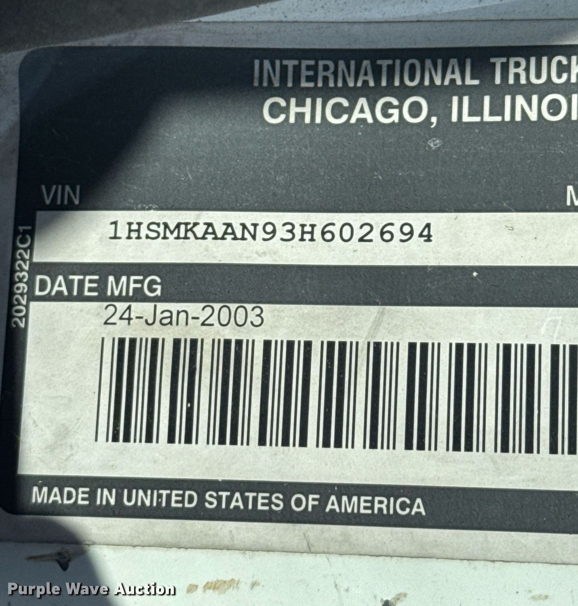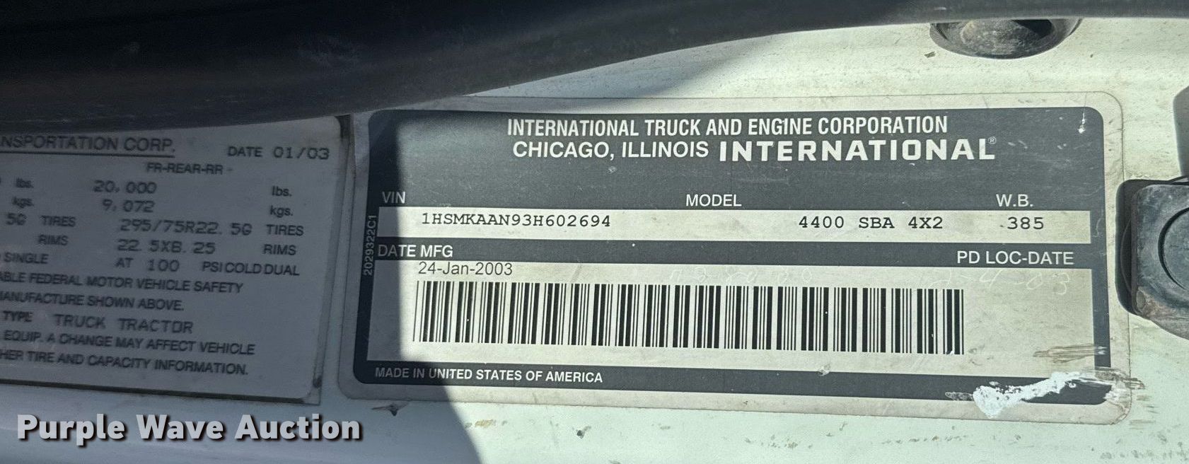 Purple Wave is selling a used Truck Tractor in Kansas. This item is a 2003 International 4400 semi truck with the following: Kilometers: 458,152 on odometer, Actual mileage unknown, VIN: 1HSMKAAN93H602694