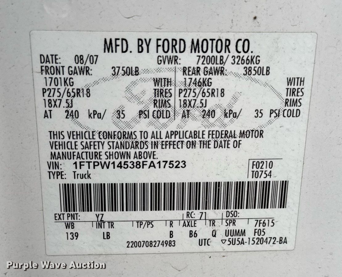 - VIN: 1FTPW14538FA17523