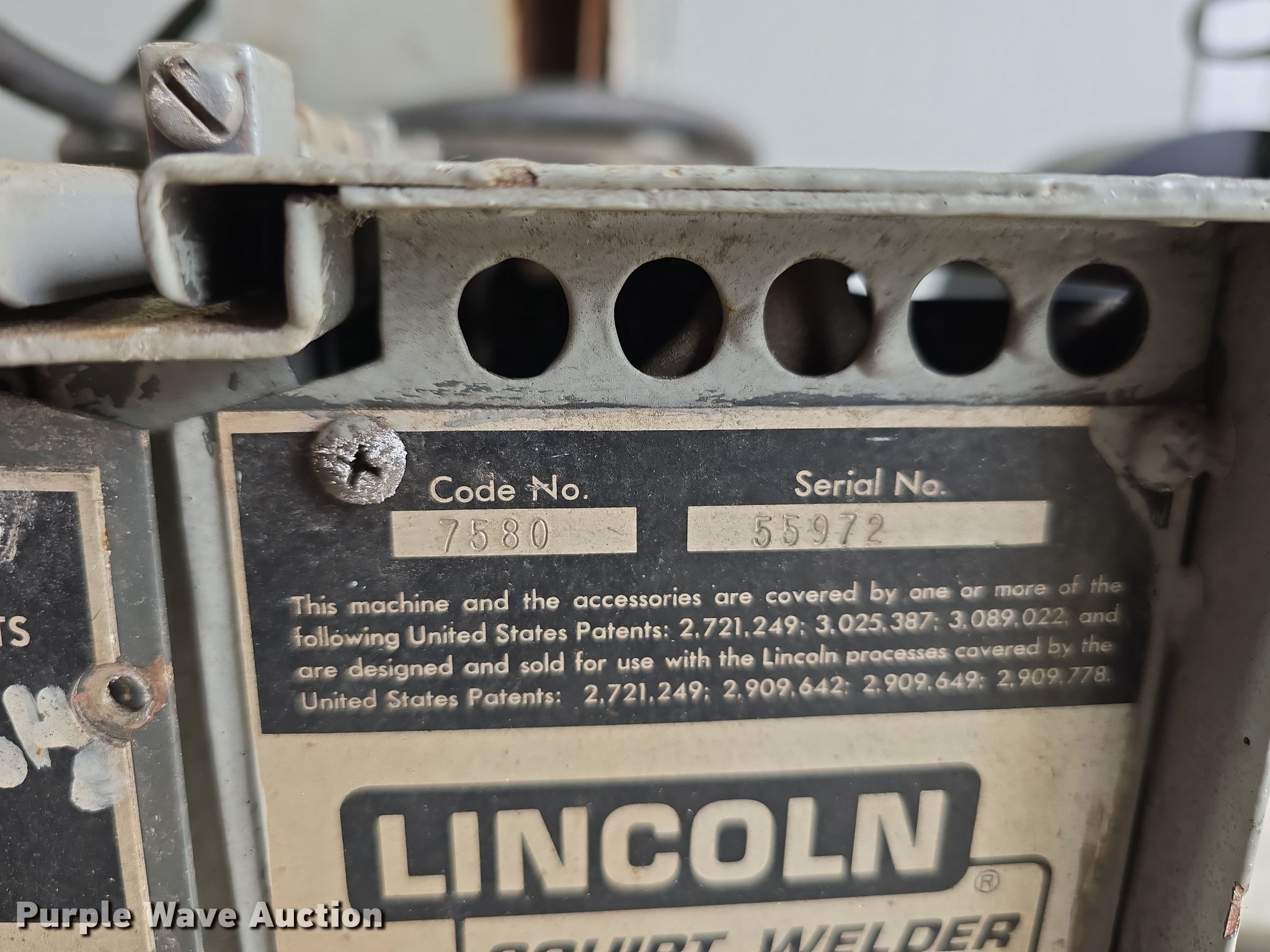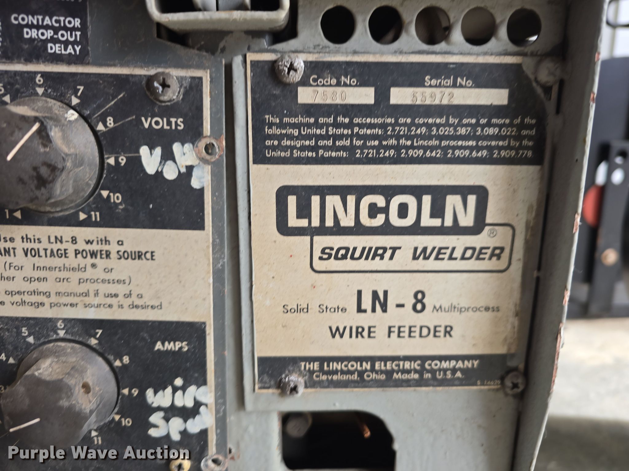 1974 Lincoln Idealarc DC-600 welder. Serial: AC734714. Electric Motor Volts: 220, Phase: Three. Features Welder Capabilities: CC, CV, DC, Wire, MIG, Stick, Wire feeder Lincoln Squirt Welder LN-8, Serial: 55972, (2) wire holders. Midwest Machinery Co.. Omaha, NE 68122