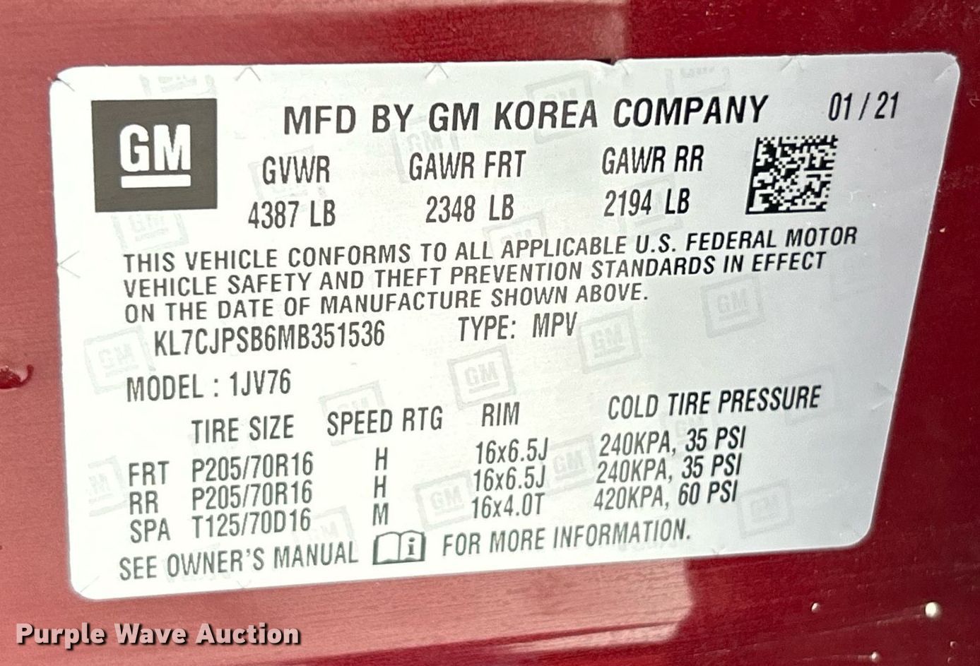 Purple Wave is selling a used Passenger Vehicle in Missouri. This item is a 2021 Chevrolet Trax SUV with the following: Miles: 34,013 on odometer, Miles or hours may vary, unit still in use, VIN: KL7CJPSB6MB351536