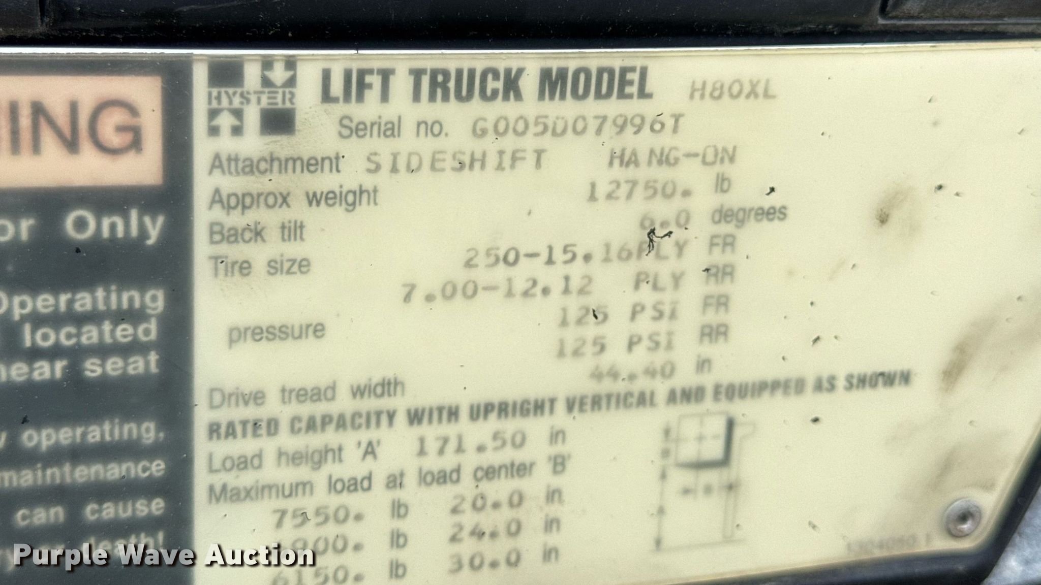Purple Wave is selling a used Warehouse Forklift in Missouri. This item is a 1996 Hyster H80XL forklift with the following: Hours: 1,947 on meter, Serial: G005D07996T