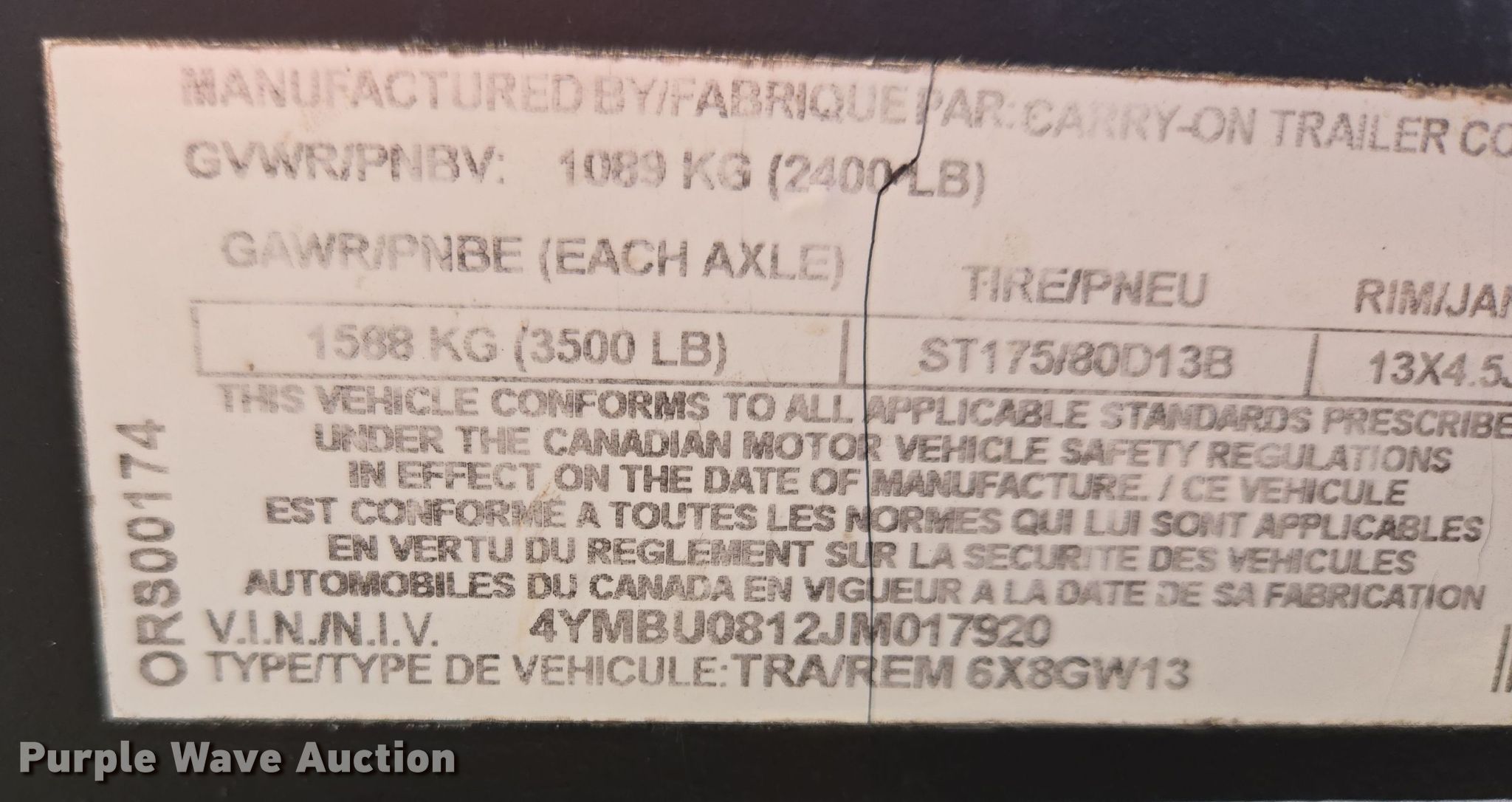 Purple Wave is selling a used Car or Utility Trailer in Missouri. This item is a 2018 Carry-On Trailer utility trailer with the following: VIN: 4YMBU0812JM017920